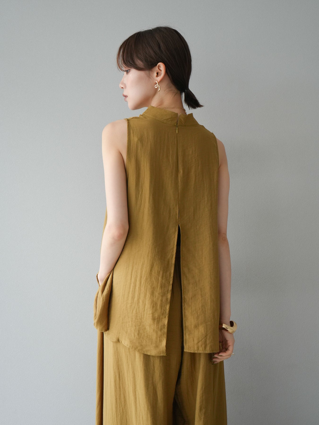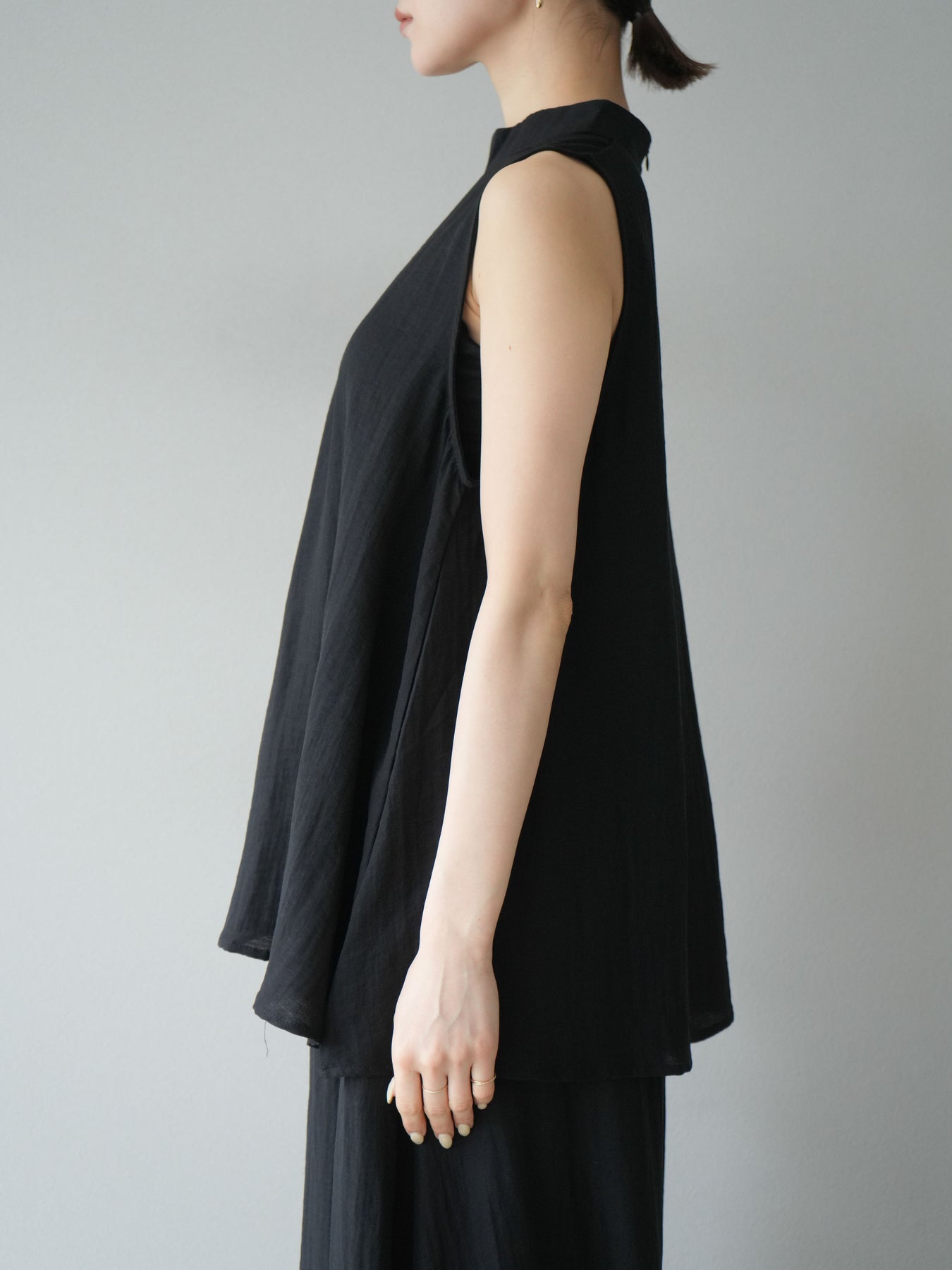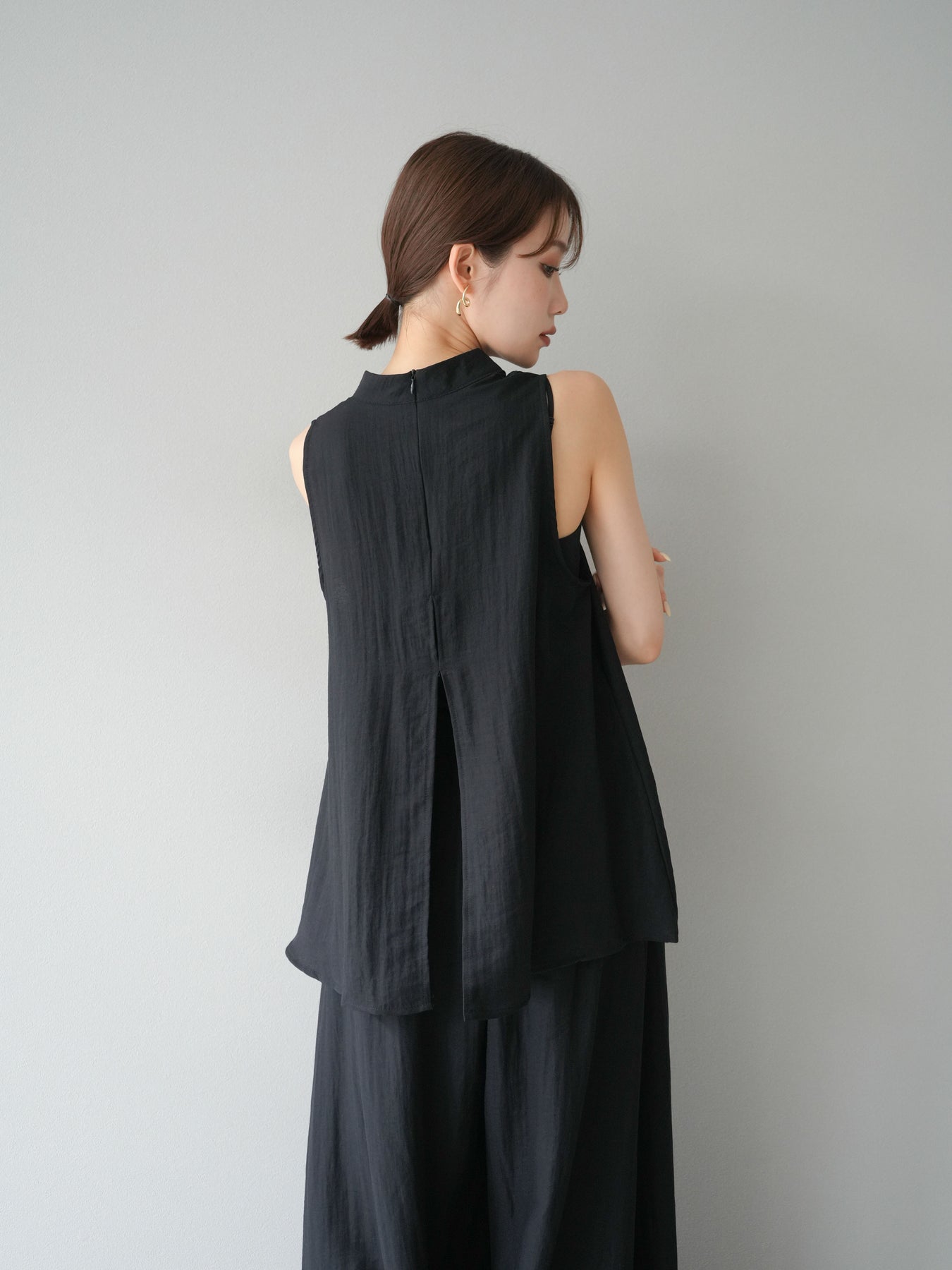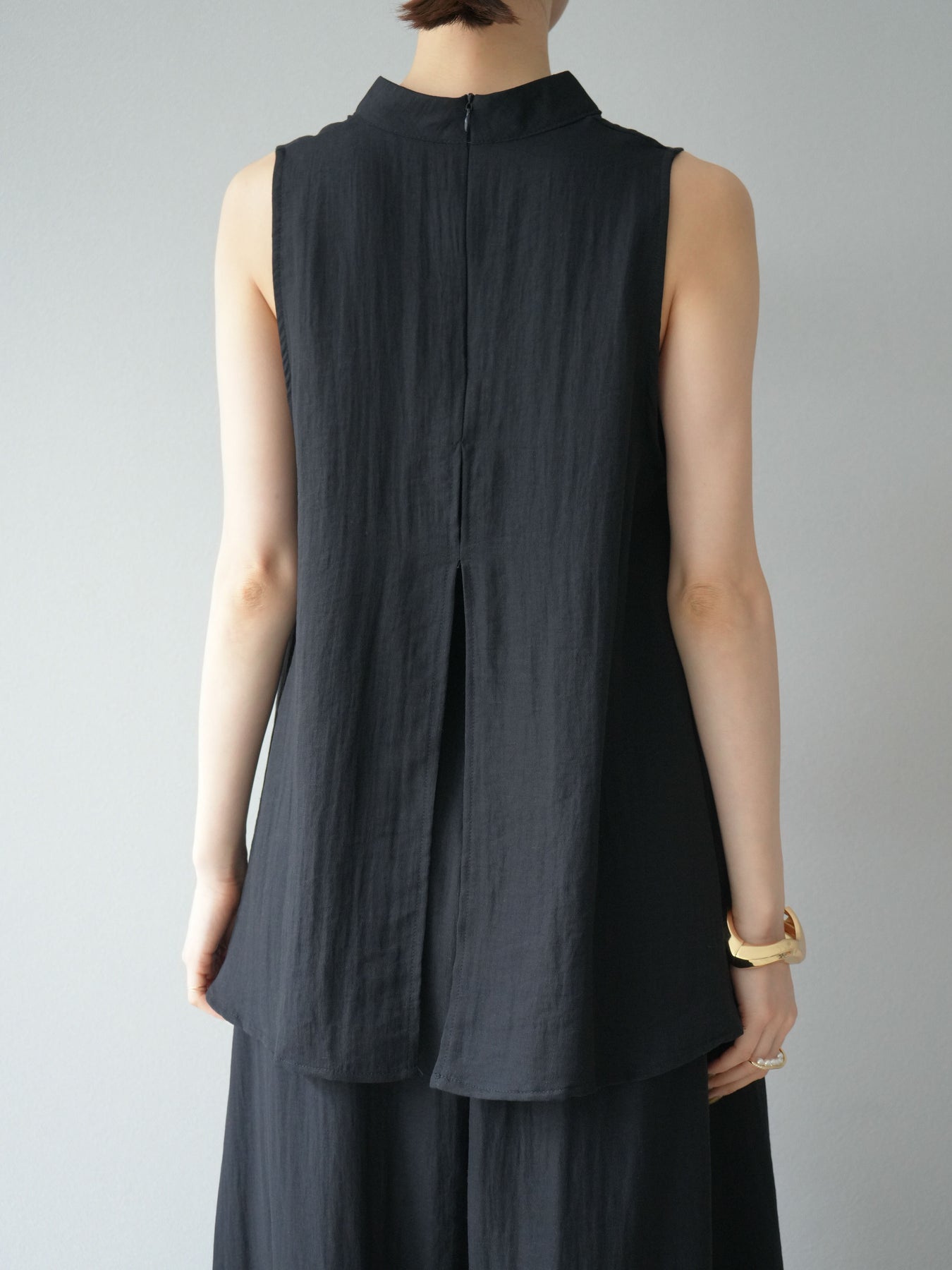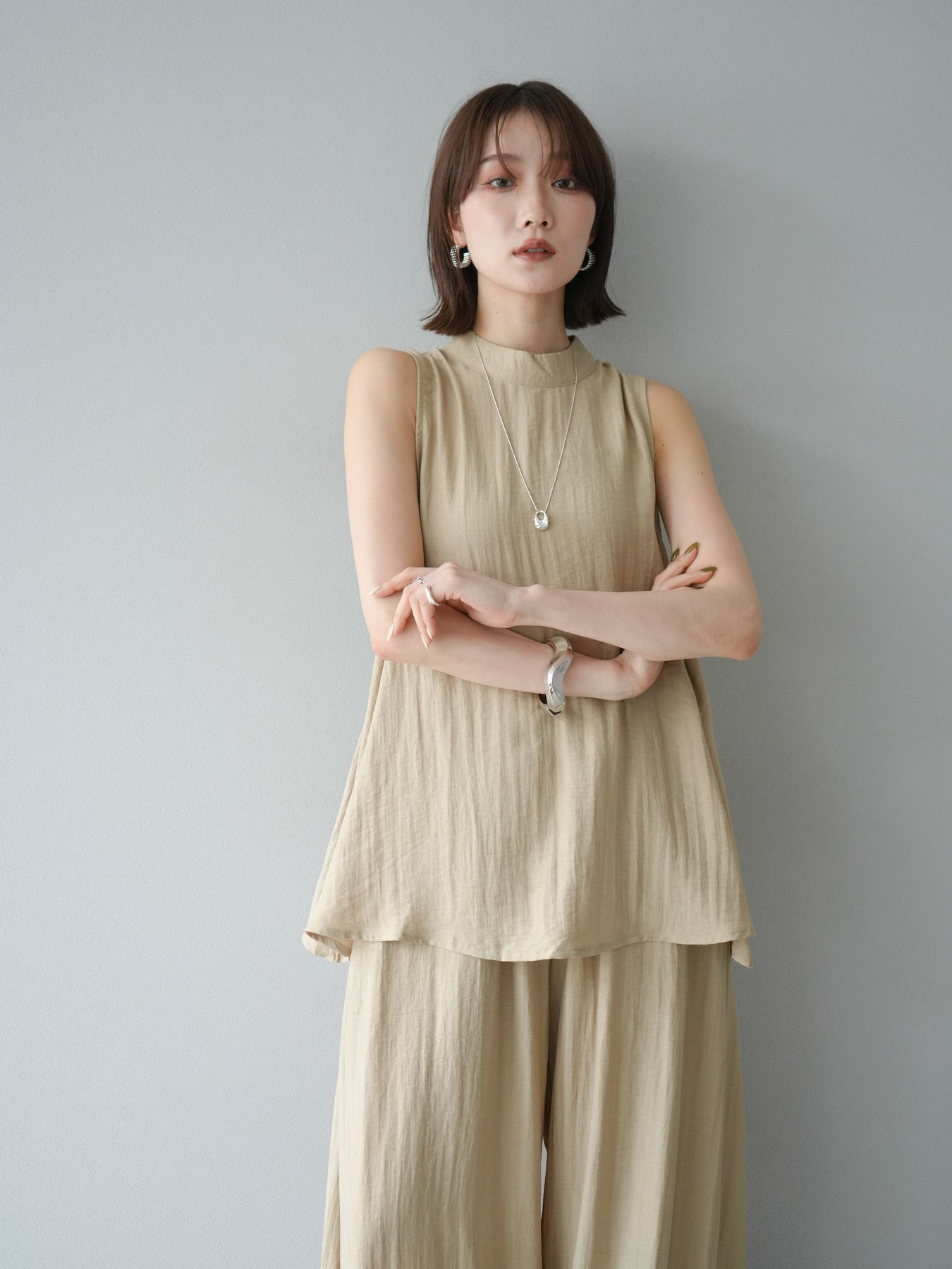 ふんわりと広がるAラインシルエットが魅力のノースリーブブラウスと、リラクシーな着心地のスーパーワイドパンツのセットアップ。程よい落ち感のある生地で動くたびに柔らかな揺れ感を演出し、品のある印象に。ブラウスは首元をさりげなくカバーするスタンドカラーデザインで、上品さと抜け感のバランスが絶妙です。パンツはウエストゴム仕様でストレスフリーな着用感に仕上げています。セットではもちろん、単品使いでも幅広く活躍するアイテムです。 ※ボトムス、キャミソール(インナー)以外の商品は一律でインナーは付属していません。