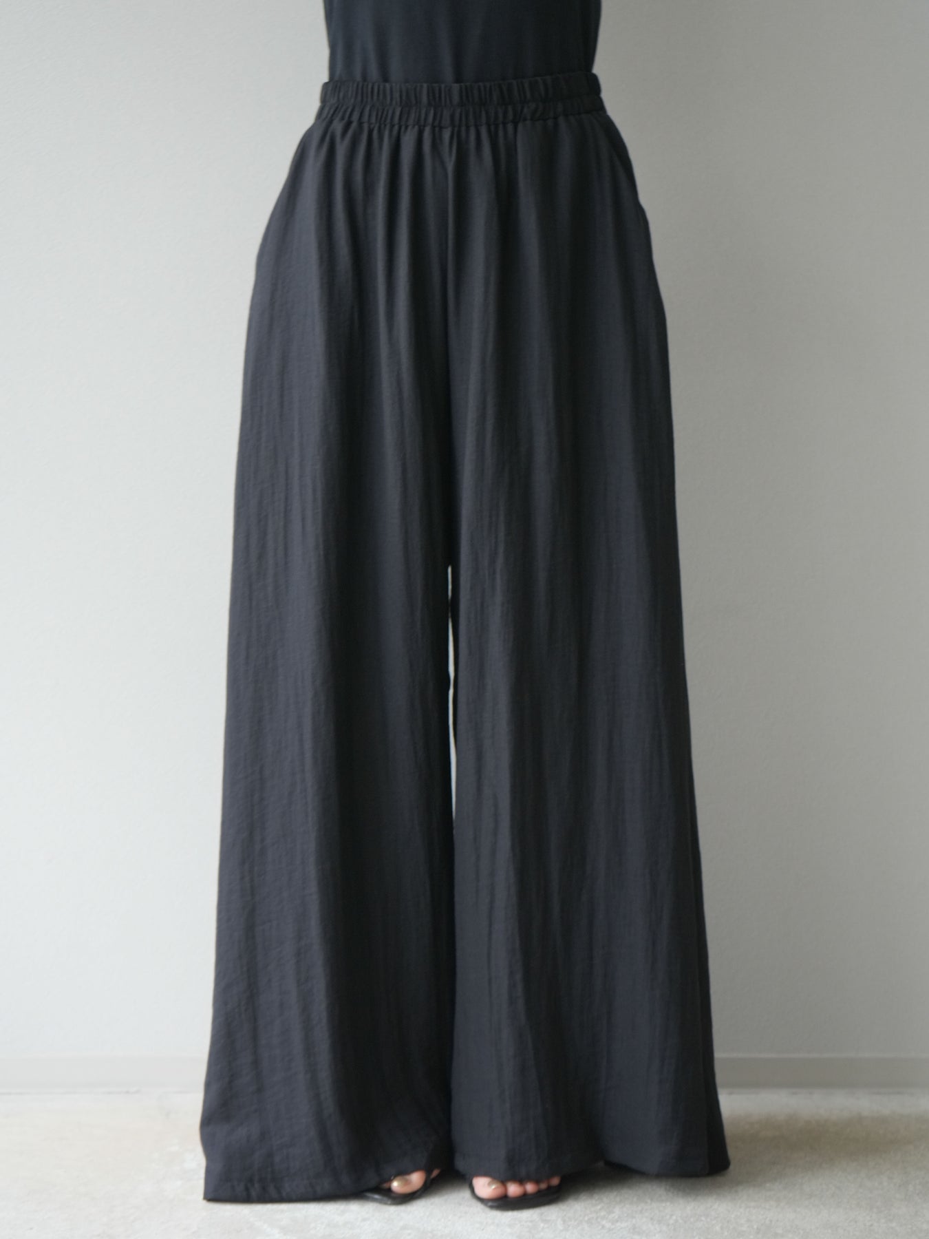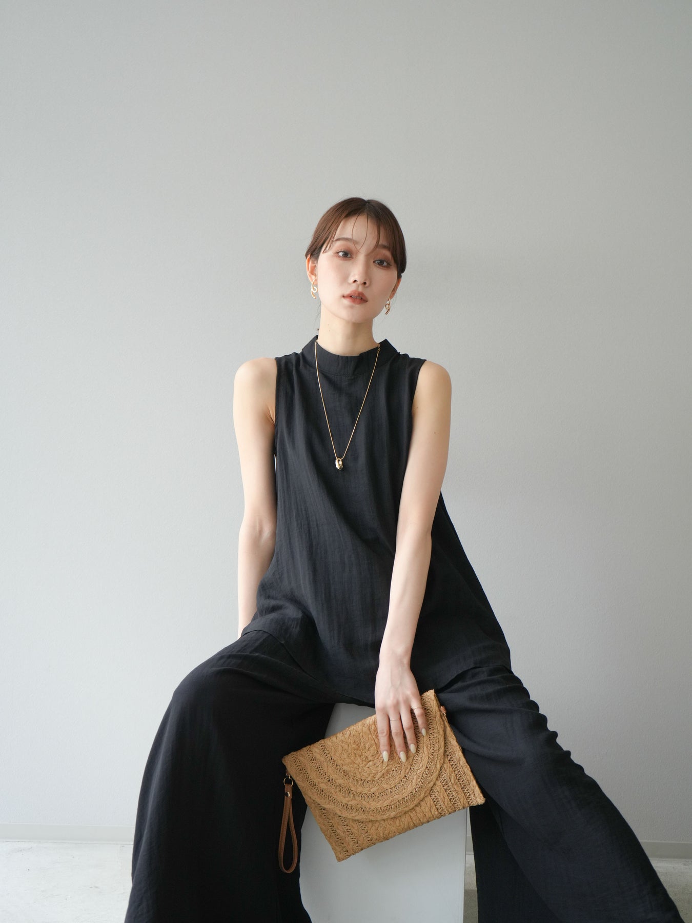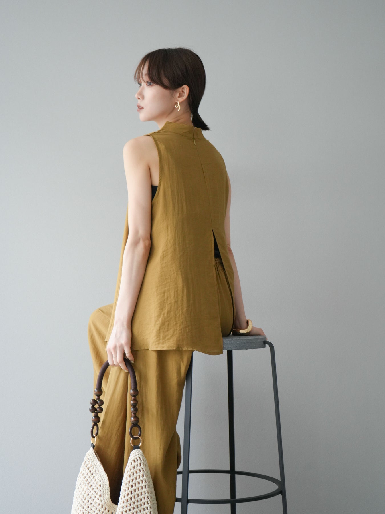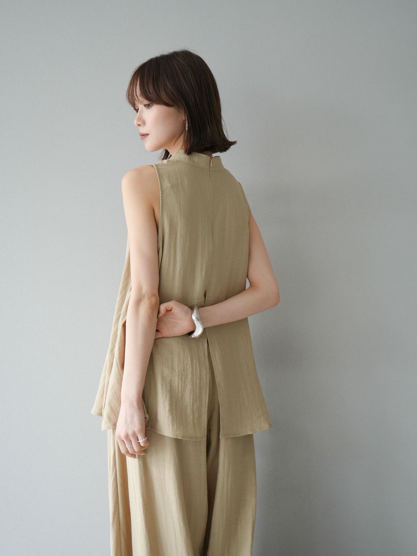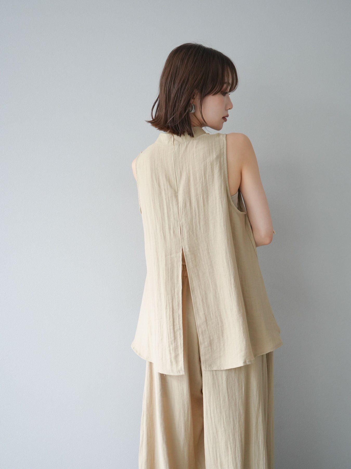 ふんわりと広がるAラインシルエットが魅力のノースリーブブラウスと、リラクシーな着心地のスーパーワイドパンツのセットアップ。程よい落ち感のある生地で動くたびに柔らかな揺れ感を演出し、品のある印象に。ブラウスは首元をさりげなくカバーするスタンドカラーデザインで、上品さと抜け感のバランスが絶妙です。パンツはウエストゴム仕様でストレスフリーな着用感に仕上げています。セットではもちろん、単品使いでも幅広く活躍するアイテムです。 ※ボトムス、キャミソール(インナー)以外の商品は一律でインナーは付属していません。