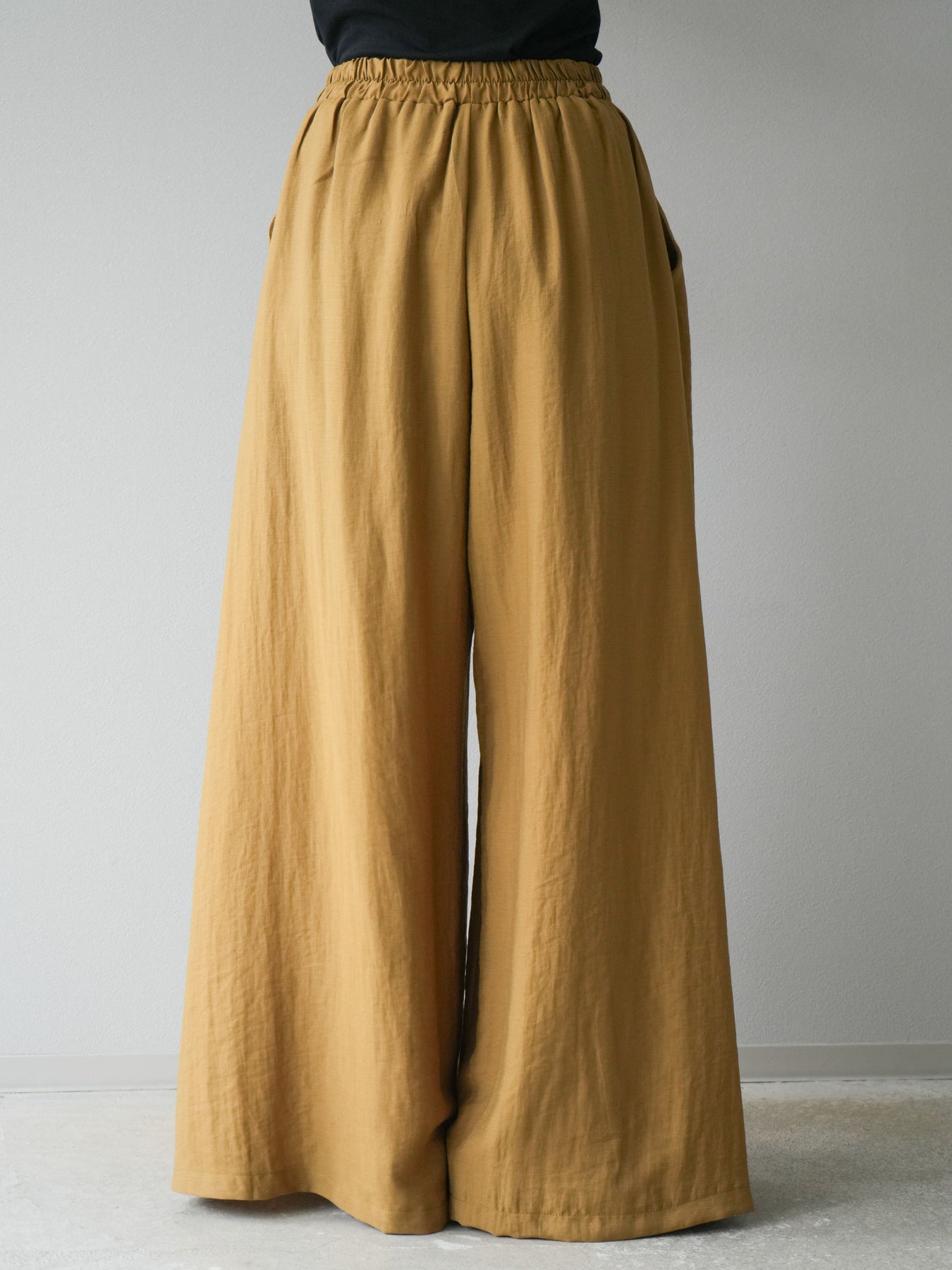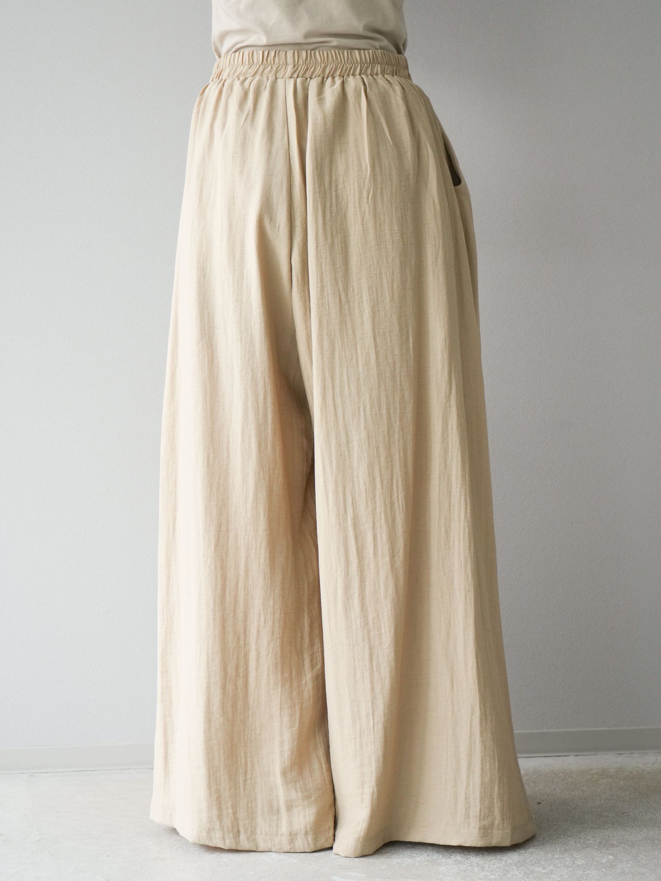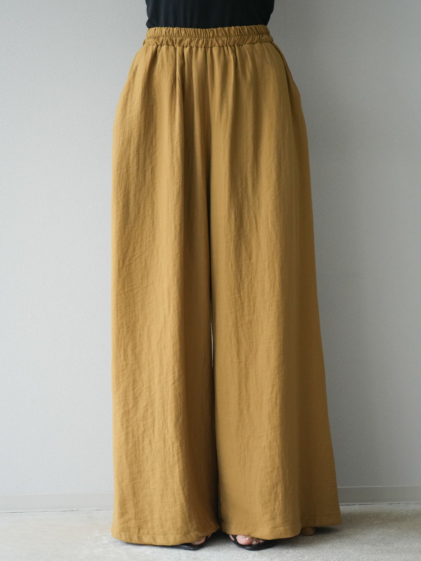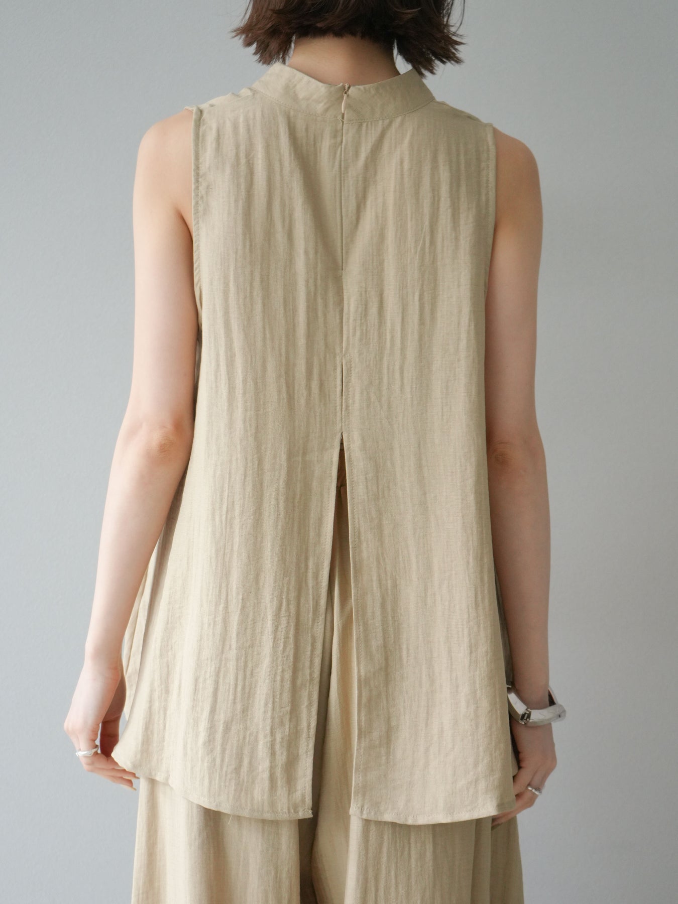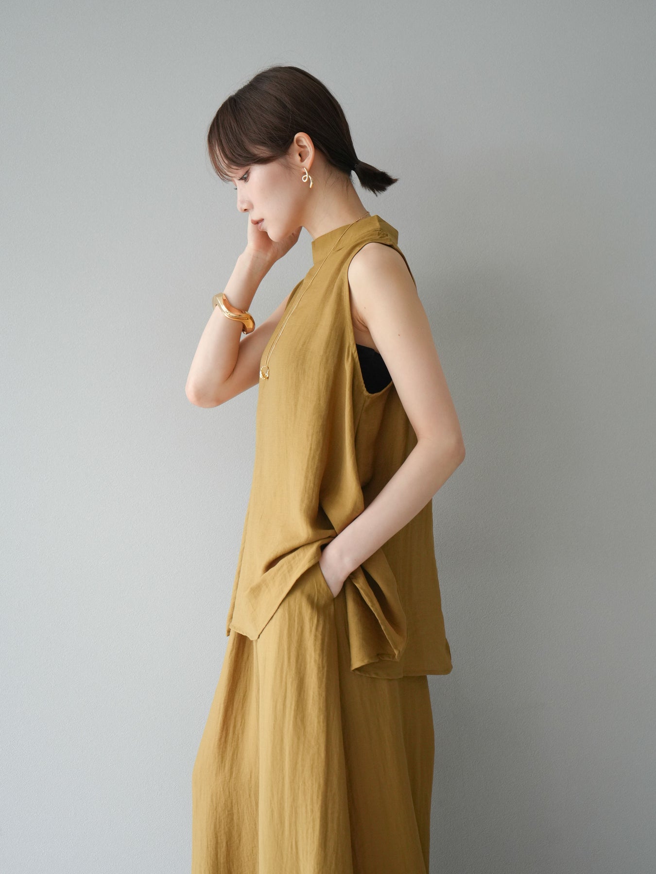 ふんわりと広がるAラインシルエットが魅力のノースリーブブラウスと、リラクシーな着心地のスーパーワイドパンツのセットアップ。程よい落ち感のある生地で動くたびに柔らかな揺れ感を演出し、品のある印象に。ブラウスは首元をさりげなくカバーするスタンドカラーデザインで、上品さと抜け感のバランスが絶妙です。パンツはウエストゴム仕様でストレスフリーな着用感に仕上げています。セットではもちろん、単品使いでも幅広く活躍するアイテムです。 ※ボトムス、キャミソール(インナー)以外の商品は一律でインナーは付属していません。