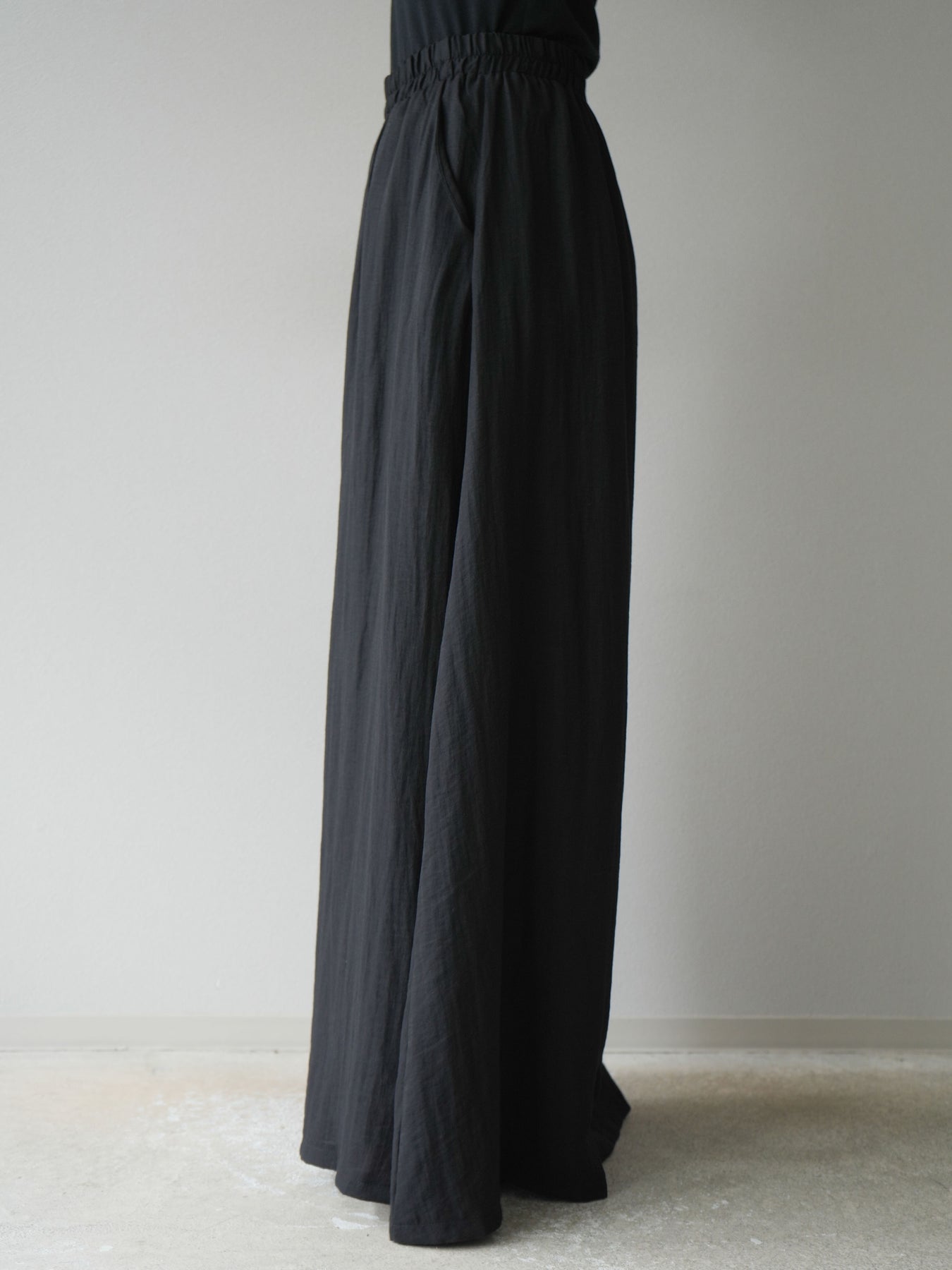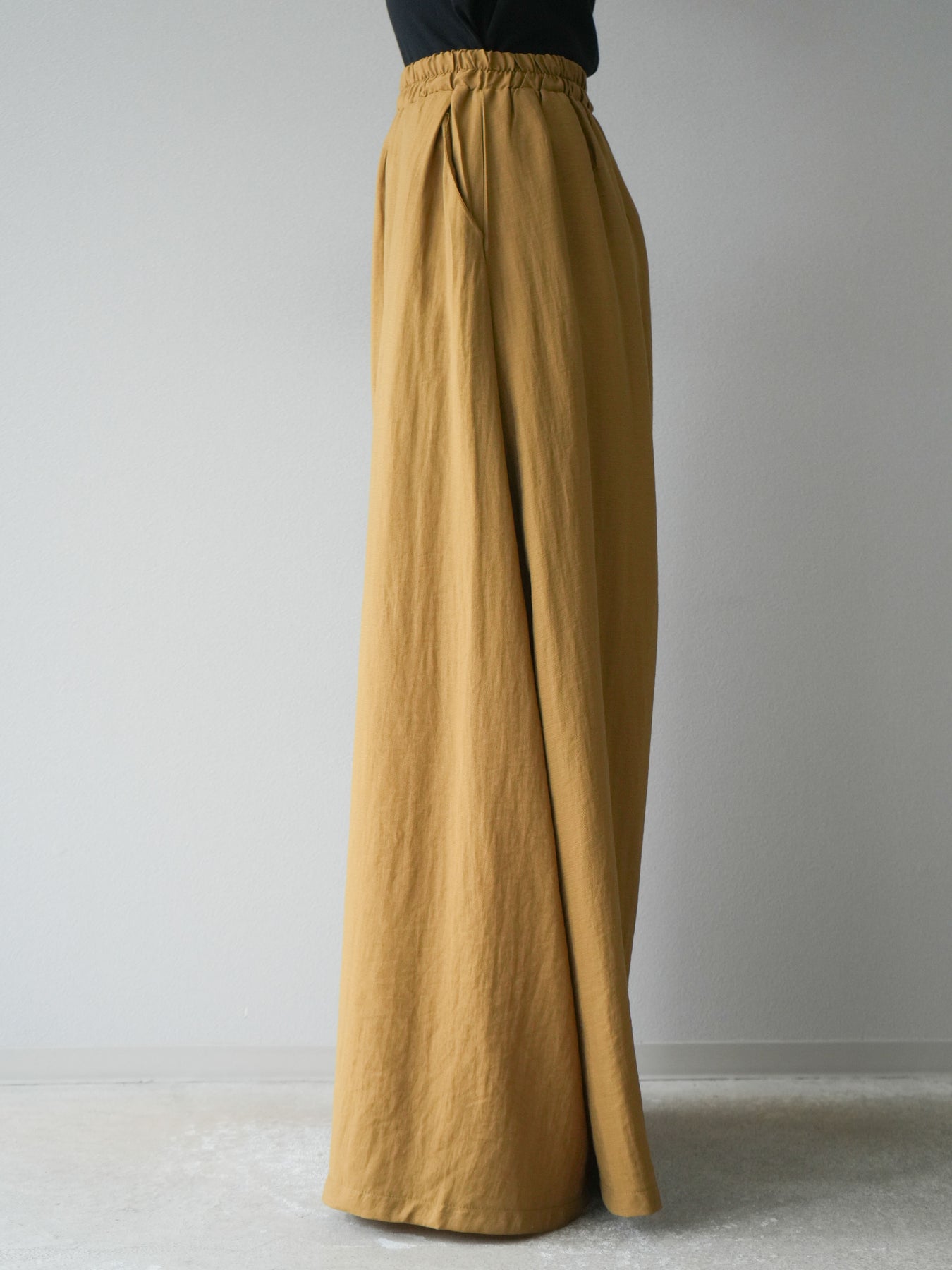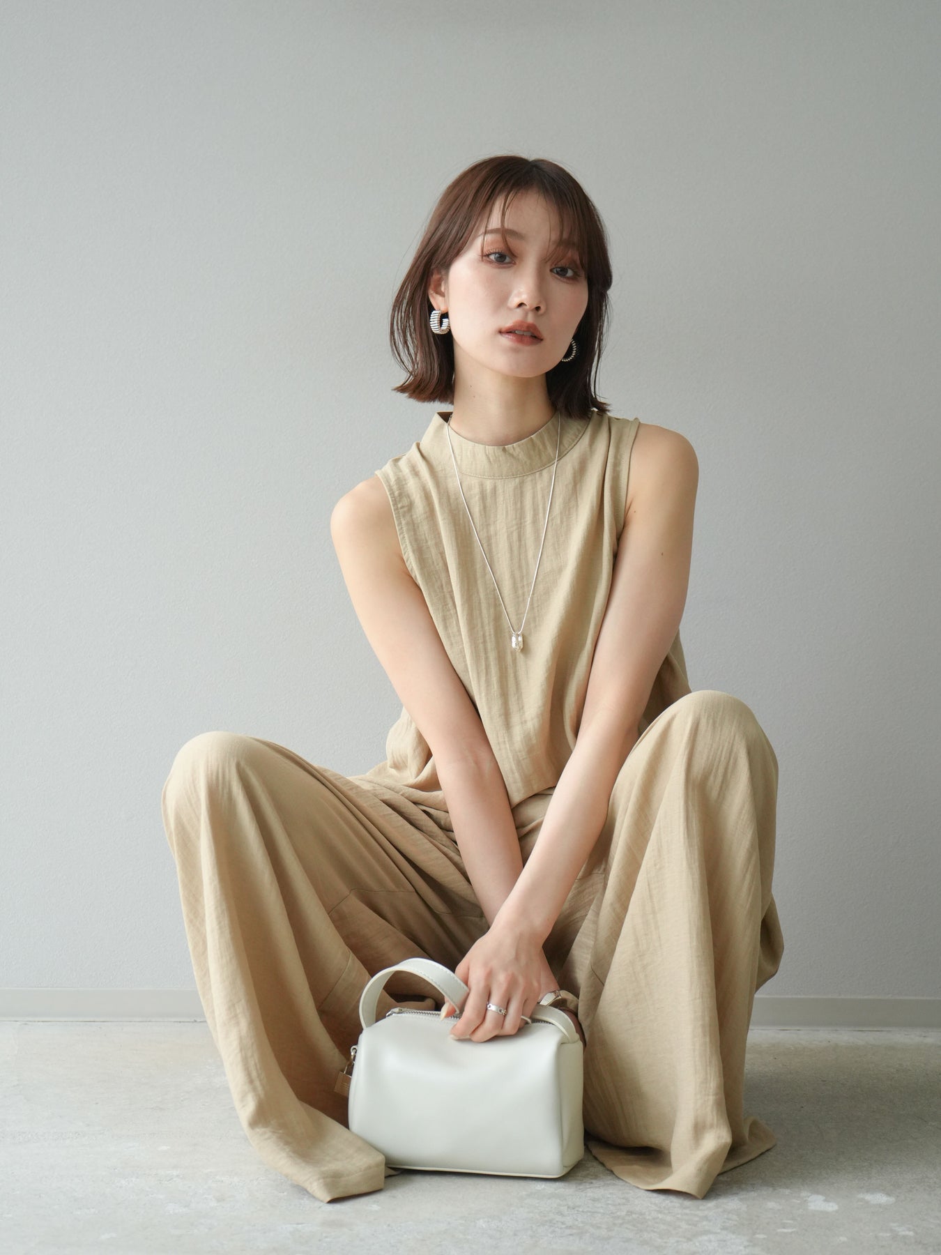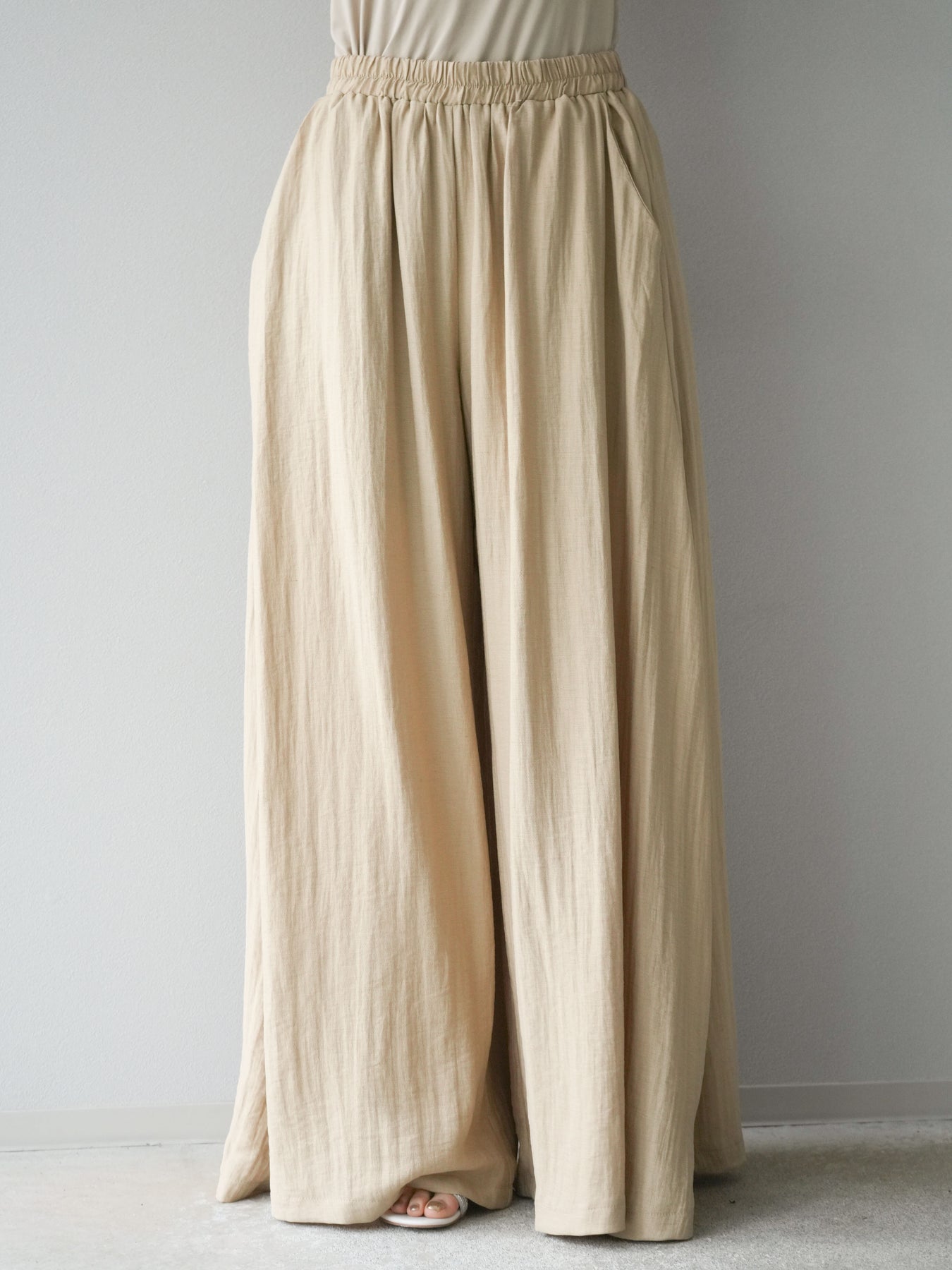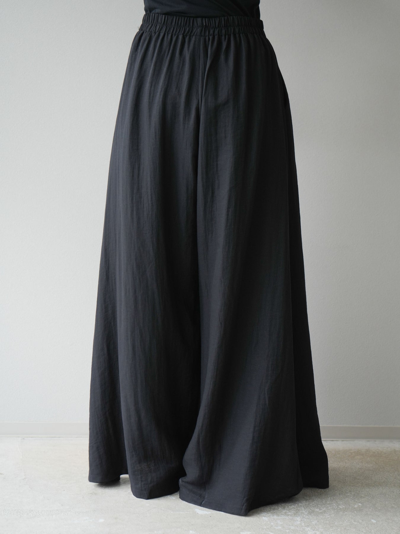 ふんわりと広がるAラインシルエットが魅力のノースリーブブラウスと、リラクシーな着心地のスーパーワイドパンツのセットアップ。程よい落ち感のある生地で動くたびに柔らかな揺れ感を演出し、品のある印象に。ブラウスは首元をさりげなくカバーするスタンドカラーデザインで、上品さと抜け感のバランスが絶妙です。パンツはウエストゴム仕様でストレスフリーな着用感に仕上げています。セットではもちろん、単品使いでも幅広く活躍するアイテムです。 ※ボトムス、キャミソール(インナー)以外の商品は一律でインナーは付属していません。