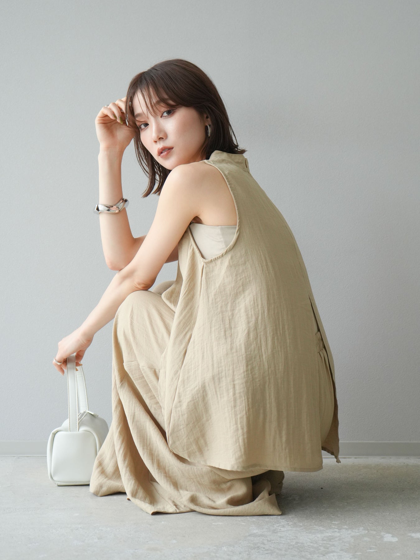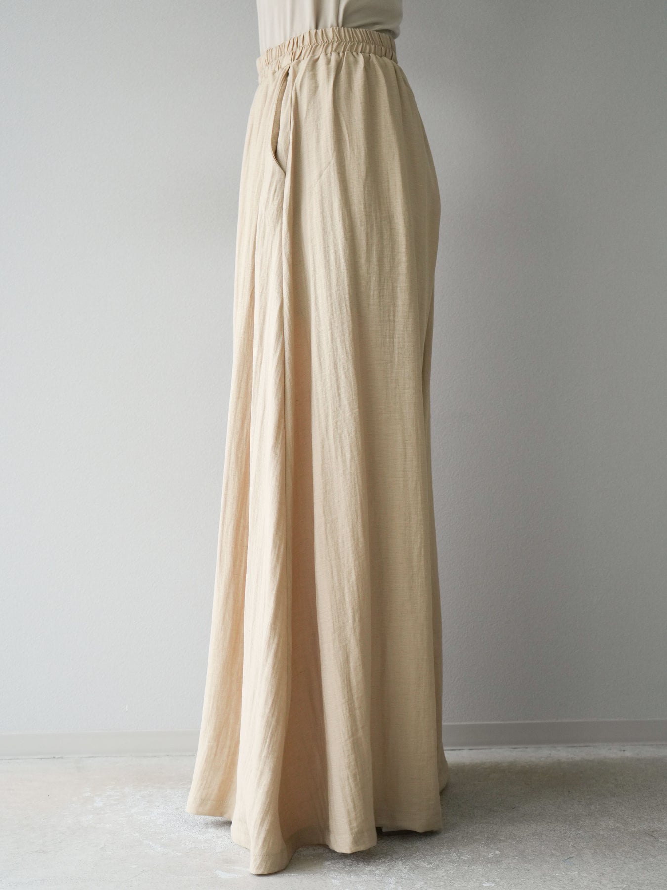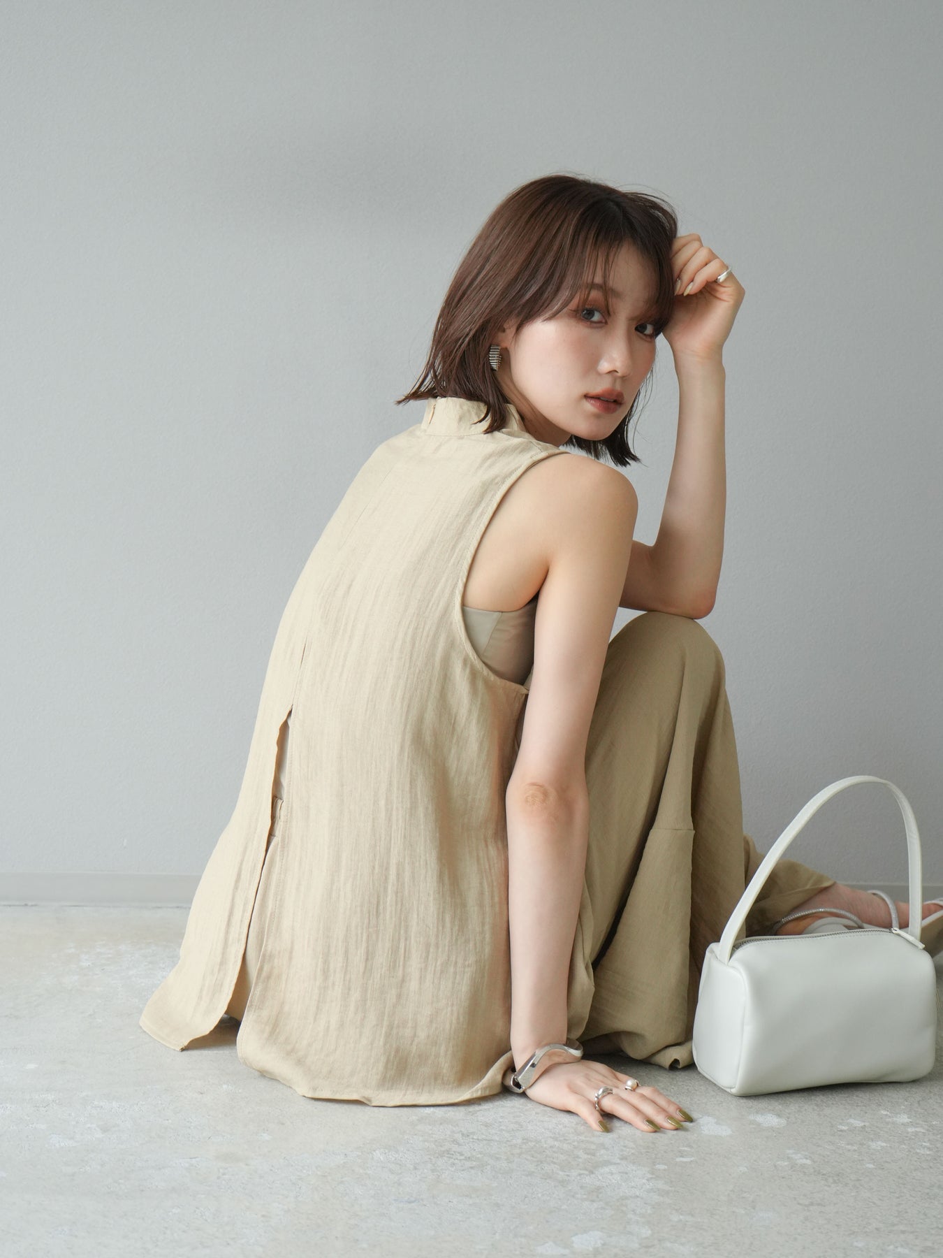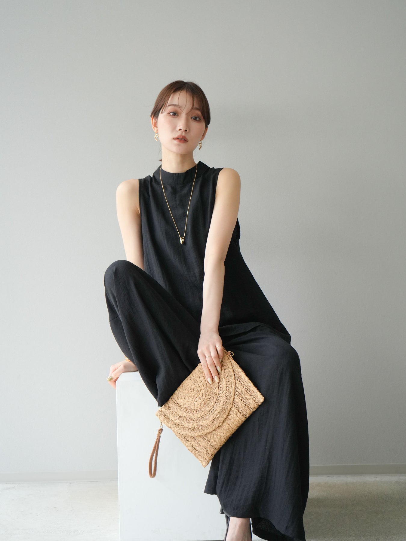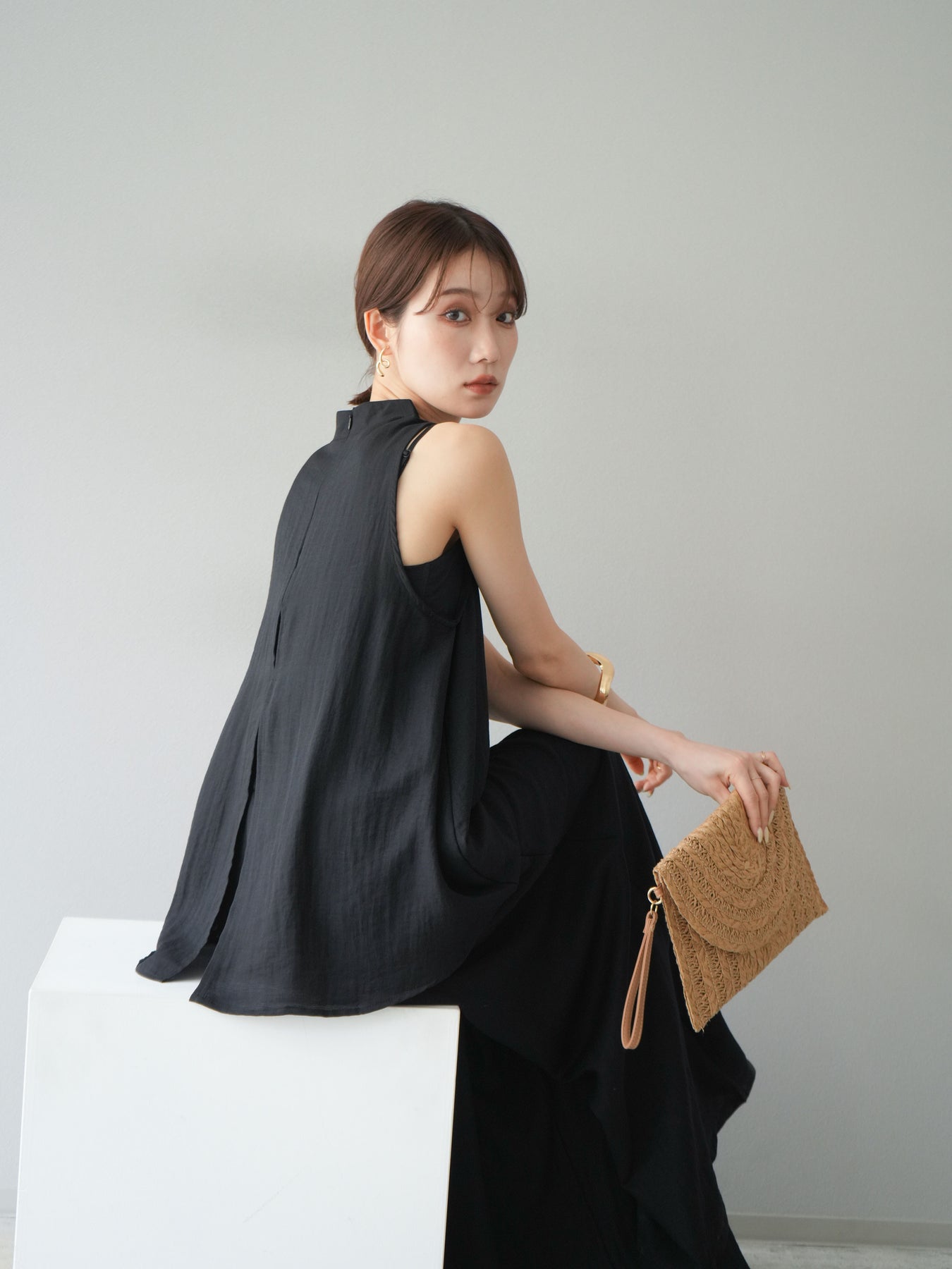ふんわりと広がるAラインシルエットが魅力のノースリーブブラウスと、リラクシーな着心地のスーパーワイドパンツのセットアップ。程よい落ち感のある生地で動くたびに柔らかな揺れ感を演出し、品のある印象に。ブラウスは首元をさりげなくカバーするスタンドカラーデザインで、上品さと抜け感のバランスが絶妙です。パンツはウエストゴム仕様でストレスフリーな着用感に仕上げています。セットではもちろん、単品使いでも幅広く活躍するアイテムです。 ※ボトムス、キャミソール(インナー)以外の商品は一律でインナーは付属していません。