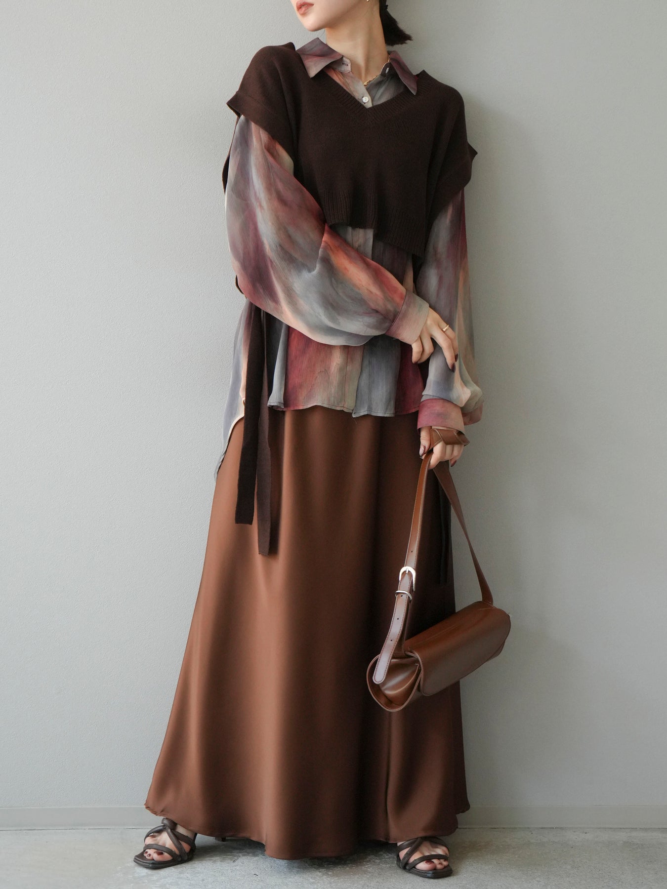 水彩タッチのニュアンス柄が印象的なシアーシャツ。 柔らかく透け感のある素材が軽やかで、コーディネートに奥行きを与えてくれます。 一枚で着映えするデザインながら、羽織りとしても使える汎用性の高い一着。 ゆったりとしたシルエットで抜け感があり、パンツにもスカートにも好相性。 スタイリングの主役として活躍するアイテムです。 ※ボトムス、キャミソール(インナー)以外の商品は一律でインナーは付属していません。