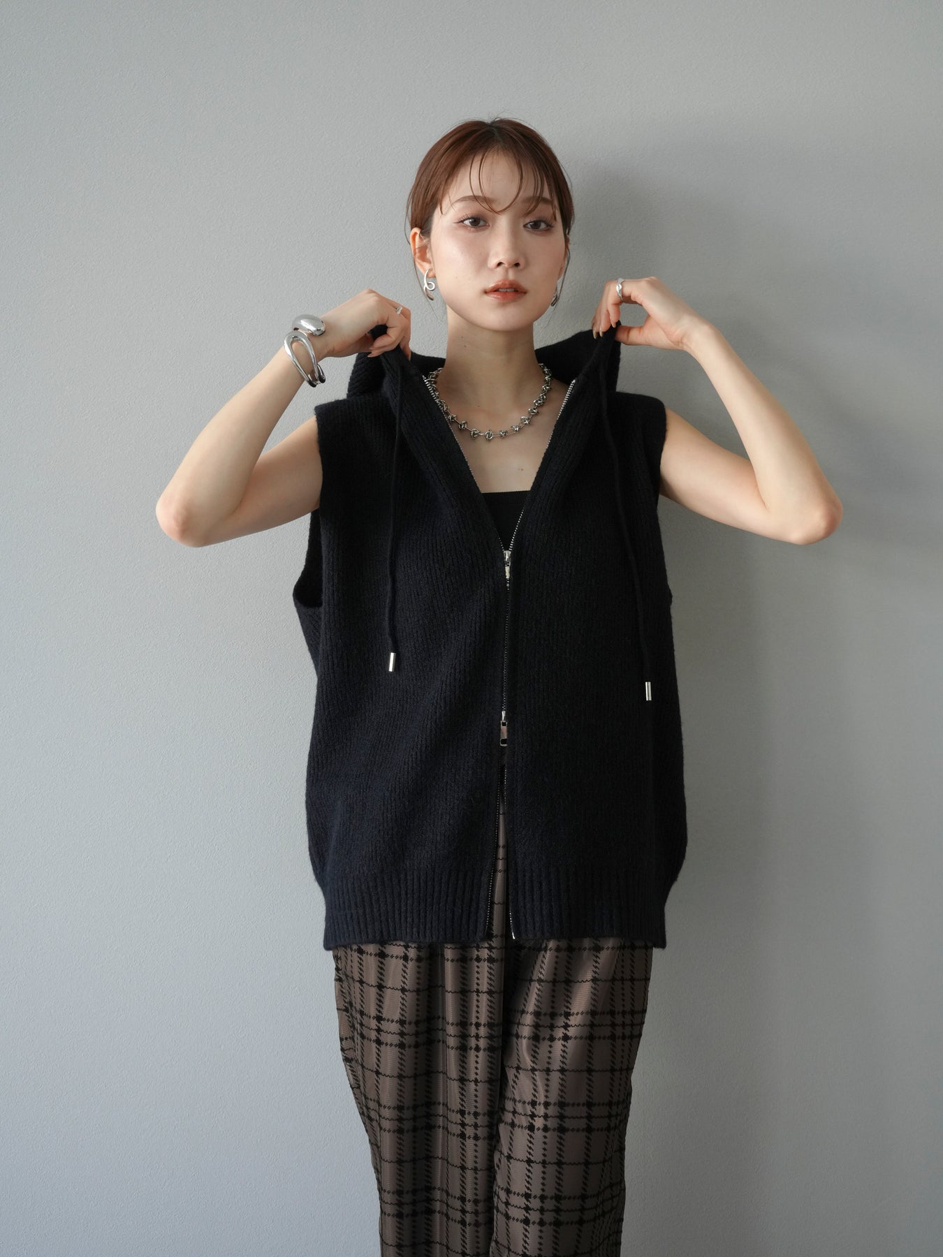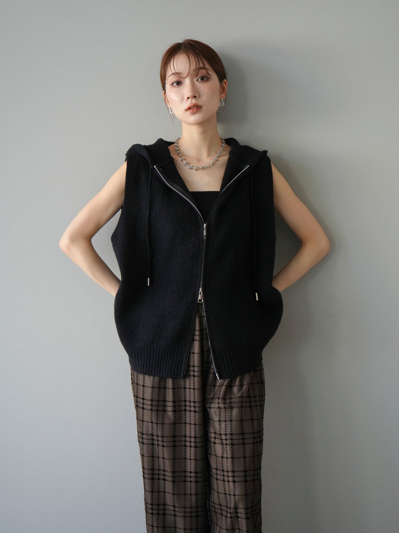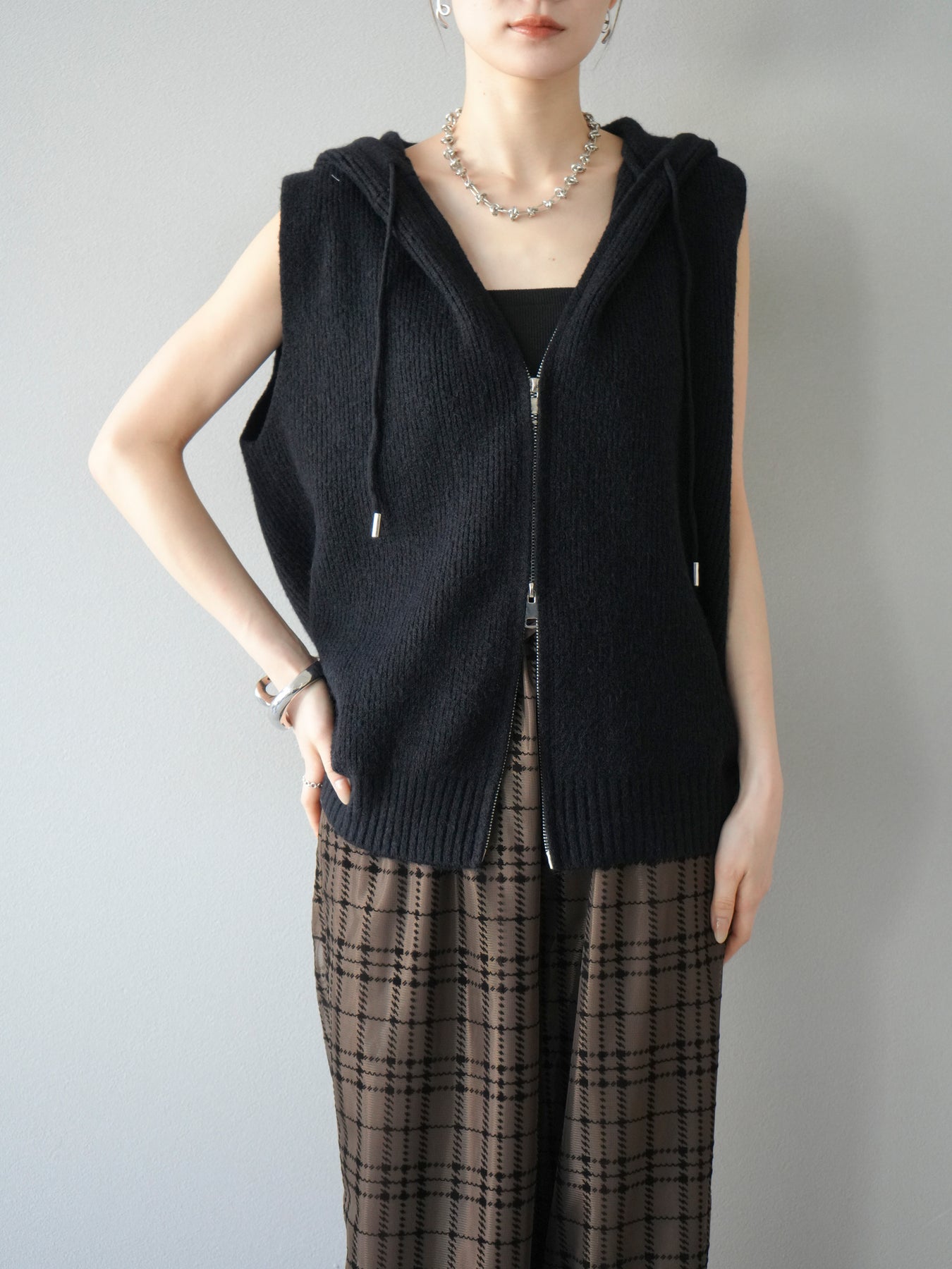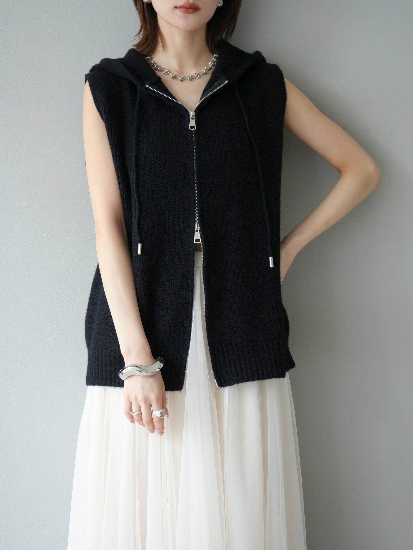 柔らかなニット素材を使用したノースリーブパーカー。フロントのジップデザインとフード付きのカジュアルなディテールが特徴で、リラックス感のある雰囲気を演出します。ノースリーブ仕様のためレイヤードがしやすく、シャツやカットソー、ワンピースとの組み合わせで幅広いスタイリングを楽しめる一着。ヒップにかかるほどの程よい丈感で、ボトムスを選ばずバランス良く着こなせます。デイリーコーデに抜け感をプラスする万能アイテムです。 ※ボトムス、キャミソール(インナー)以外の商品は一律でインナーは付属していません。