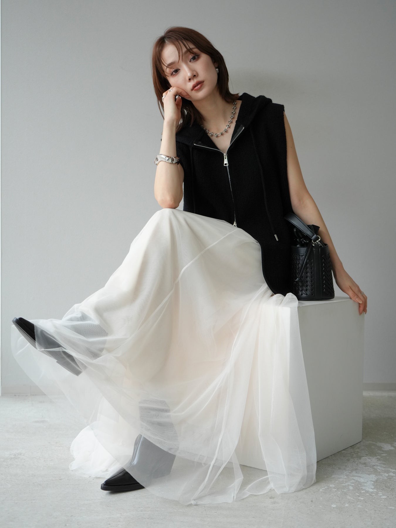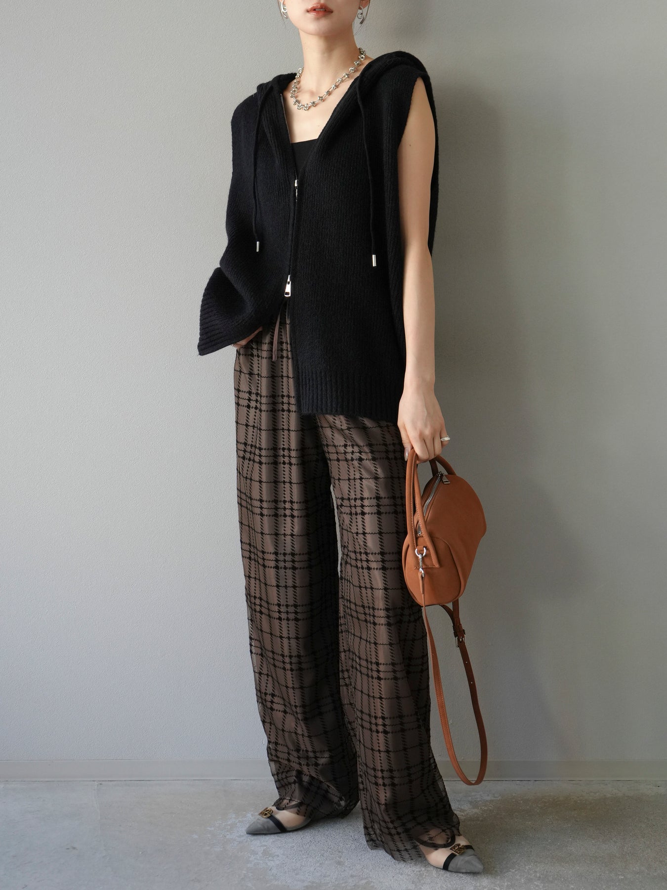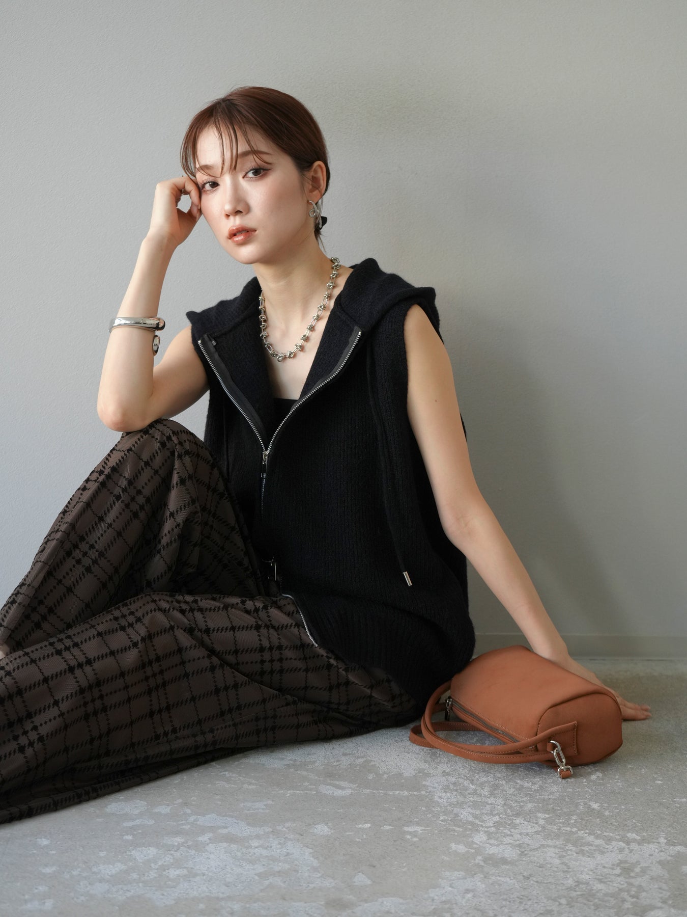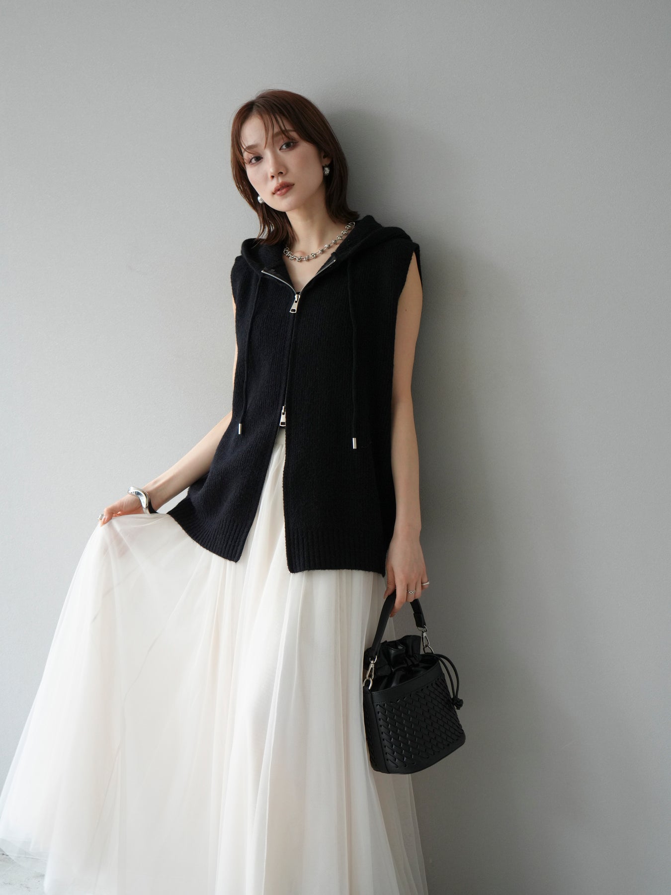 柔らかなニット素材を使用したノースリーブパーカー。フロントのジップデザインとフード付きのカジュアルなディテールが特徴で、リラックス感のある雰囲気を演出します。ノースリーブ仕様のためレイヤードがしやすく、シャツやカットソー、ワンピースとの組み合わせで幅広いスタイリングを楽しめる一着。ヒップにかかるほどの程よい丈感で、ボトムスを選ばずバランス良く着こなせます。デイリーコーデに抜け感をプラスする万能アイテムです。 ※ボトムス、キャミソール(インナー)以外の商品は一律でインナーは付属していません。
