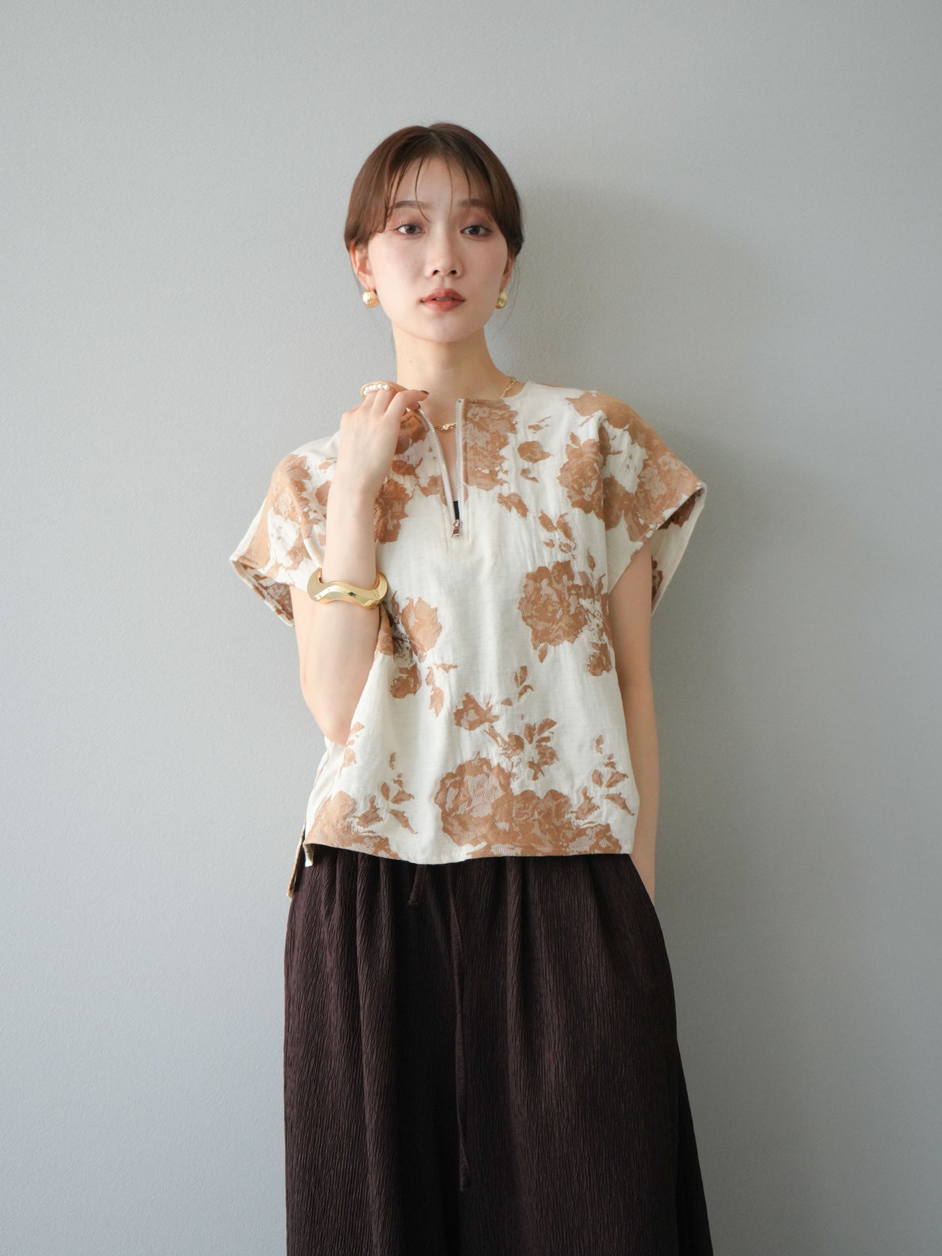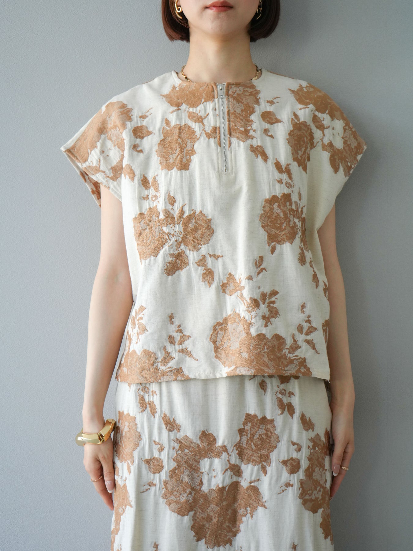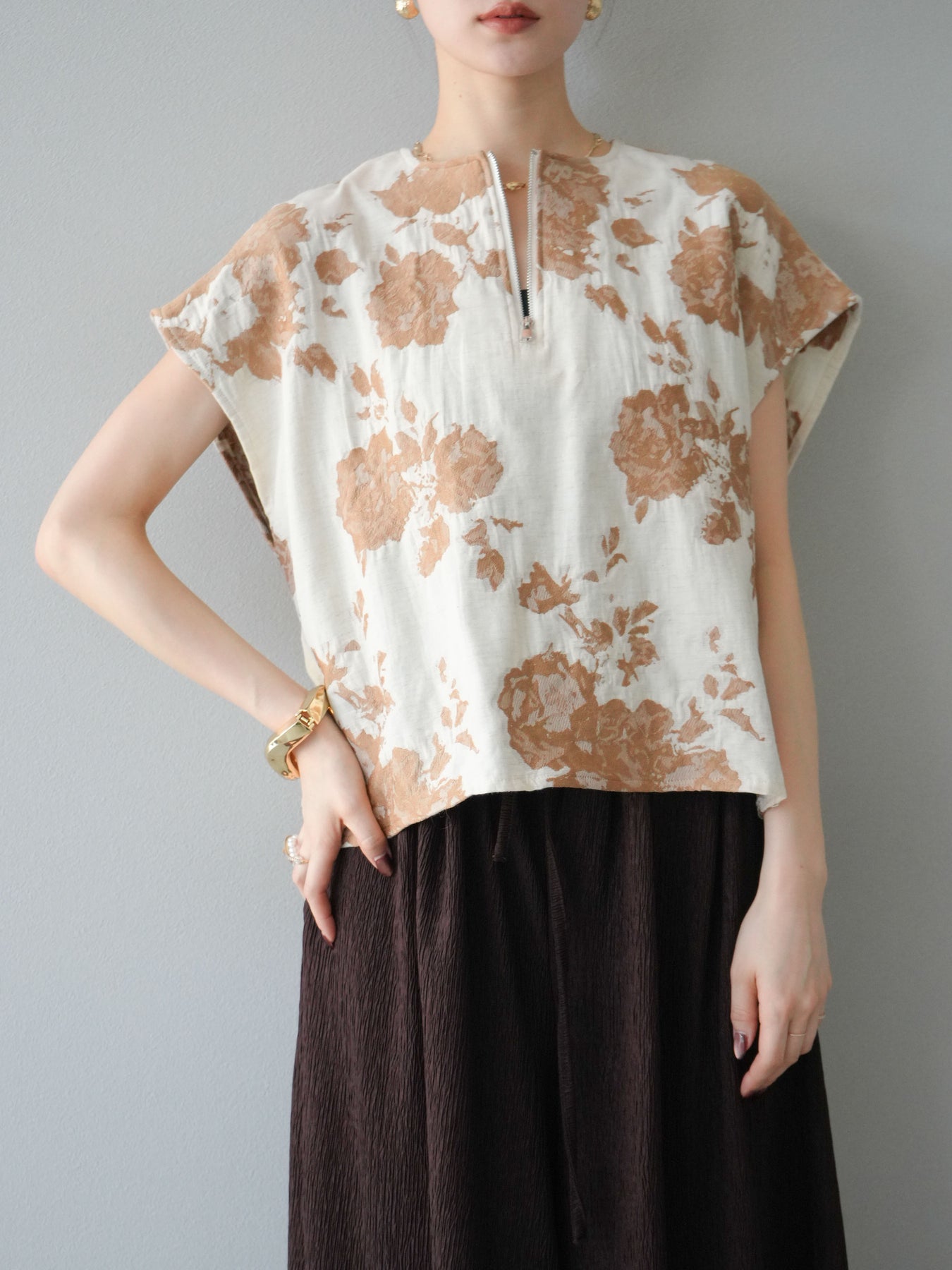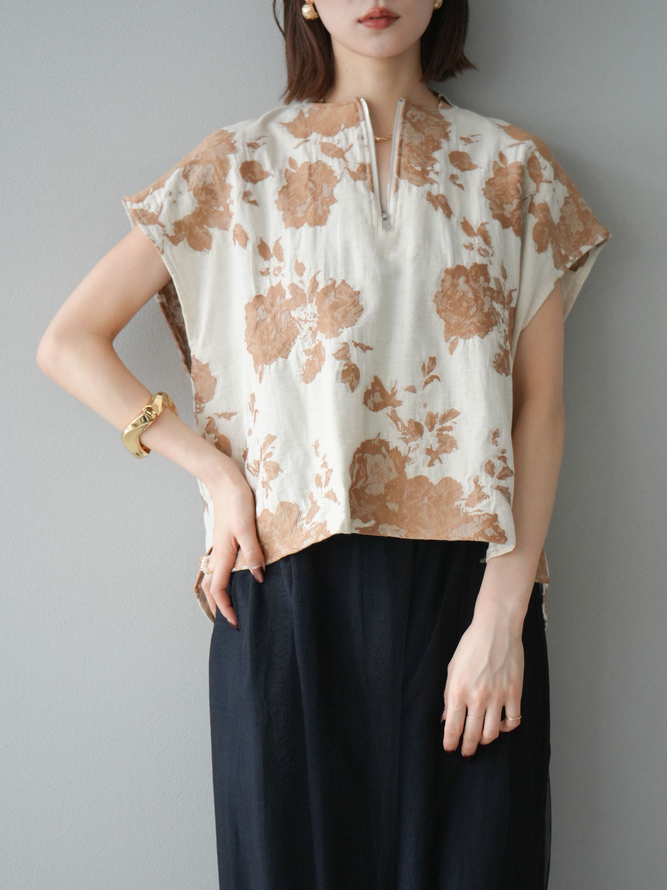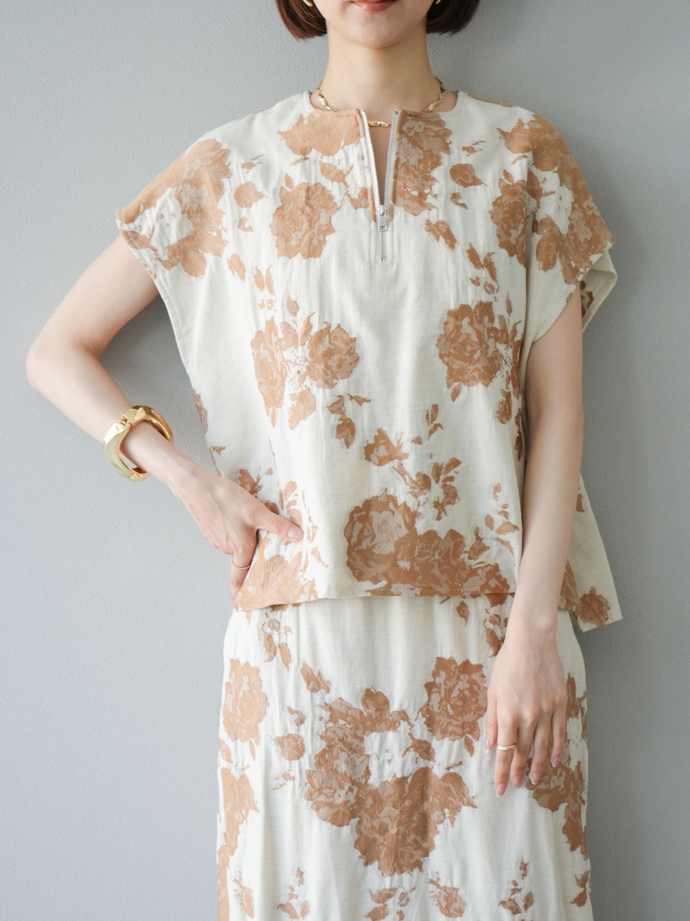 繊細な花柄をジャガード織りで表現した存在感あるプルオーバー。 程よいハリ感のある素材が、シルエットをきれいにキープしてくれます。 フロントのZIPデザインが程よい抜け感をプラスし、シンプルながらも洗練された印象に。 同素材のスカートとセットアップでの着用もおすすめです。 一枚でコーディネートの主役になる、春夏にぴったりのアイテムです。 ※ボトムス、キャミソール(インナー)以外の商品は一律でインナーは付属していません。