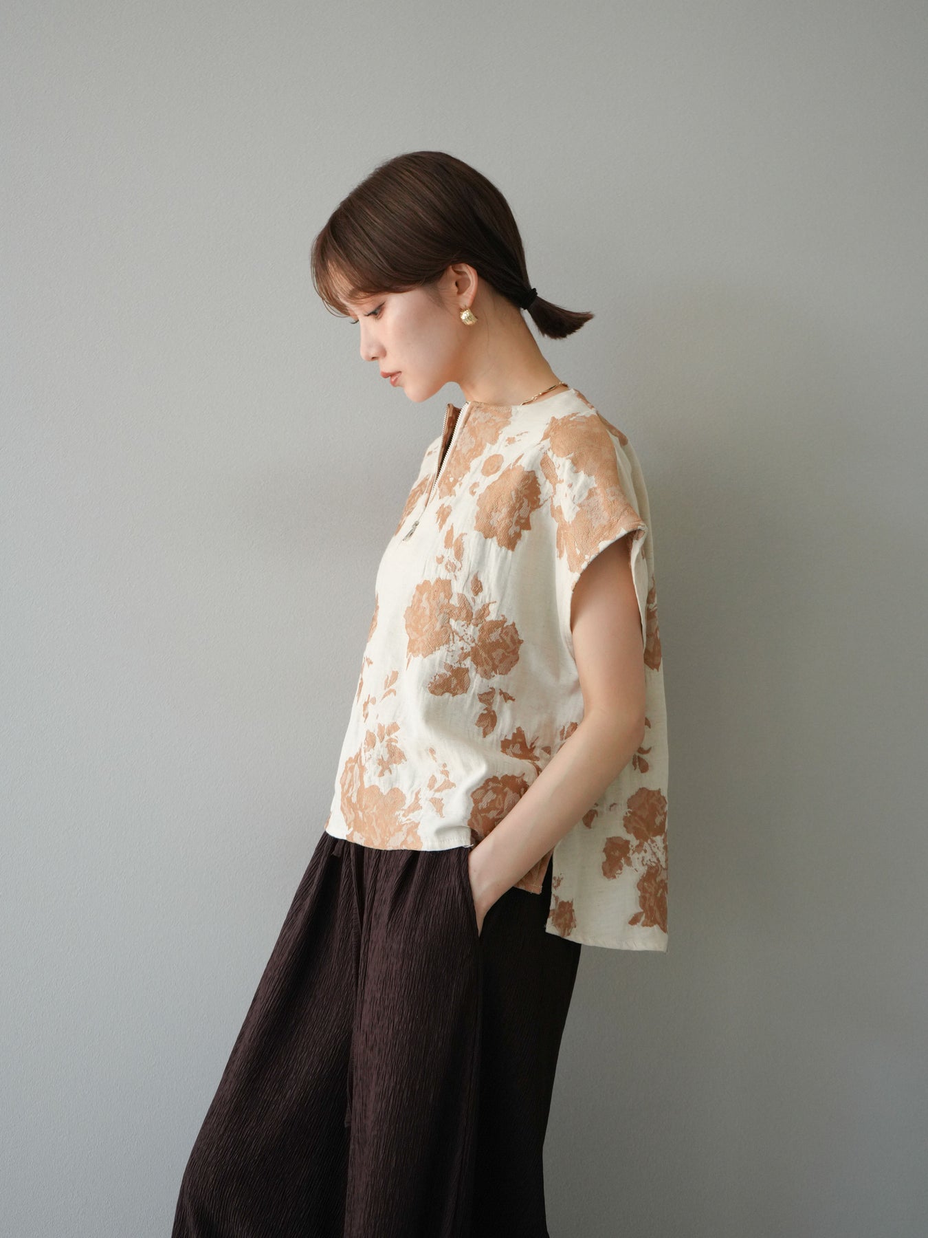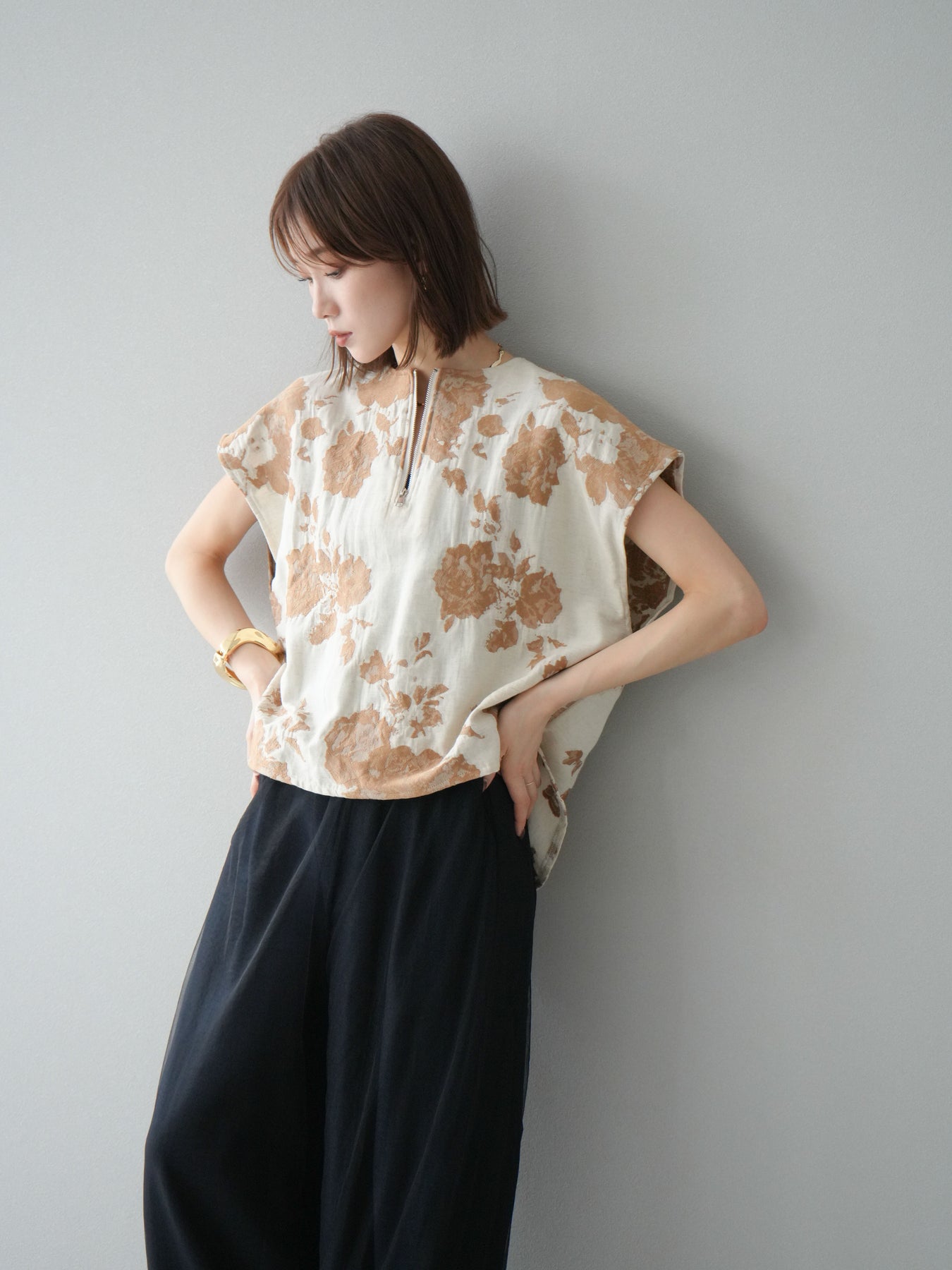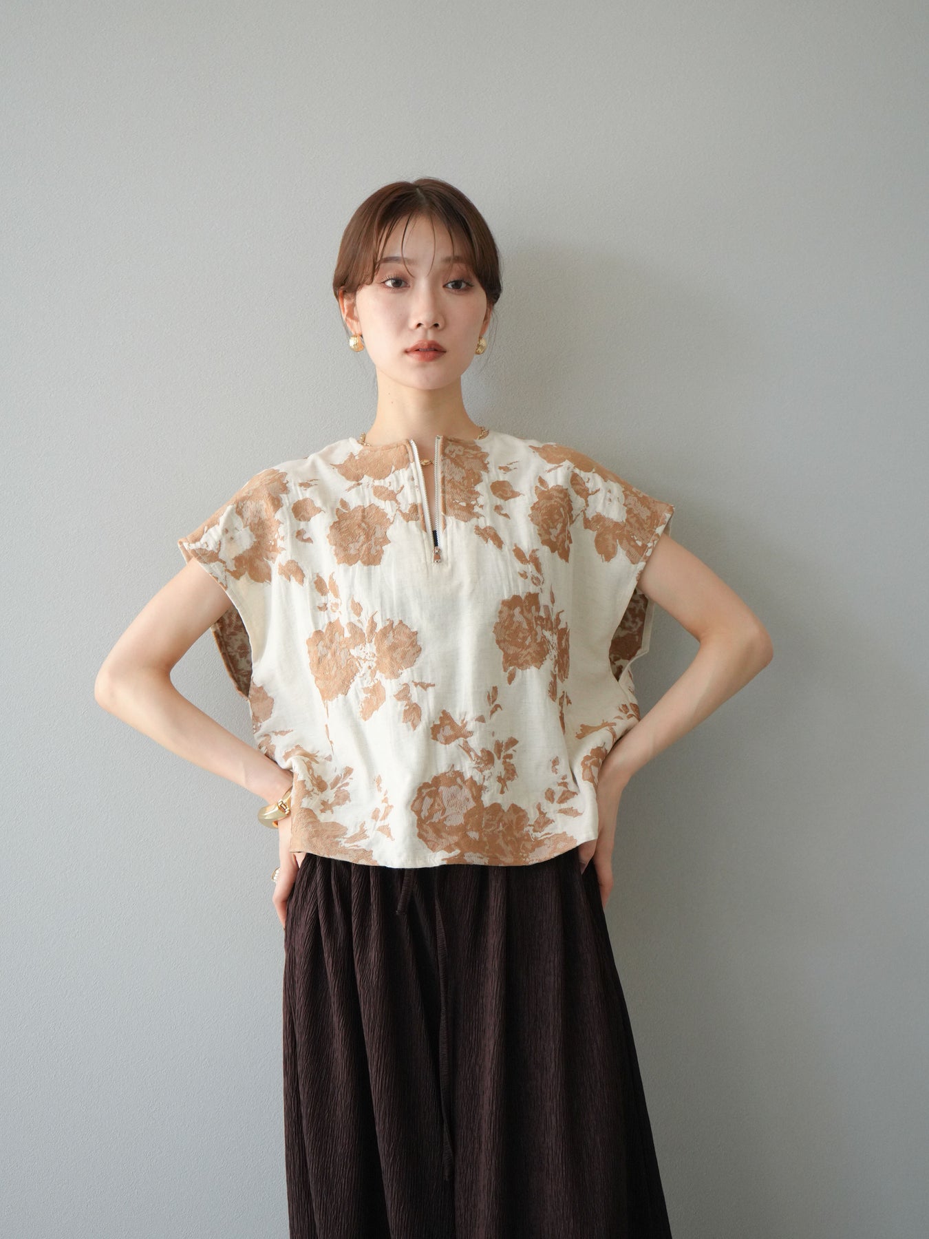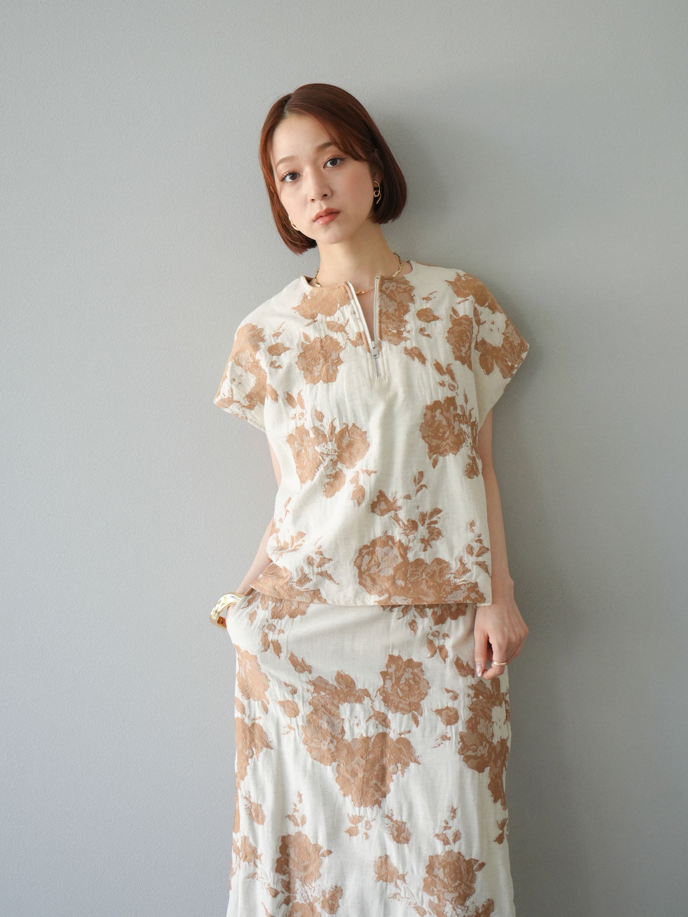 繊細な花柄をジャガード織りで表現した存在感あるプルオーバー。 程よいハリ感のある素材が、シルエットをきれいにキープしてくれます。 フロントのZIPデザインが程よい抜け感をプラスし、シンプルながらも洗練された印象に。 同素材のスカートとセットアップでの着用もおすすめです。 一枚でコーディネートの主役になる、春夏にぴったりのアイテムです。 ※ボトムス、キャミソール(インナー)以外の商品は一律でインナーは付属していません。