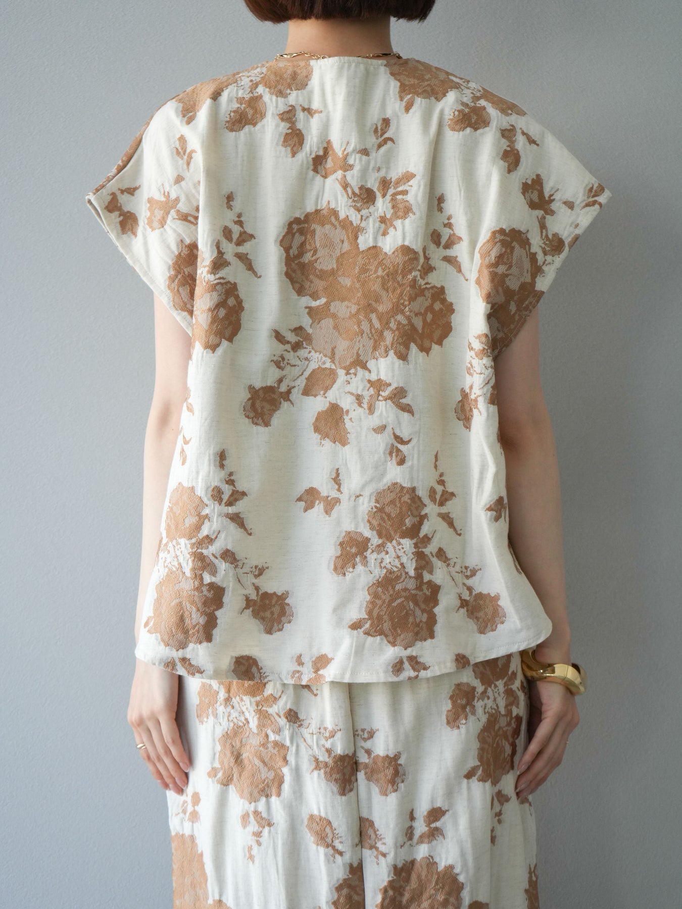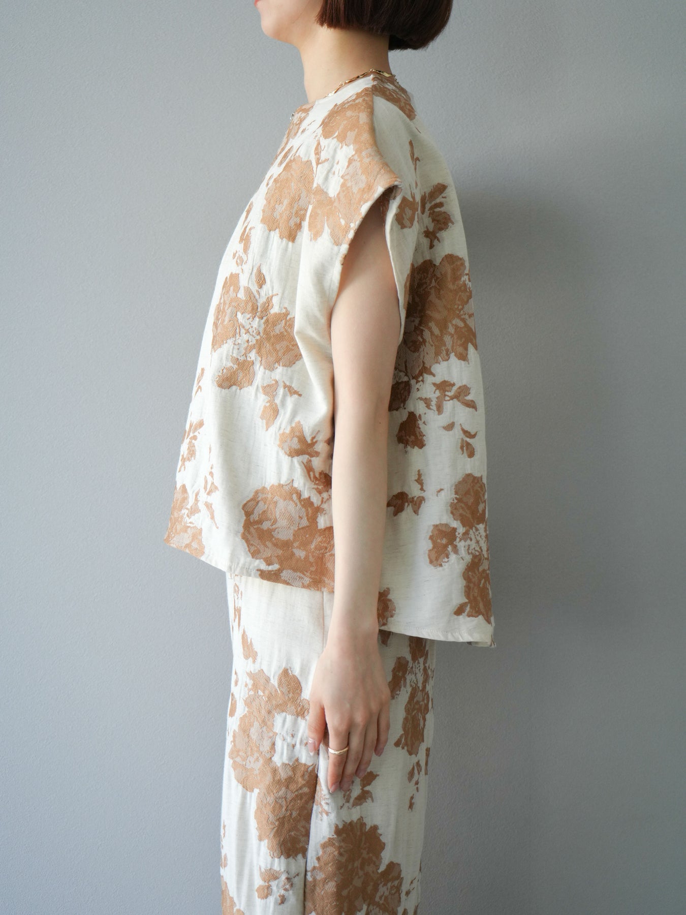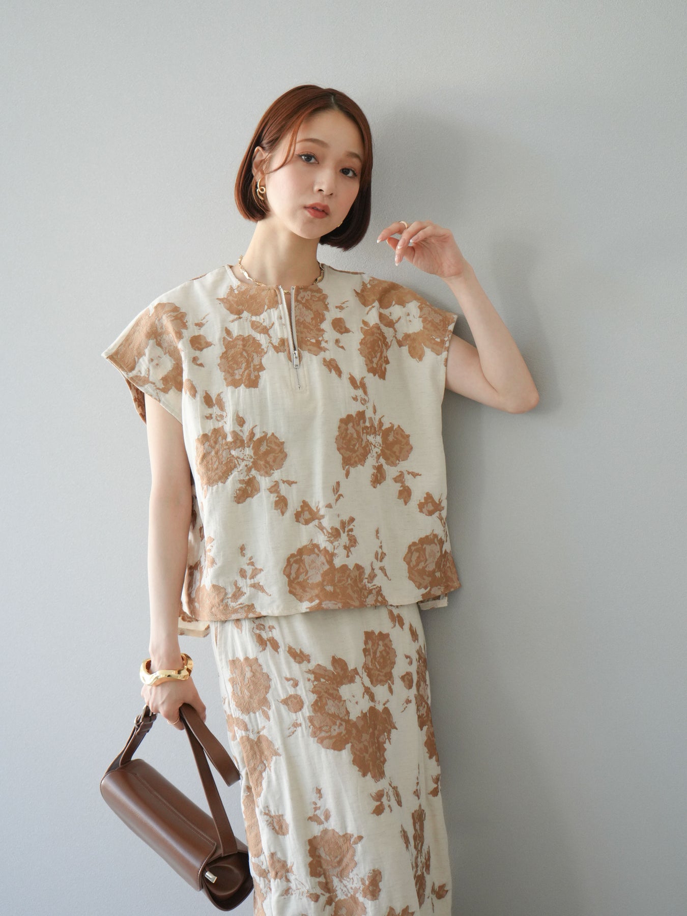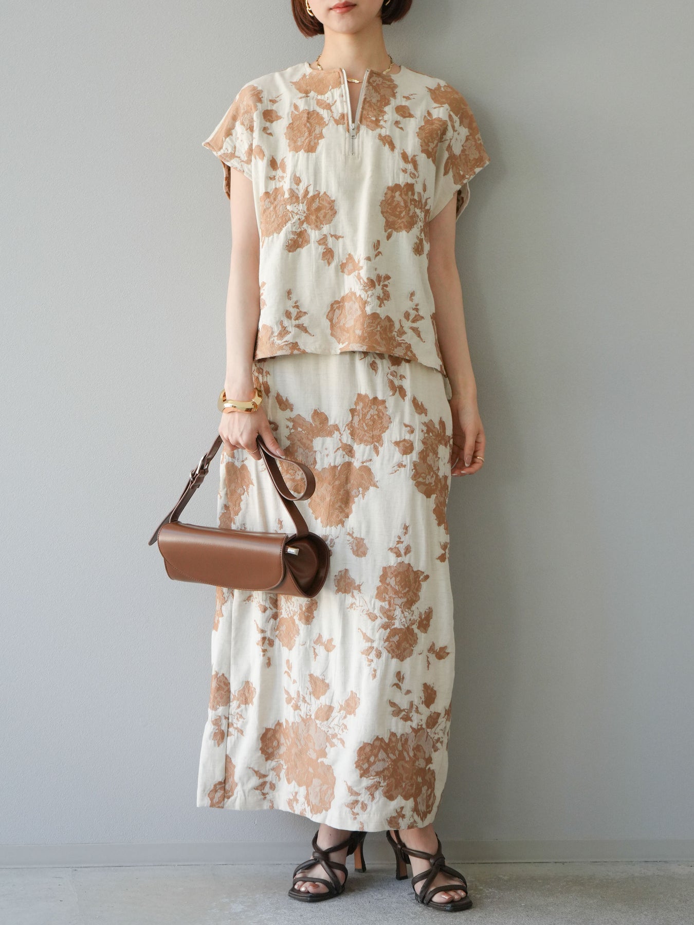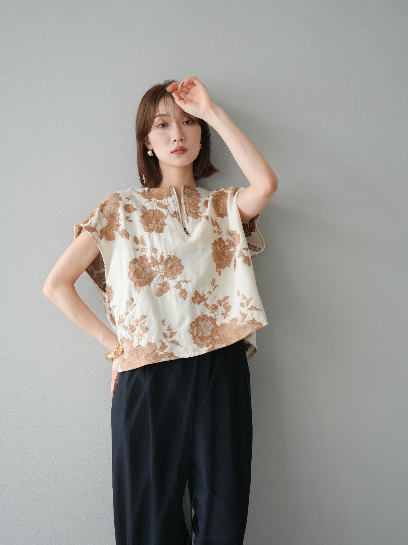繊細な花柄をジャガード織りで表現した存在感あるプルオーバー。 程よいハリ感のある素材が、シルエットをきれいにキープしてくれます。 フロントのZIPデザインが程よい抜け感をプラスし、シンプルながらも洗練された印象に。 同素材のスカートとセットアップでの着用もおすすめです。 一枚でコーディネートの主役になる、春夏にぴったりのアイテムです。 ※ボトムス、キャミソール(インナー)以外の商品は一律でインナーは付属していません。