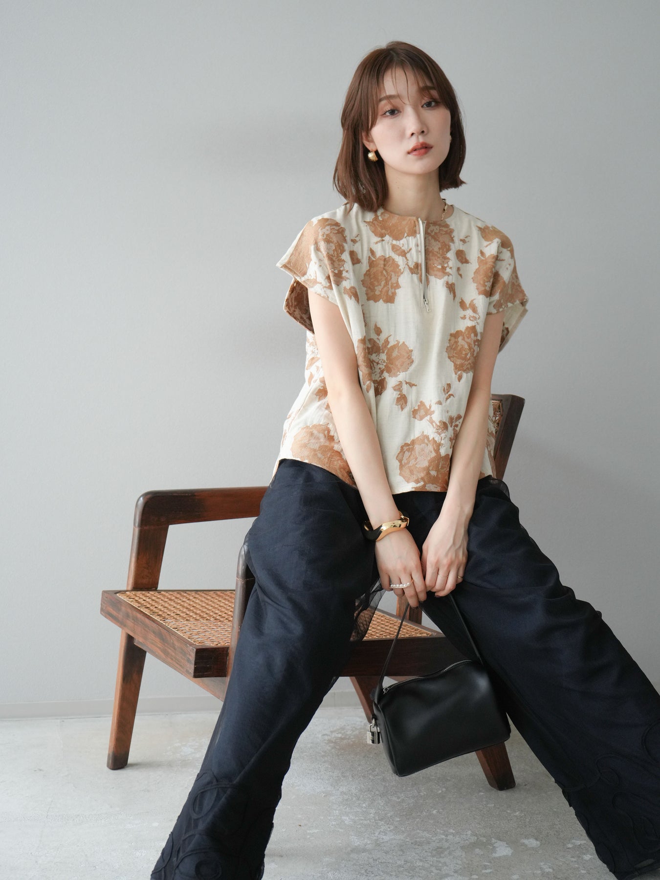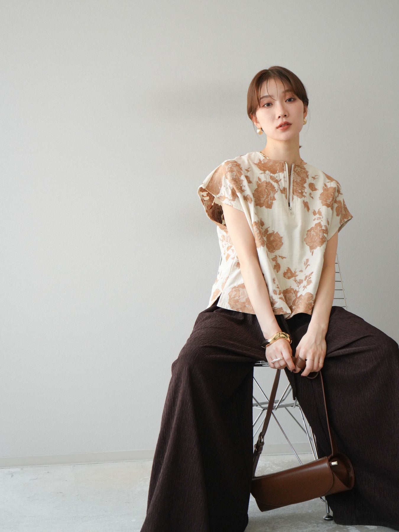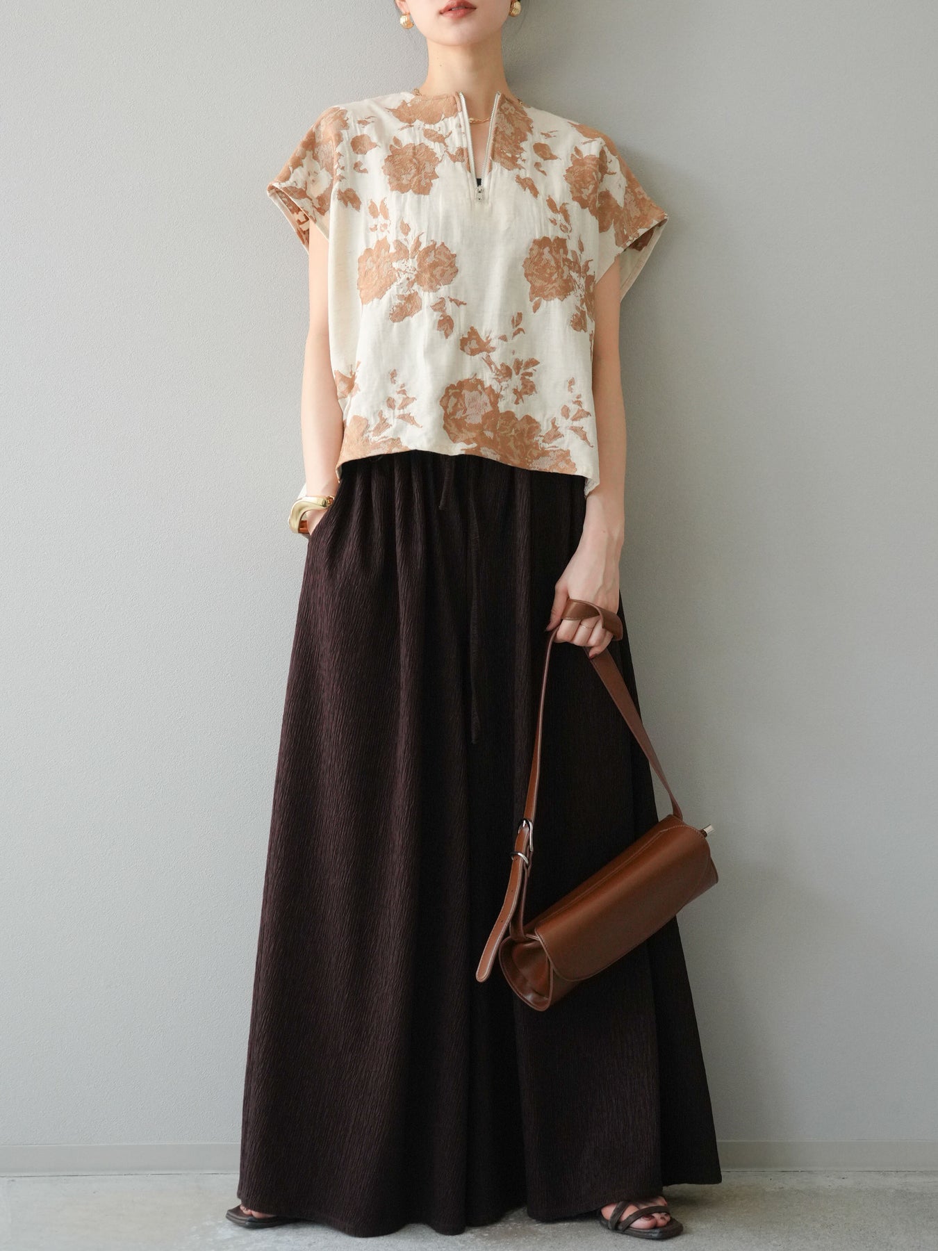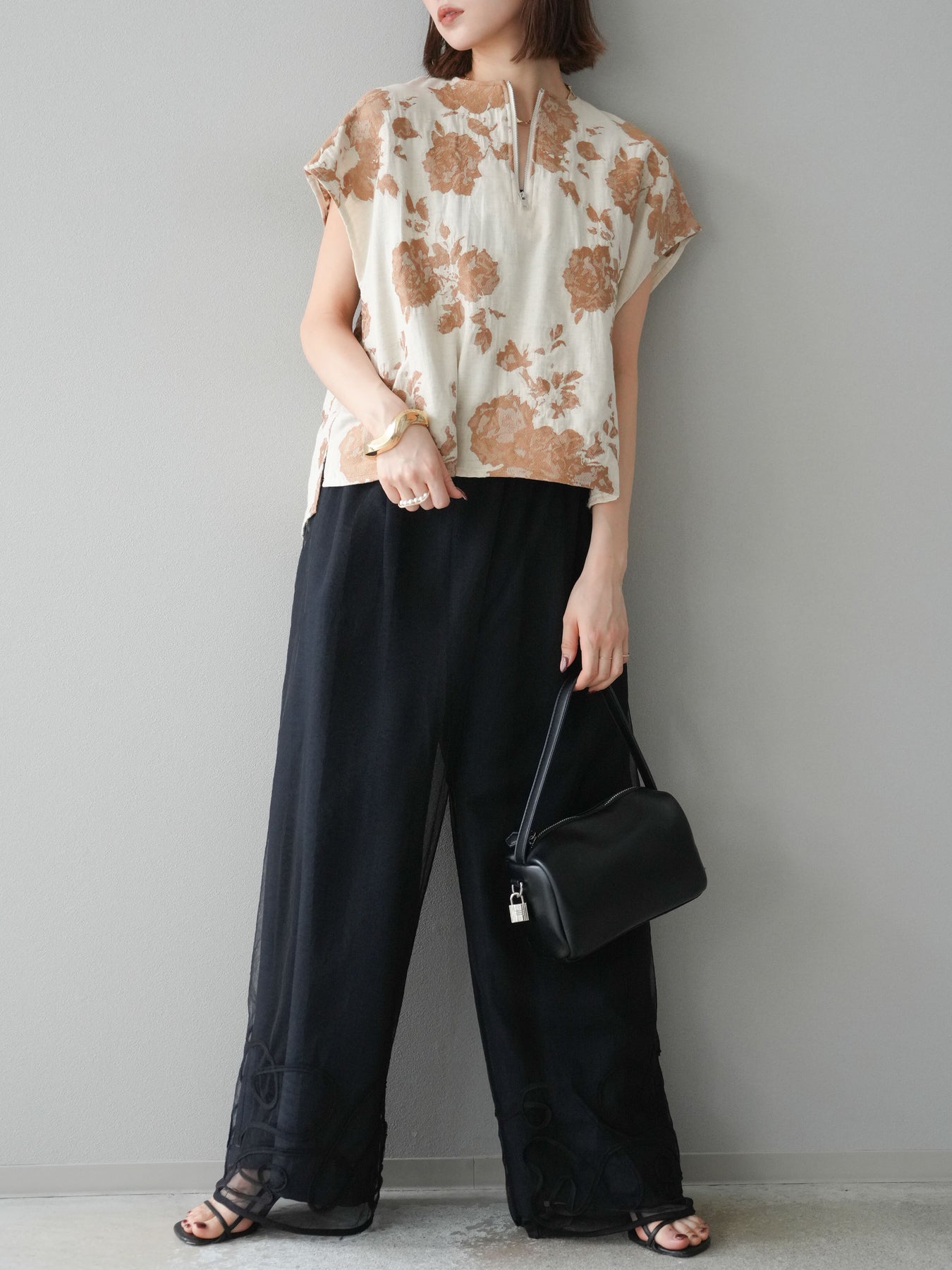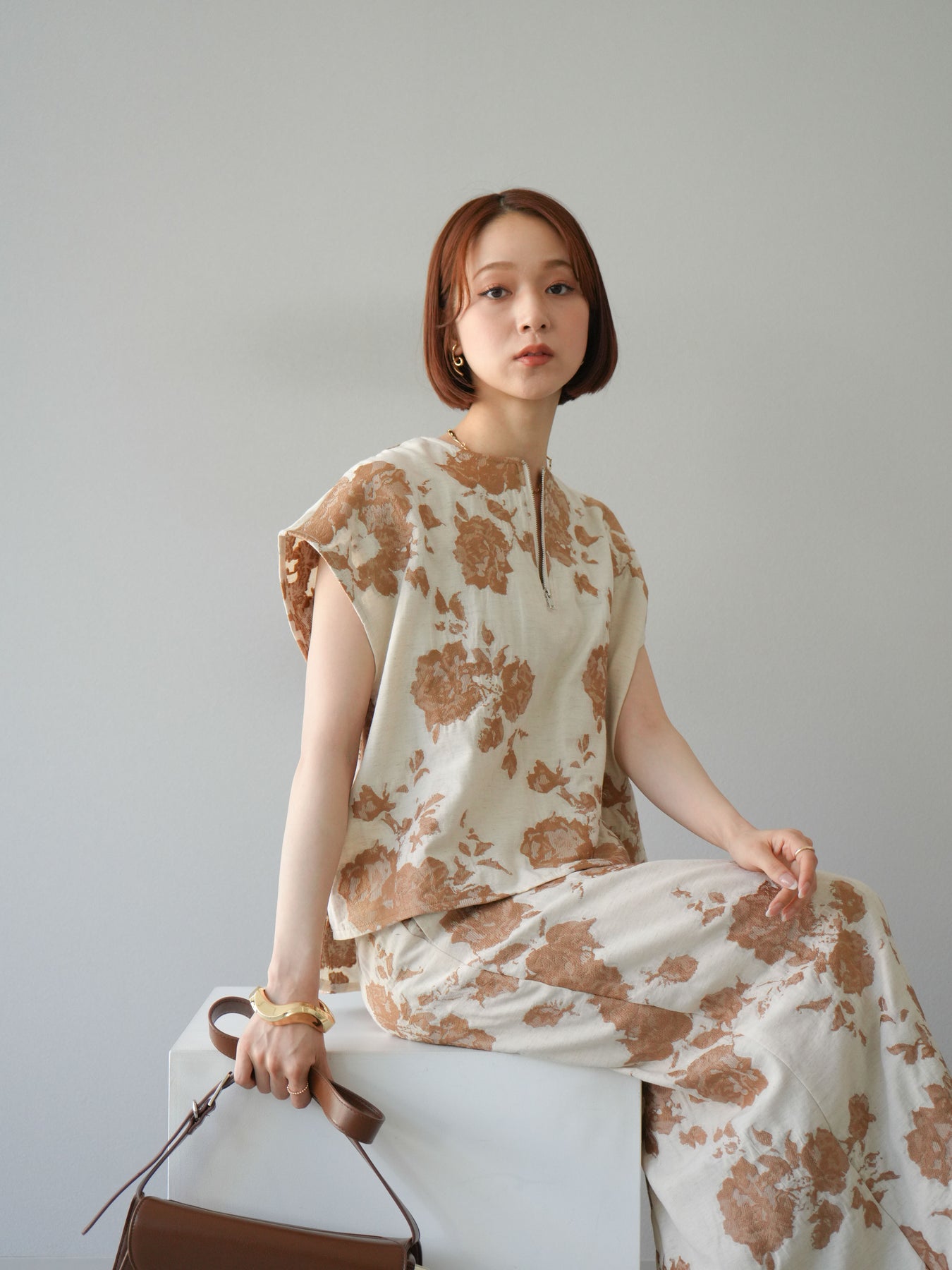 繊細な花柄をジャガード織りで表現した存在感あるプルオーバー。 程よいハリ感のある素材が、シルエットをきれいにキープしてくれます。 フロントのZIPデザインが程よい抜け感をプラスし、シンプルながらも洗練された印象に。 同素材のスカートとセットアップでの着用もおすすめです。 一枚でコーディネートの主役になる、春夏にぴったりのアイテムです。 ※ボトムス、キャミソール(インナー)以外の商品は一律でインナーは付属していません。