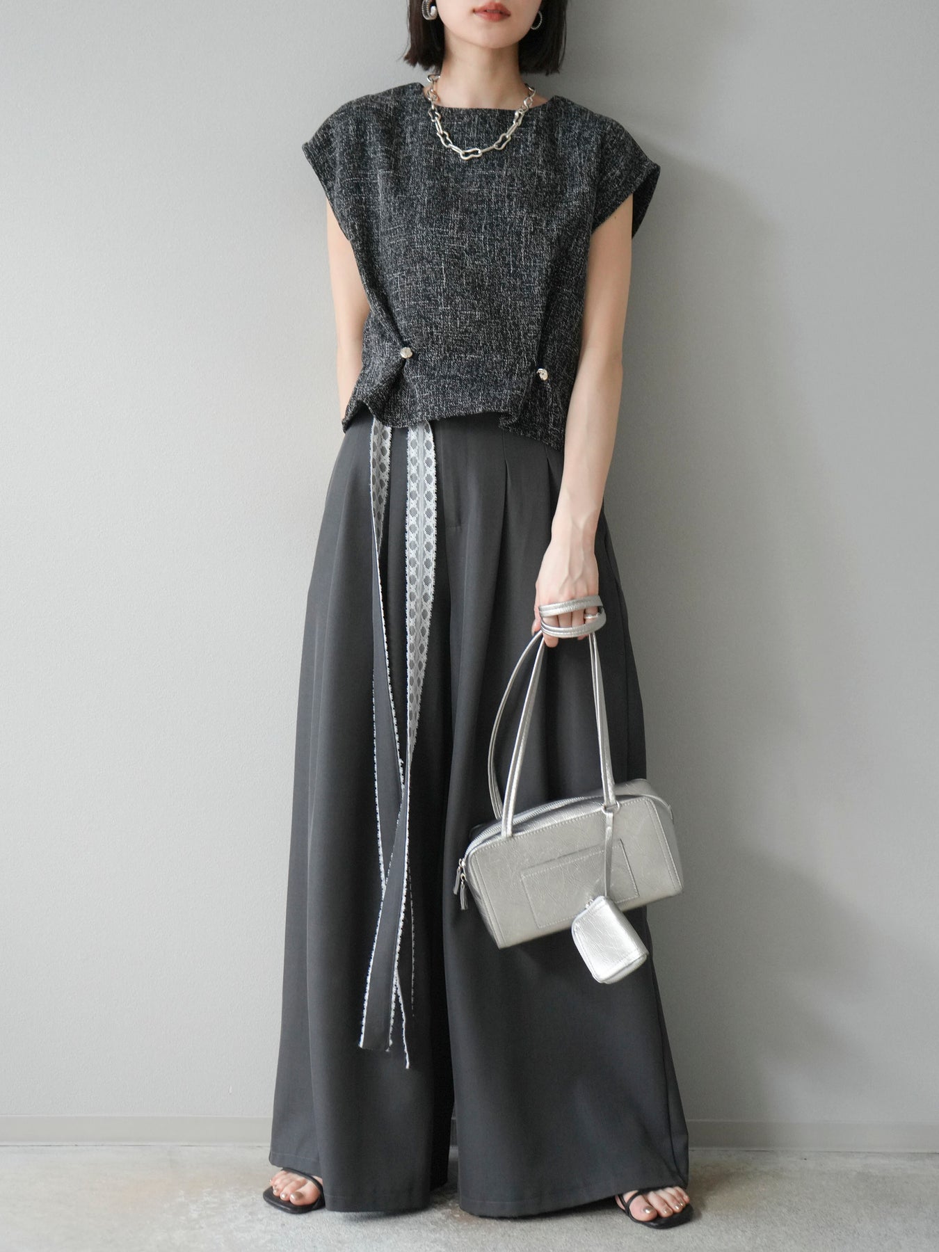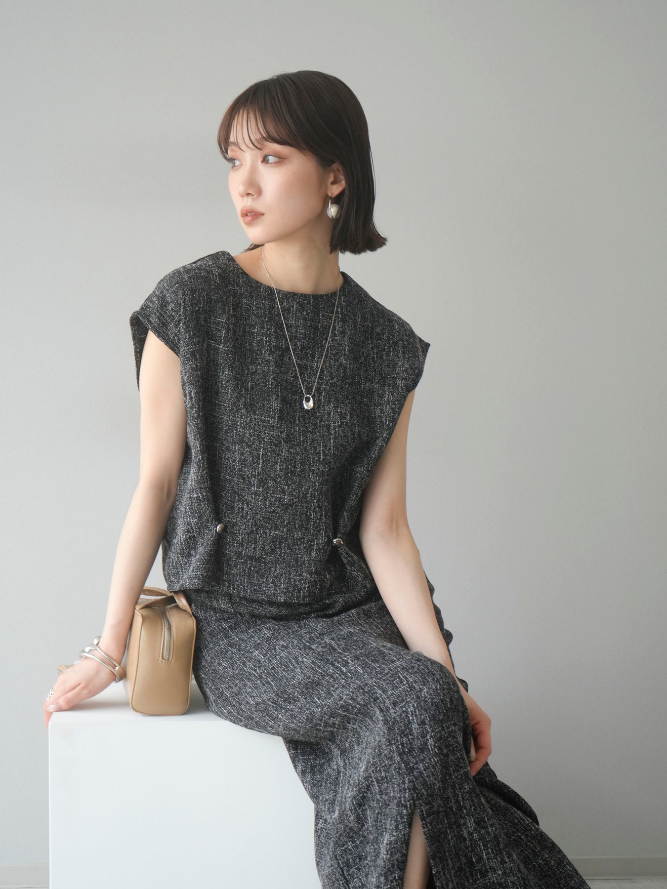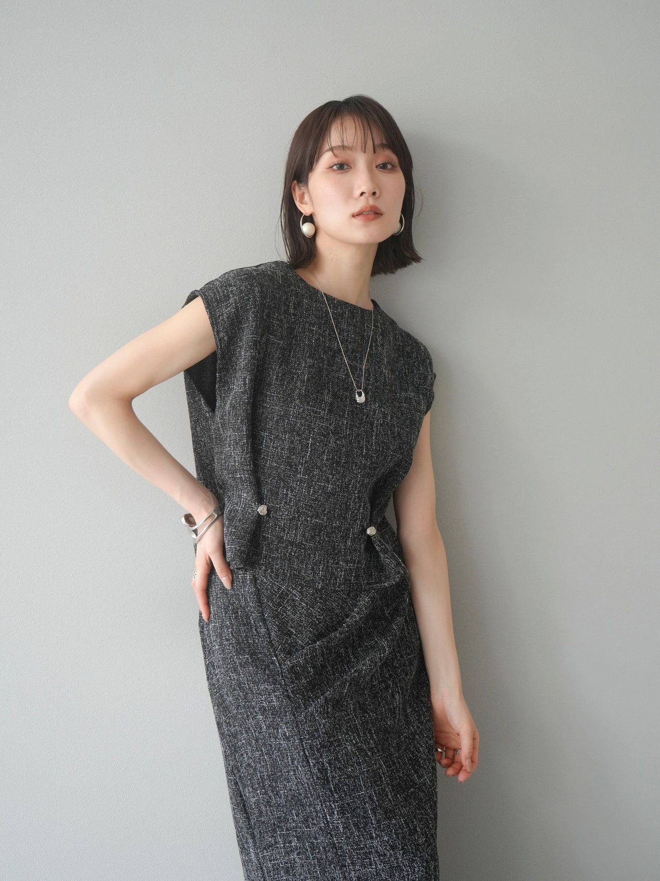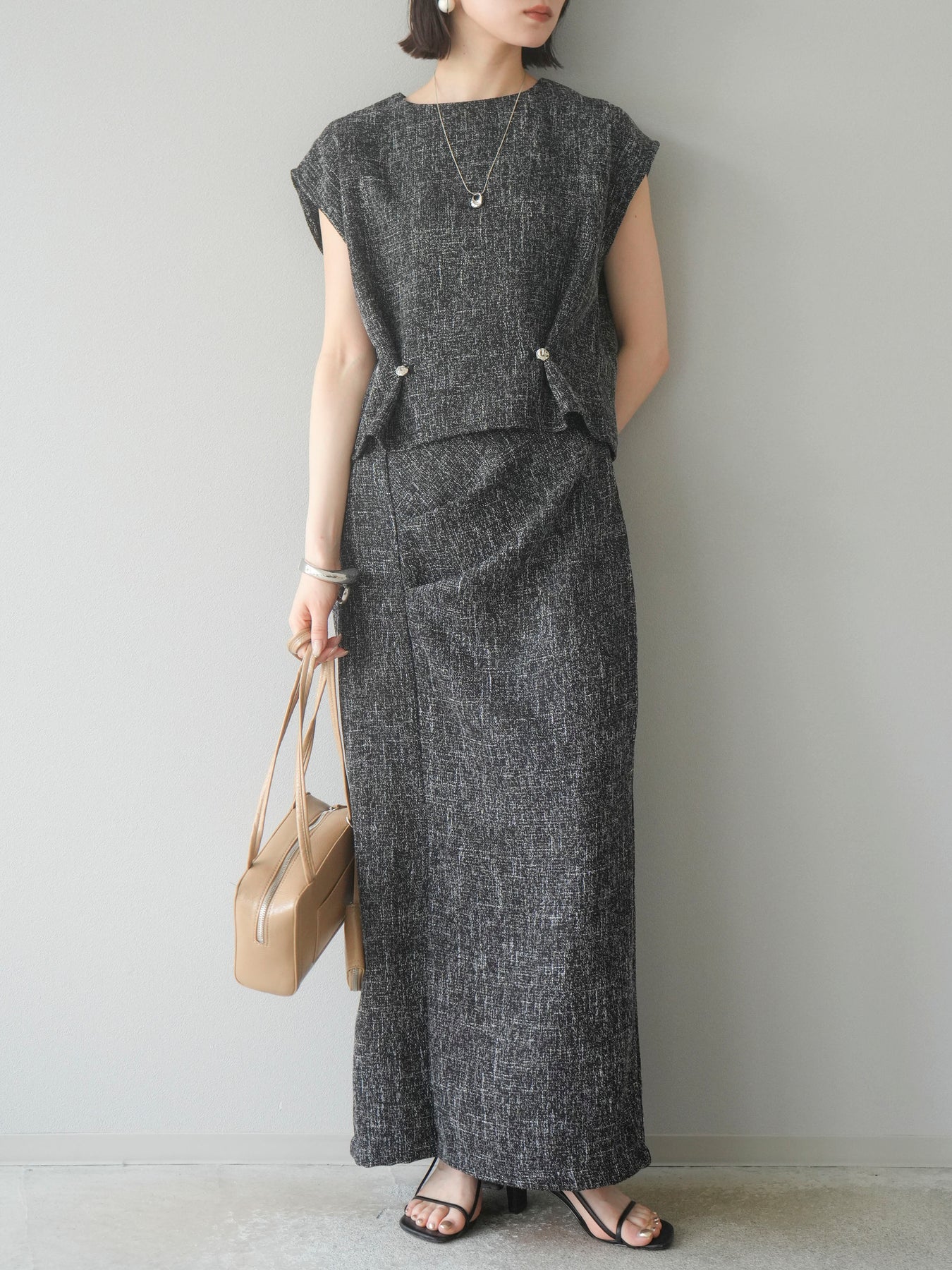 表情豊かなサマーツイード素材を使用した、きちんと感と抜け感を兼ね備えたぺプラムブラウス。ウエストサイドにはさりげなく施されたタック&ボタンディテールがアクセントになり、立体的なぺプラムシルエットを演出します。肩先までカバーするノースリーブ風の袖ぐりで、腕まわりもすっきり見え◎。後ろボタン仕様で着脱もスムーズ。デニムでカジュアルに、スラックスでキレイめにも着こなせる、大人の着映えトップスです。 ※ボトムス、キャミソール(インナー)以外の商品は一律でインナーは付属していません。