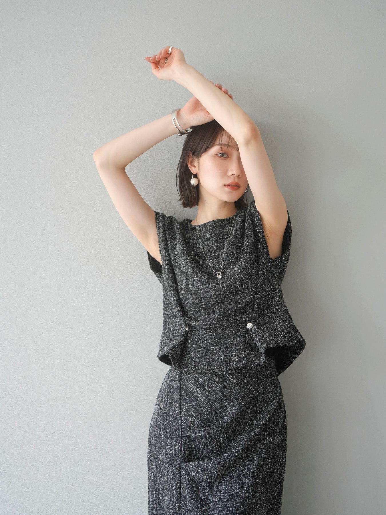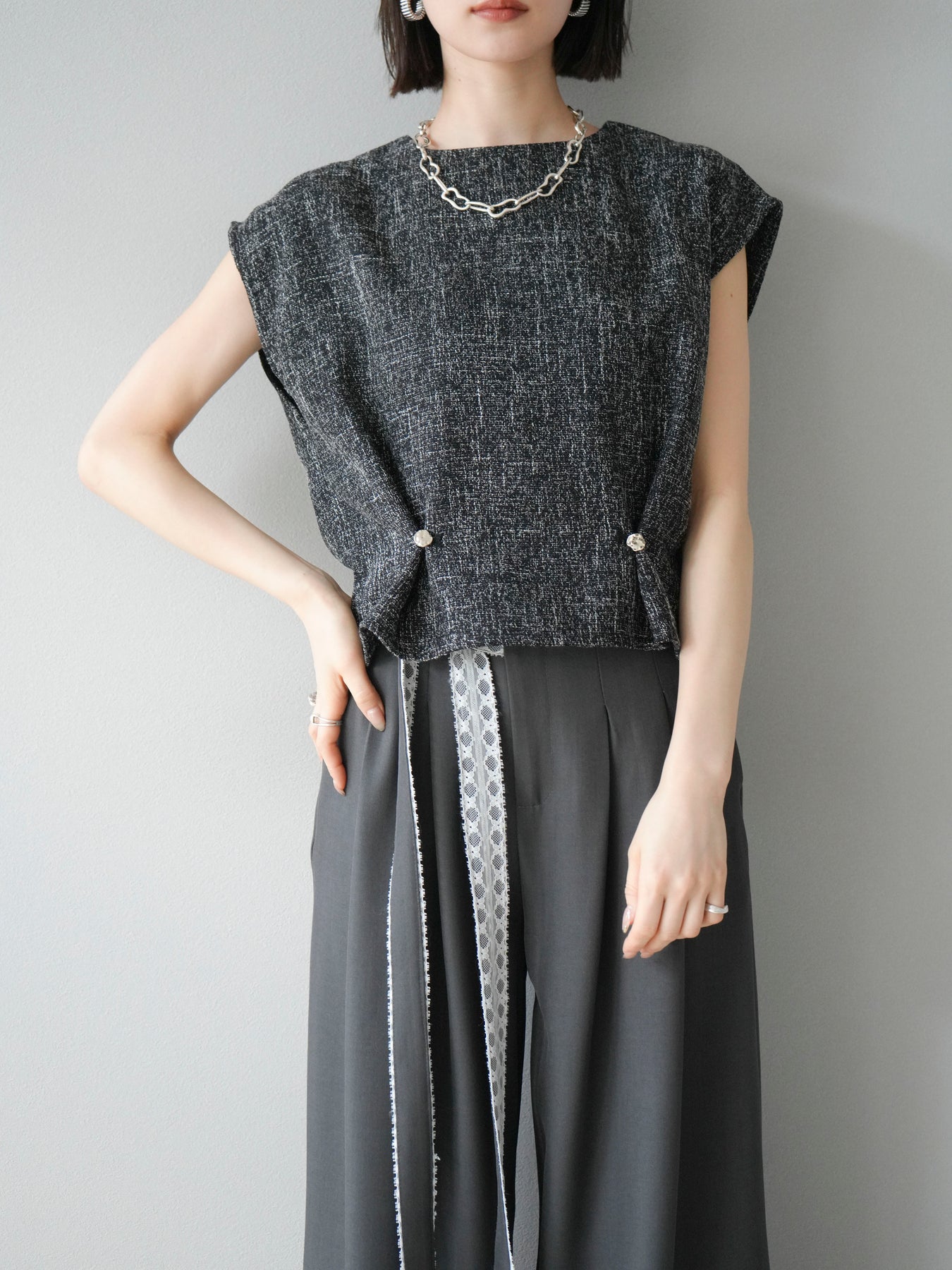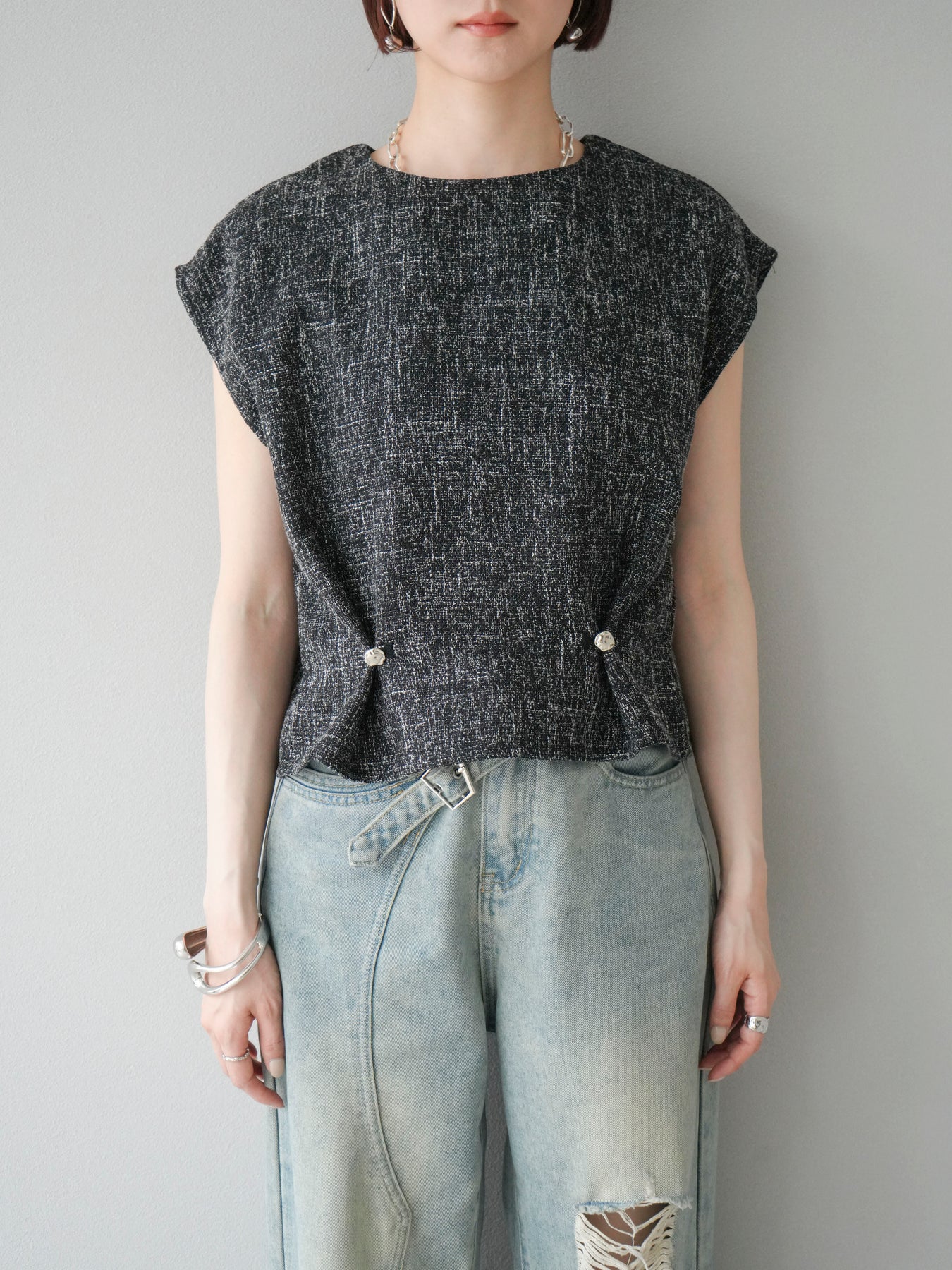 [予約]サマーツイードぺプラムブラウス/ブラックホワイト