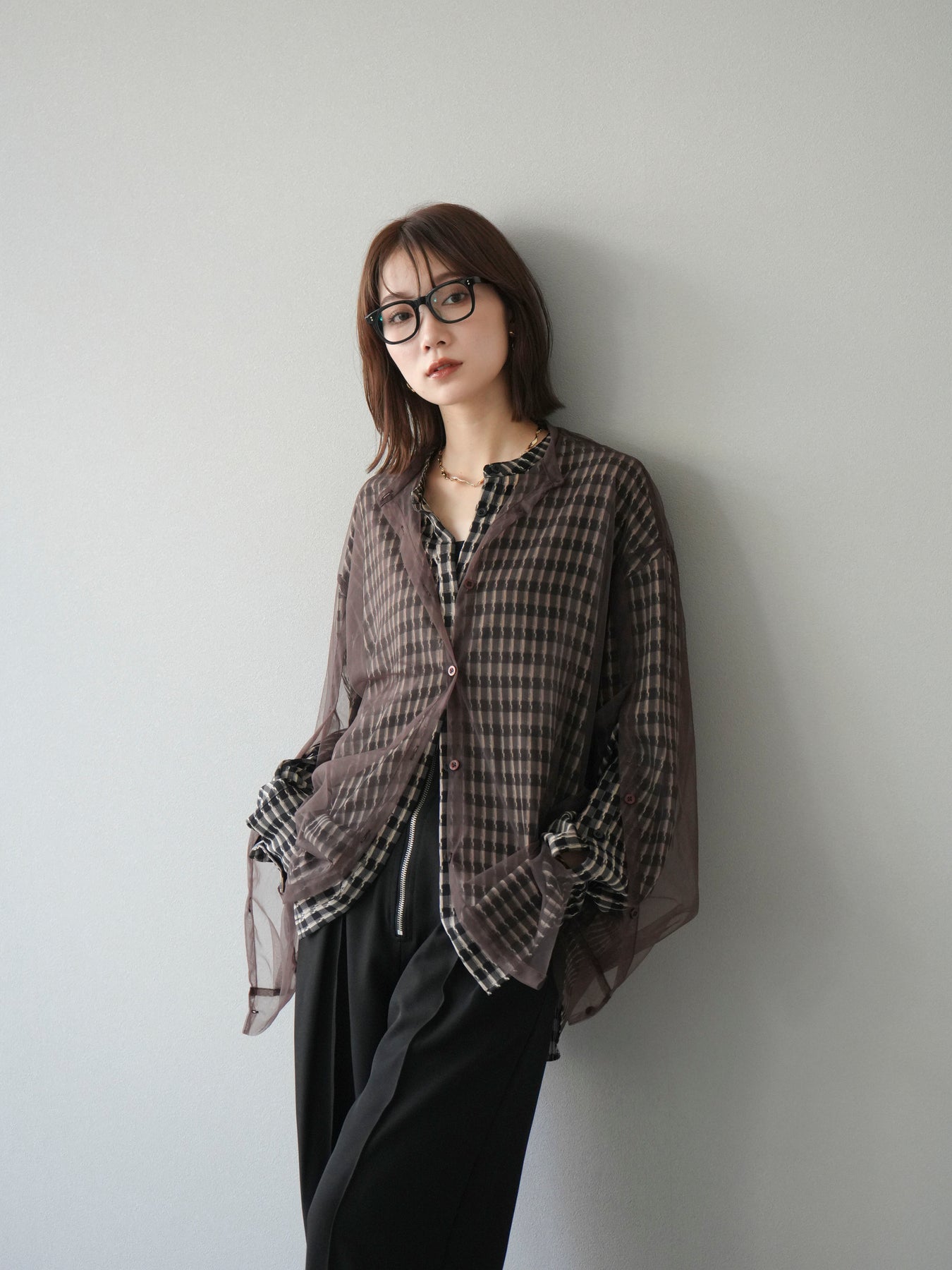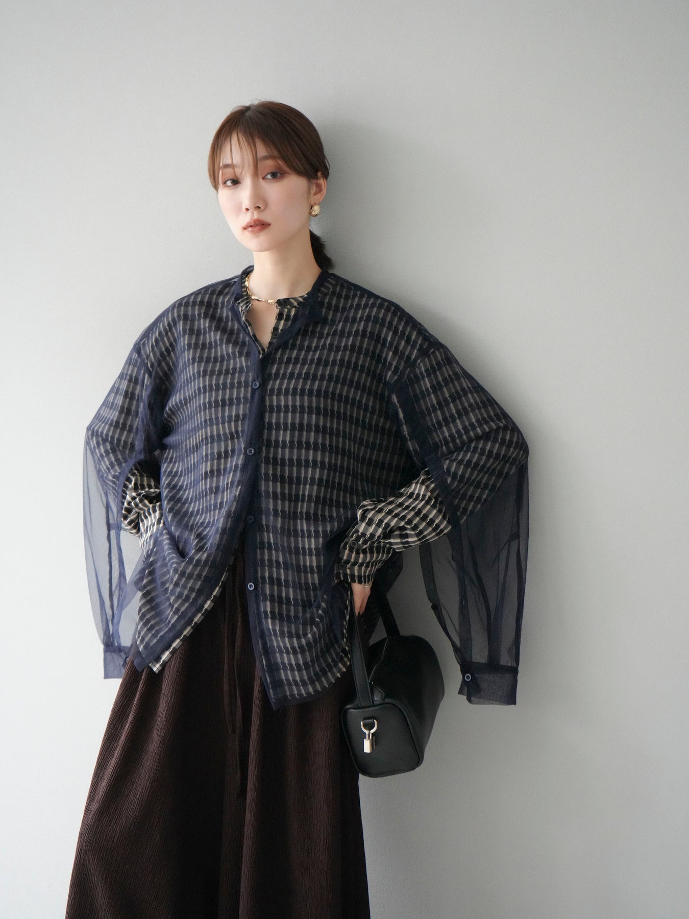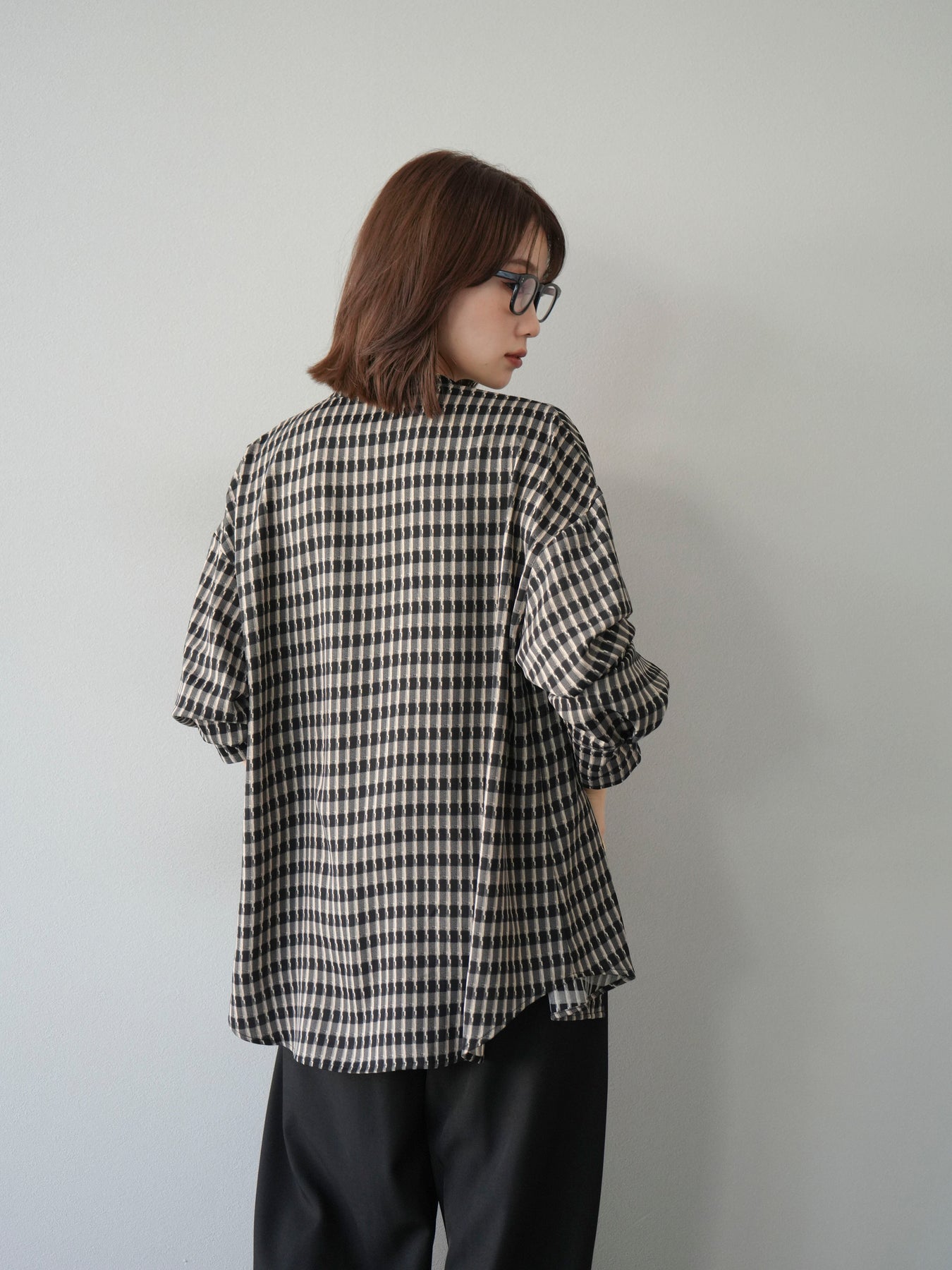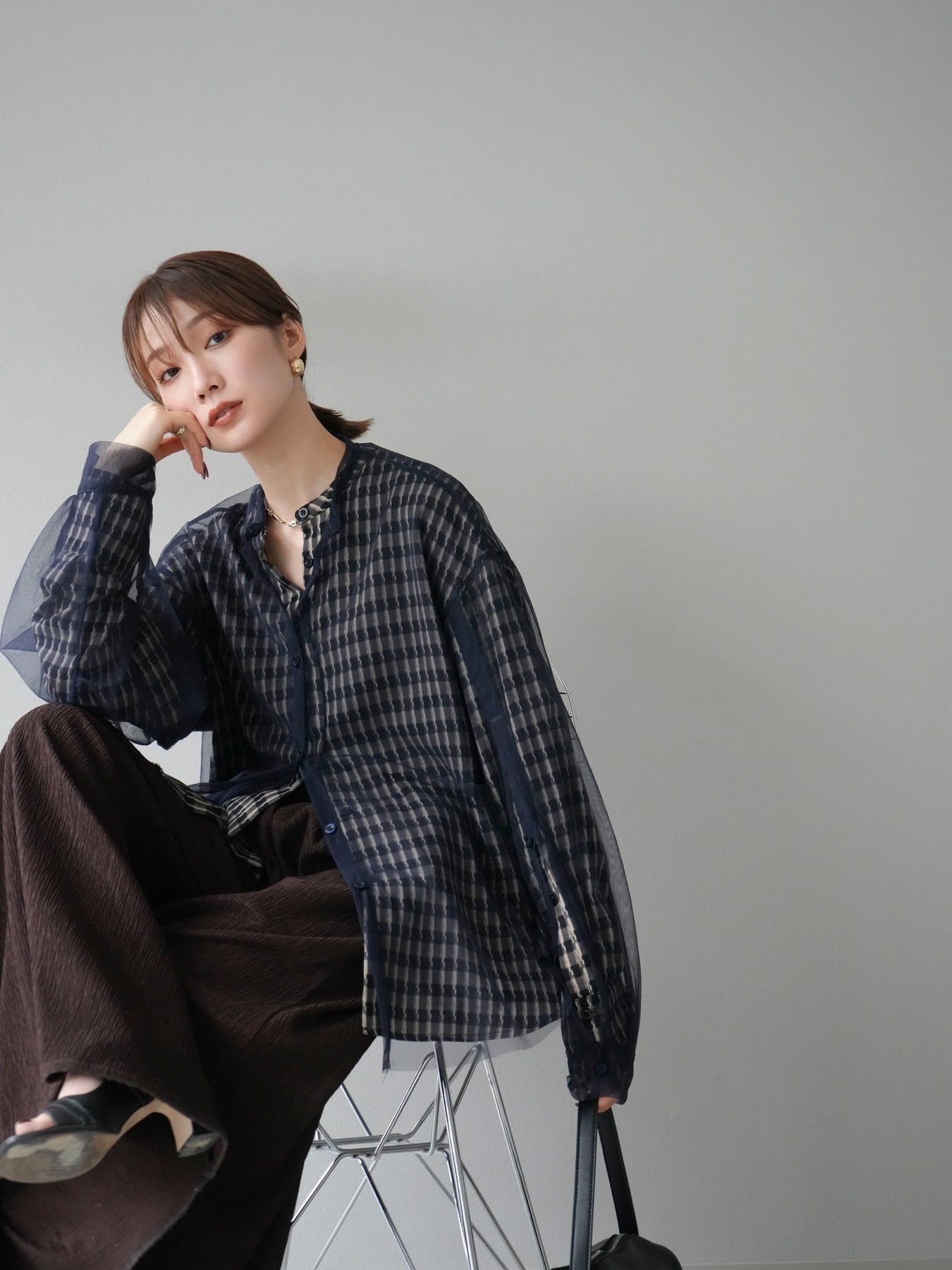 レトロ感漂うチェック柄に軽やかな素材感を掛け合わせたバンドカラーシャツ。ゆったりとしたシルエットで抜け感がありつつも、比翼仕立てのフロントがすっきりとした印象に。羽織りとしても着用できる万能な一枚。