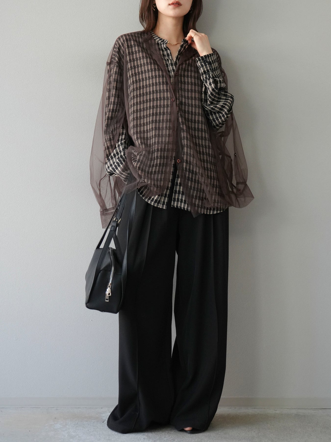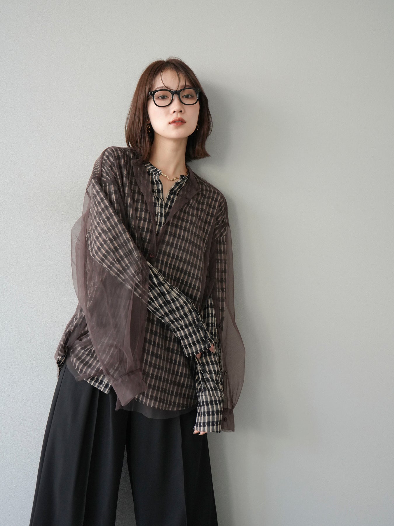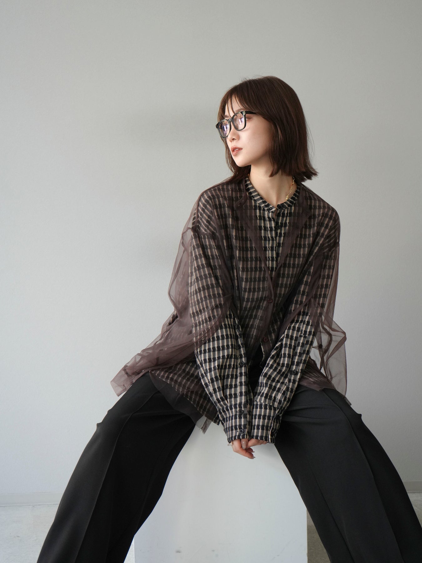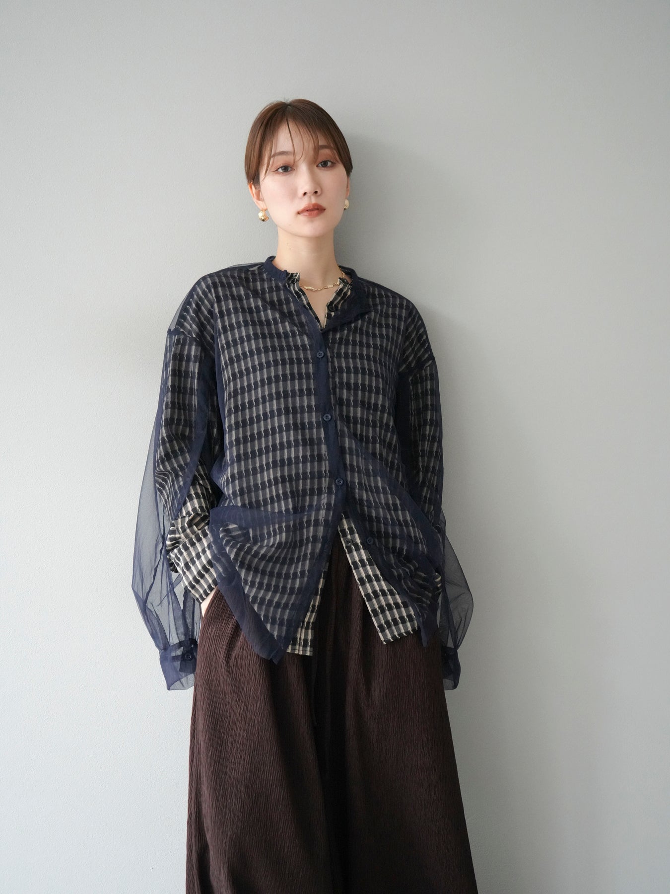 レトロ感漂うチェック柄に軽やかな素材感を掛け合わせたバンドカラーシャツ。ゆったりとしたシルエットで抜け感がありつつも、比翼仕立てのフロントがすっきりとした印象に。羽織りとしても着用できる万能な一枚。