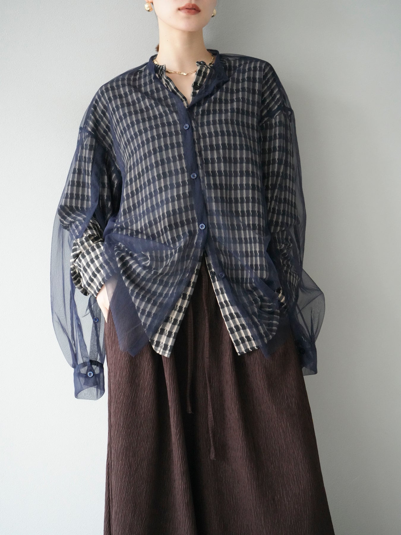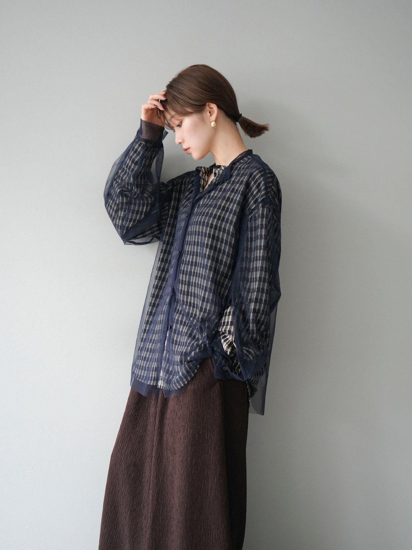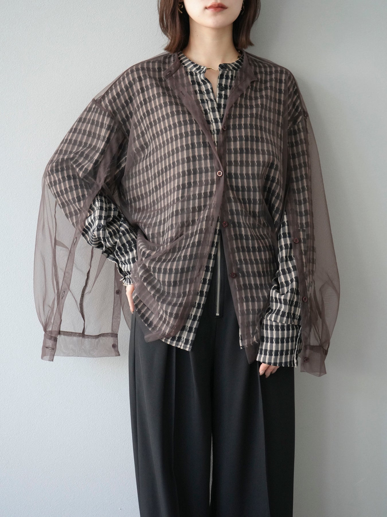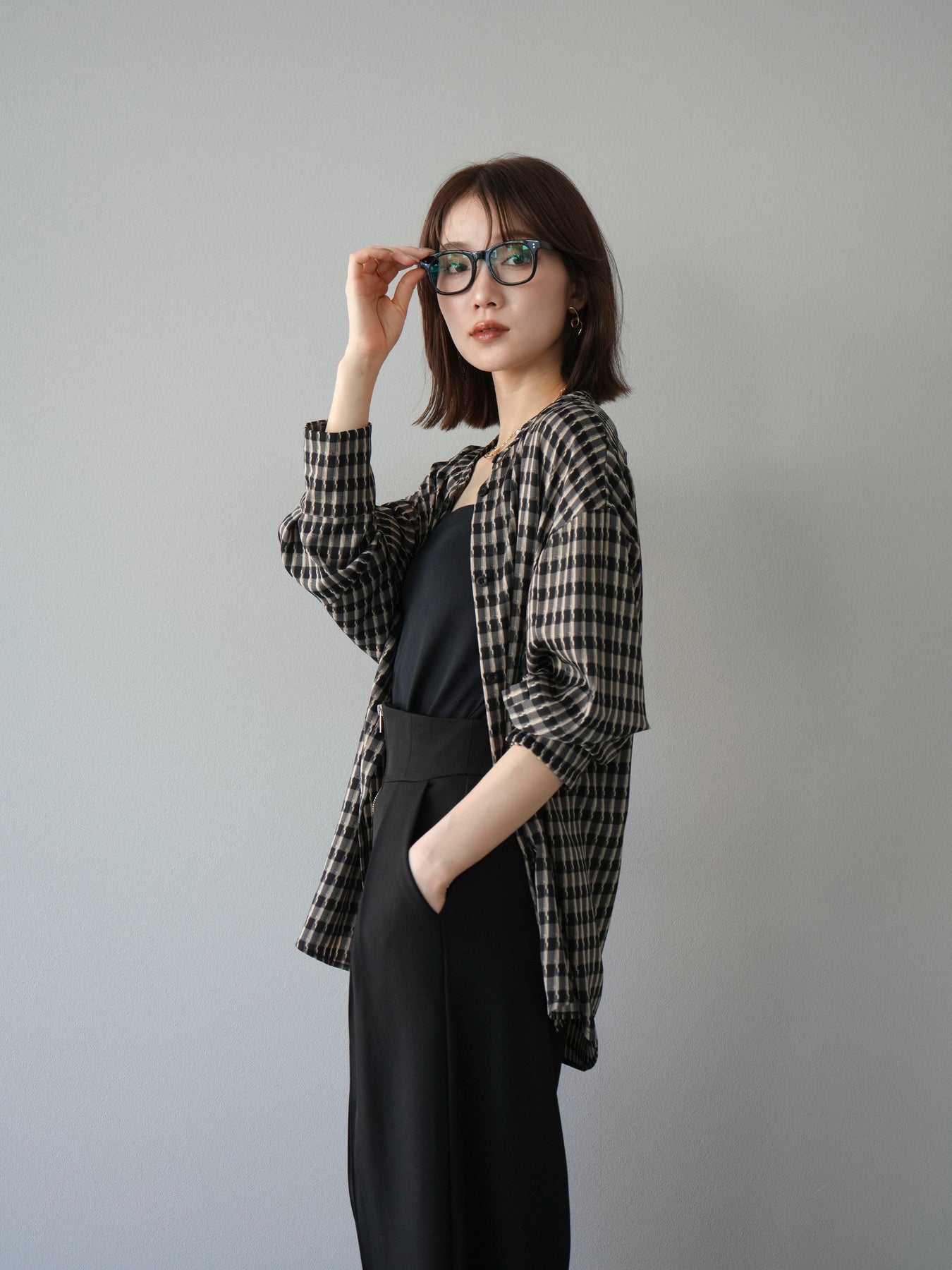 レトロ感漂うチェック柄に軽やかな素材感を掛け合わせたバンドカラーシャツ。ゆったりとしたシルエットで抜け感がありつつも、比翼仕立てのフロントがすっきりとした印象に。羽織りとしても着用できる万能な一枚。