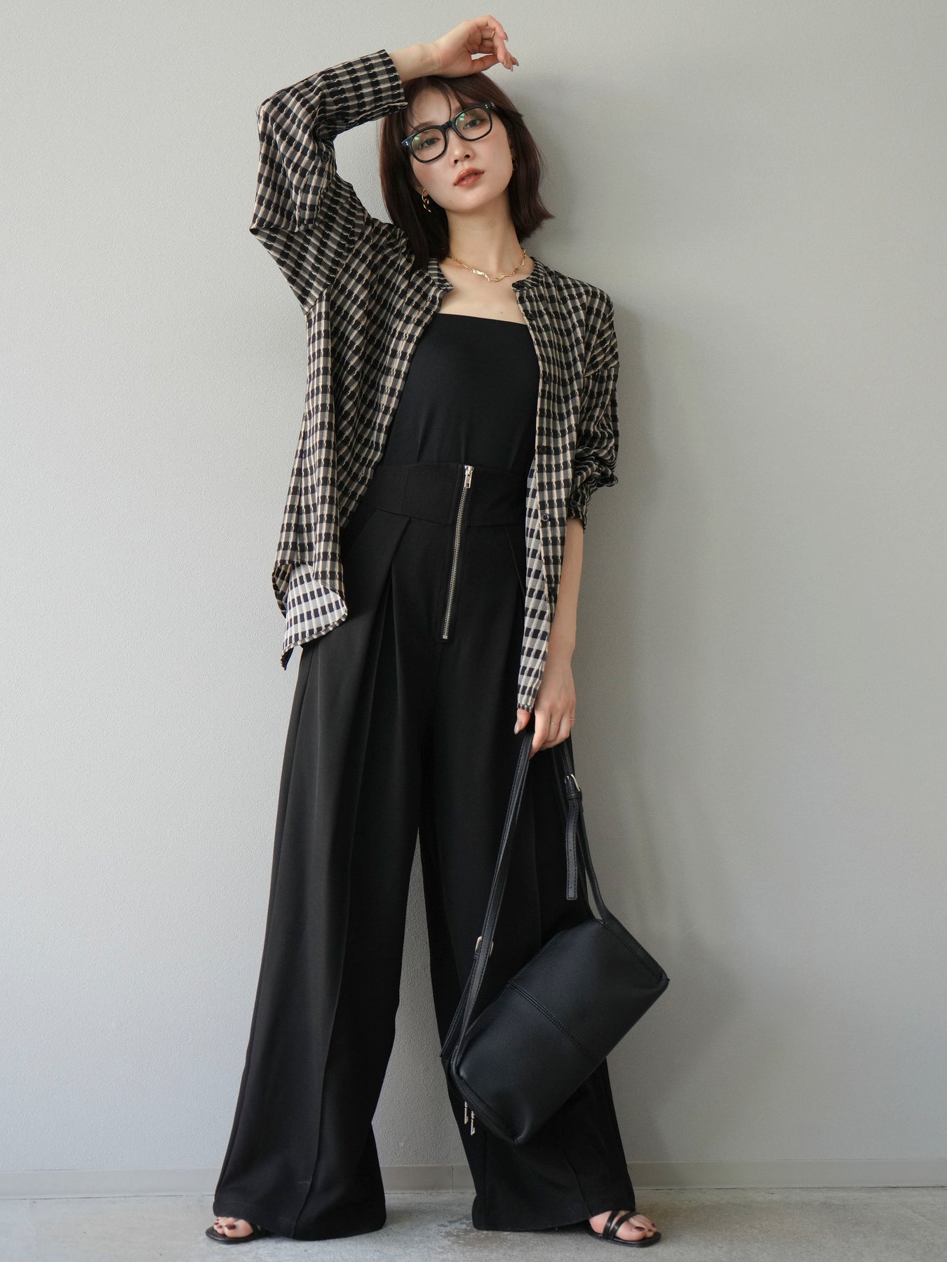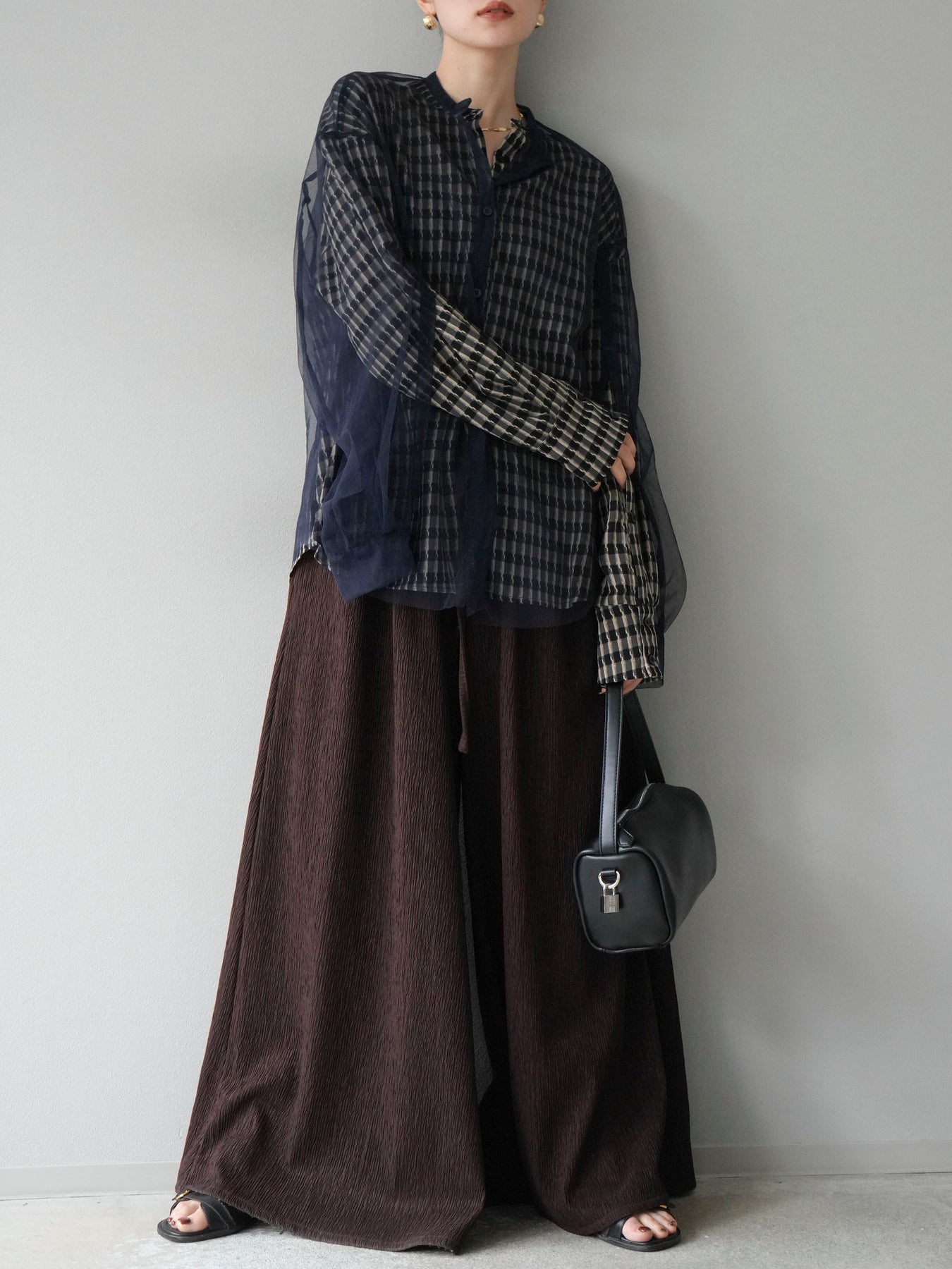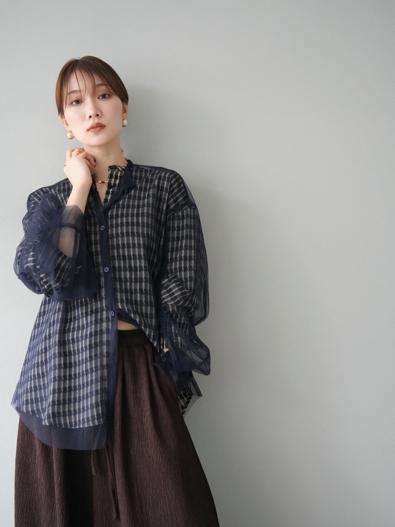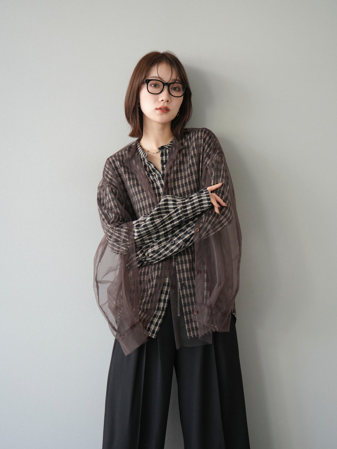 レトロ感漂うチェック柄に軽やかな素材感を掛け合わせたバンドカラーシャツ。ゆったりとしたシルエットで抜け感がありつつも、比翼仕立てのフロントがすっきりとした印象に。羽織りとしても着用できる万能な一枚。