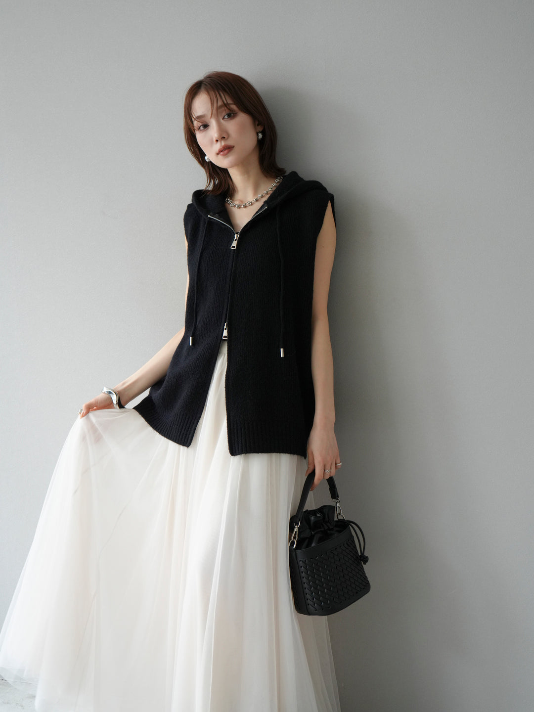 [予約]ノースリーブニットパーカー/ブラック