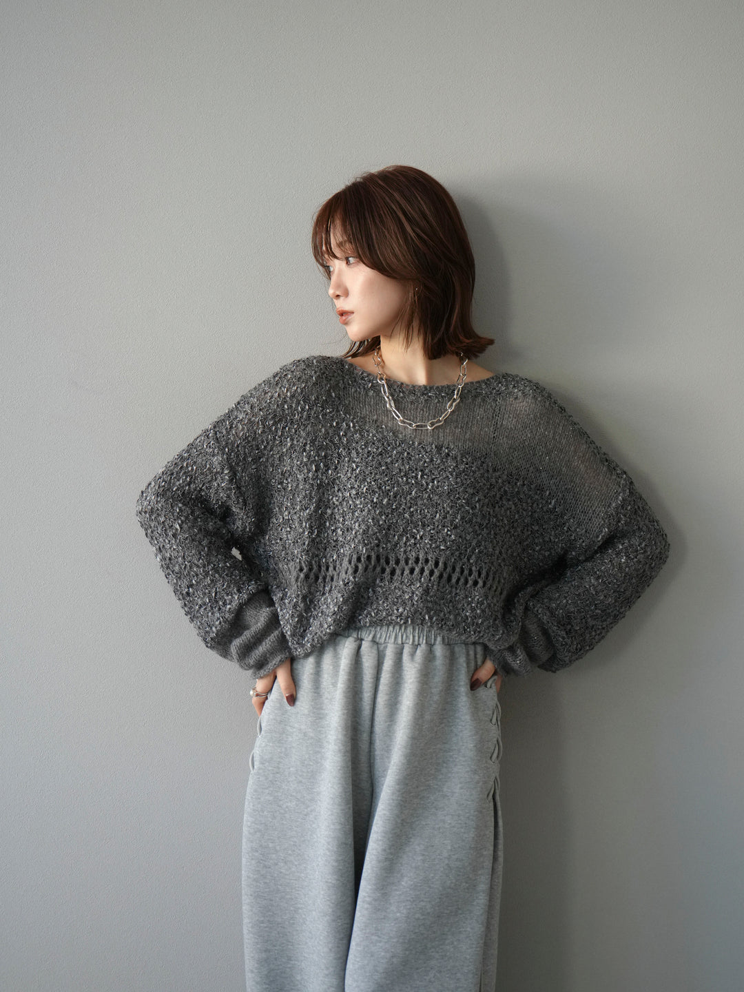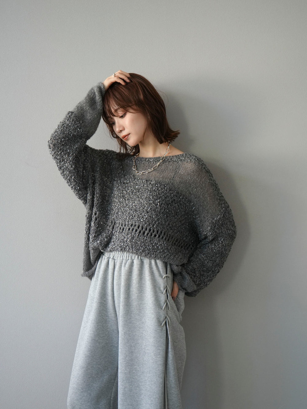 [予約]ミックスヤーンデザイン編みメッシュニットプルオーバー/グレー