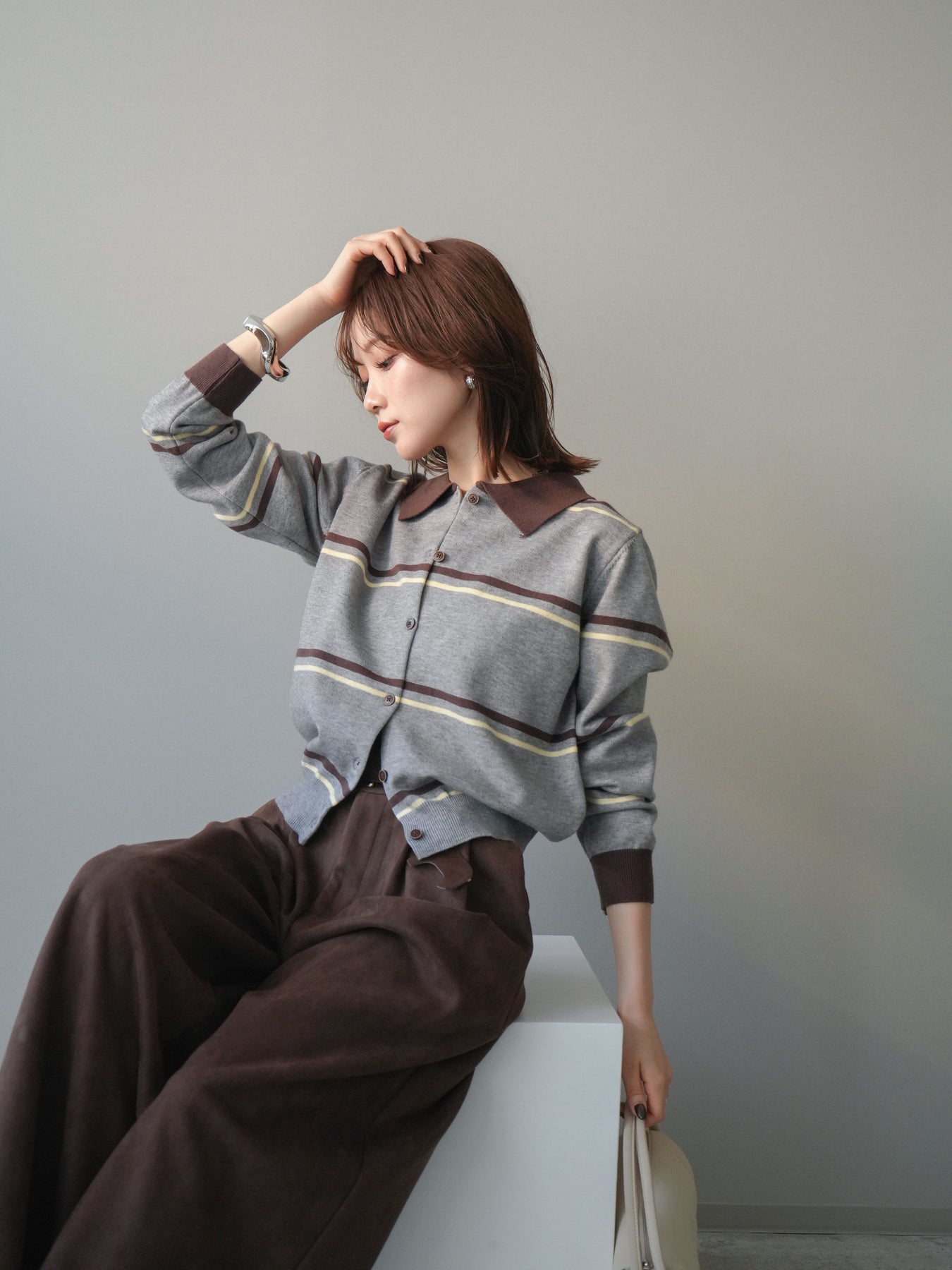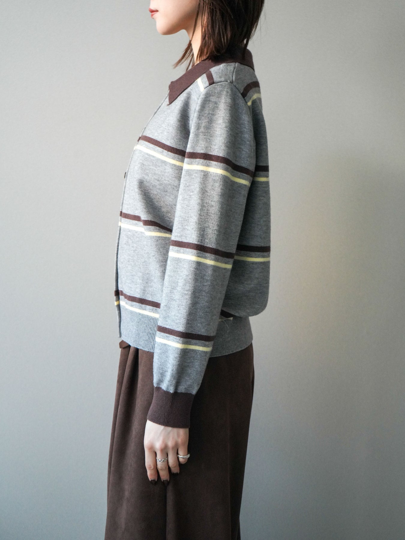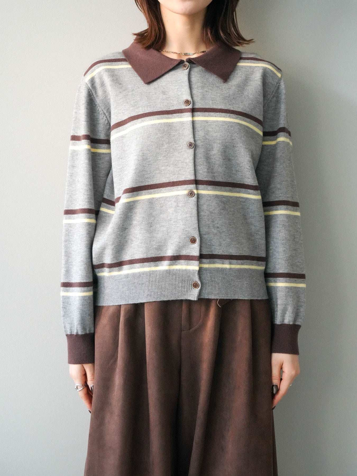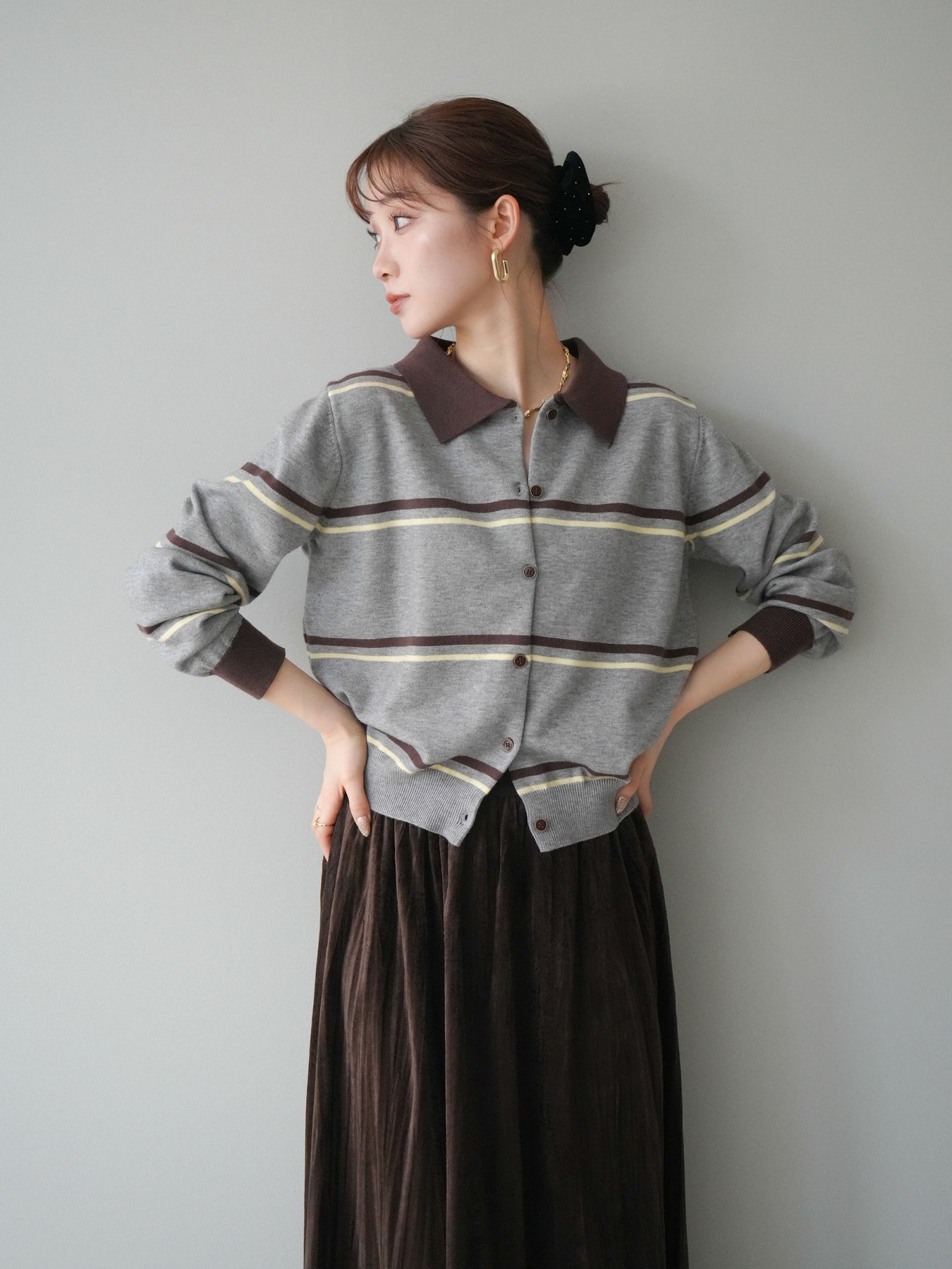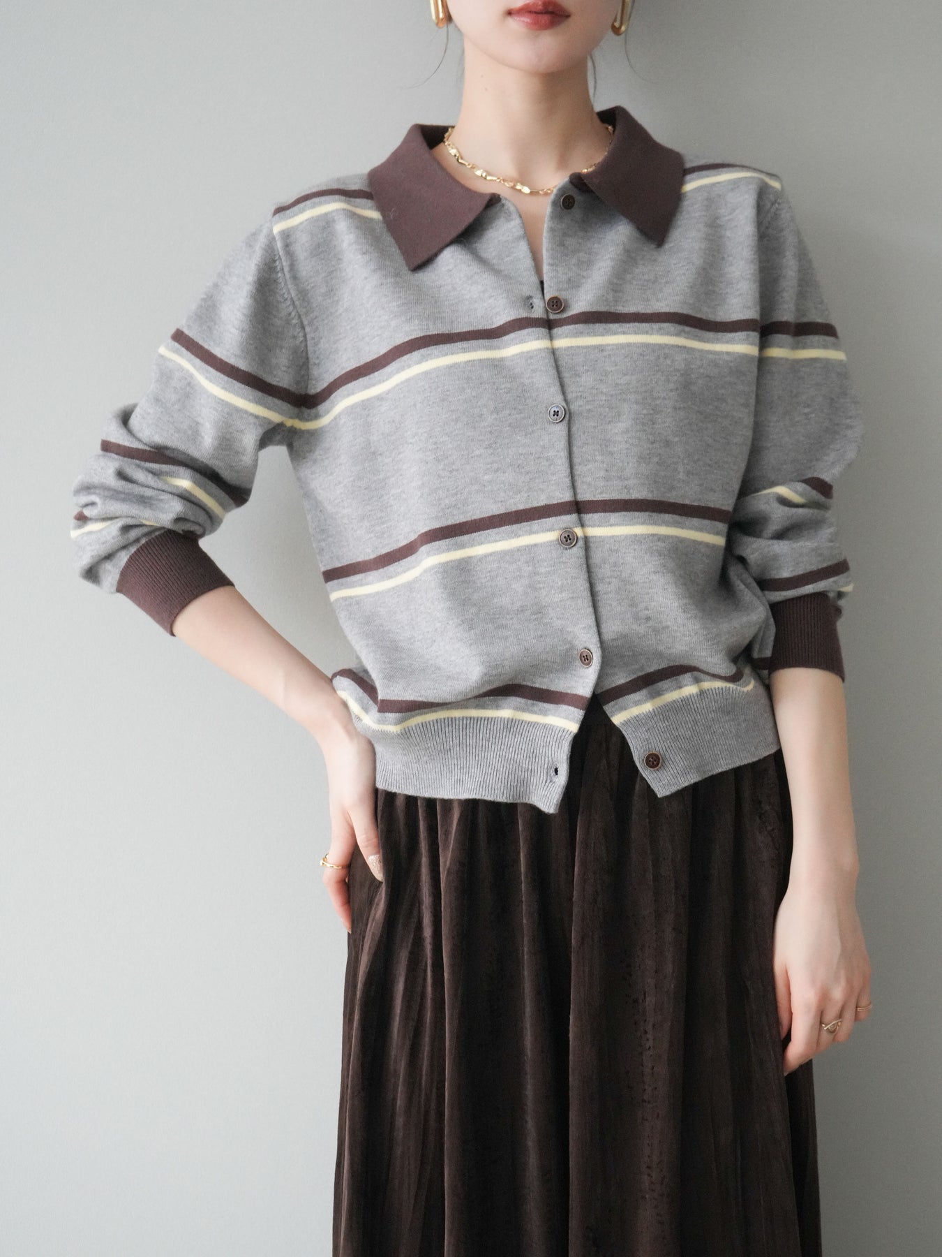[予約]配色マルチボーダーポロニットカーディガン/gray