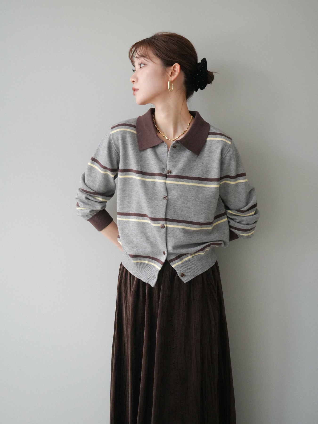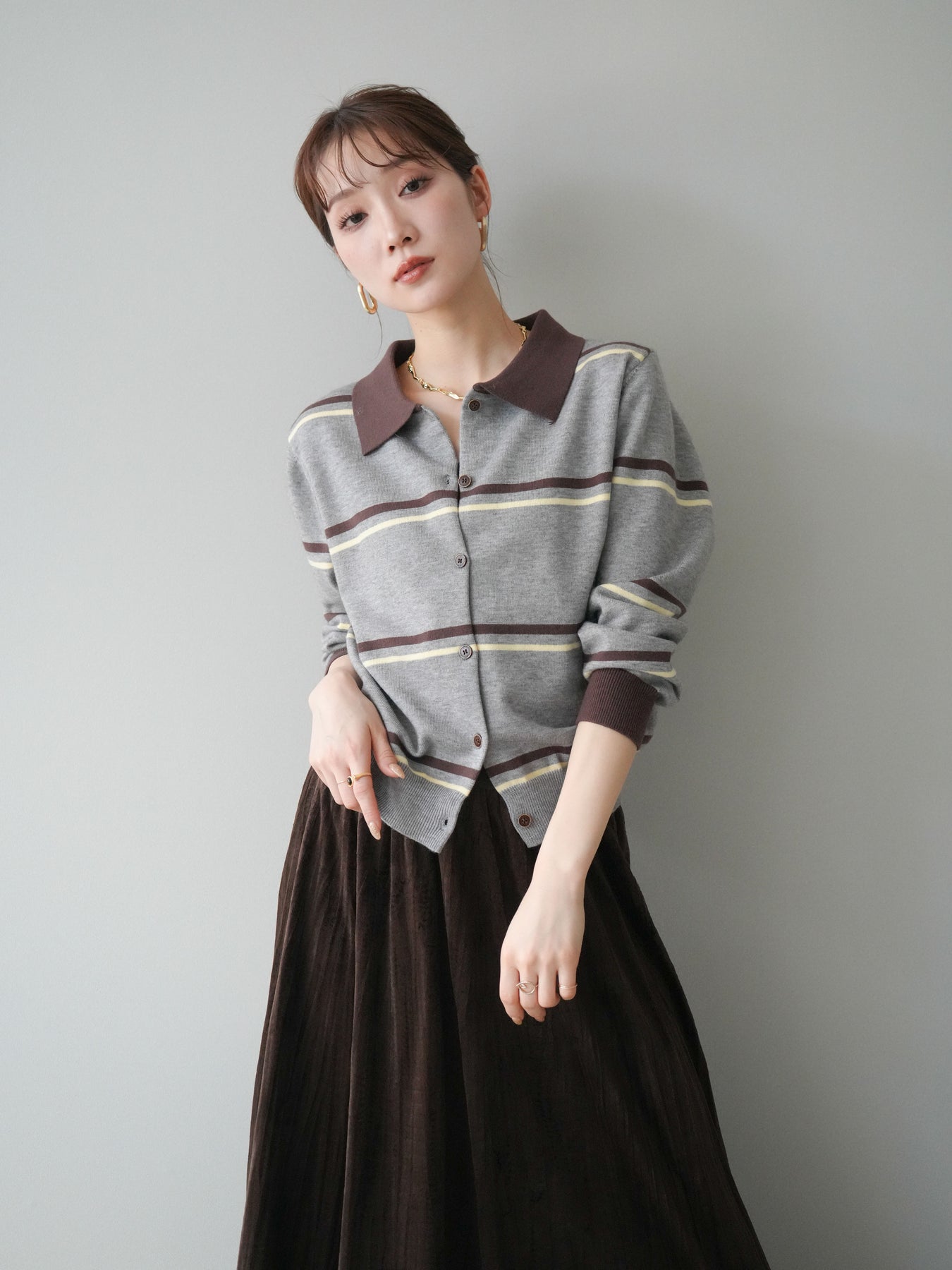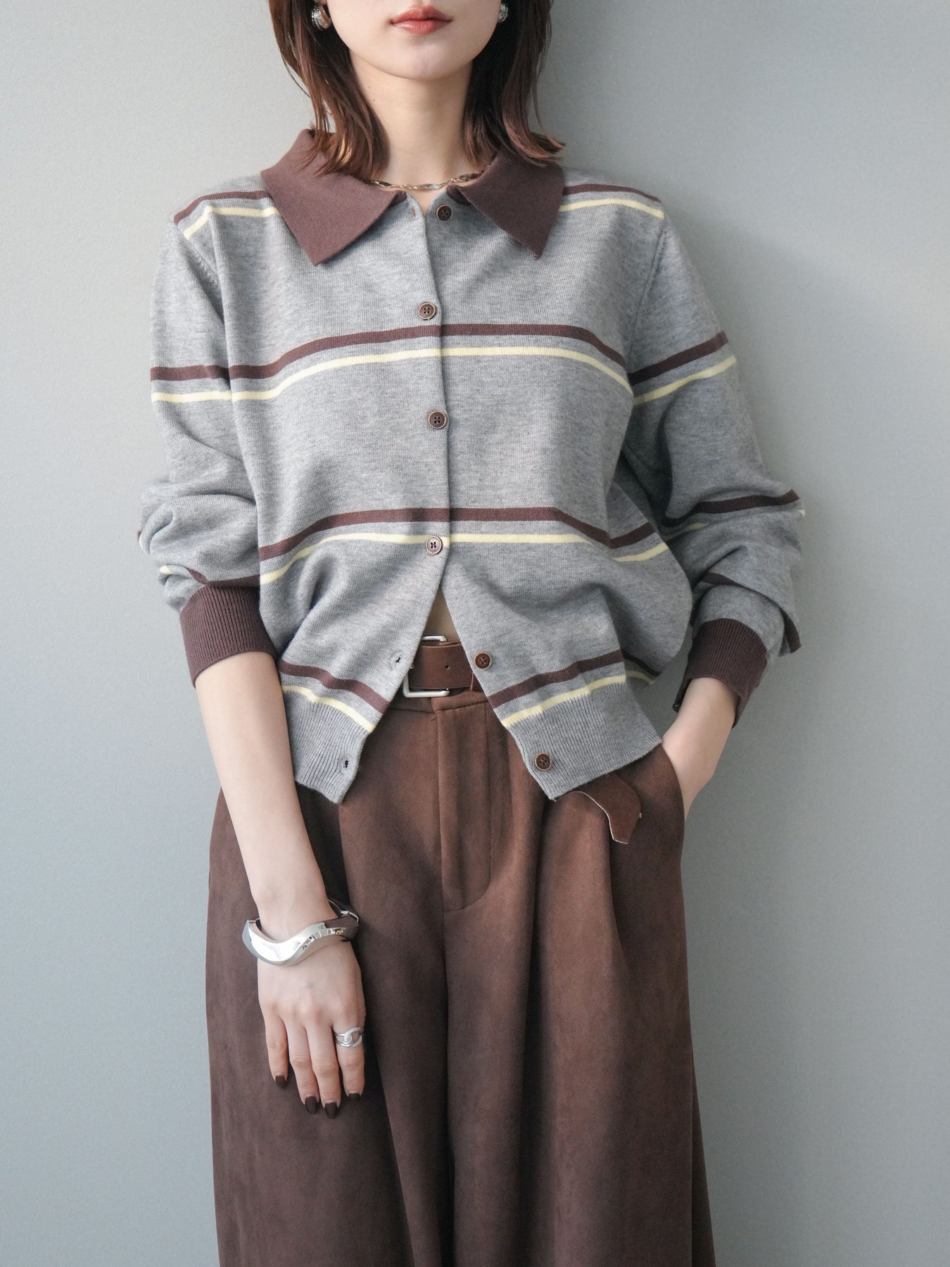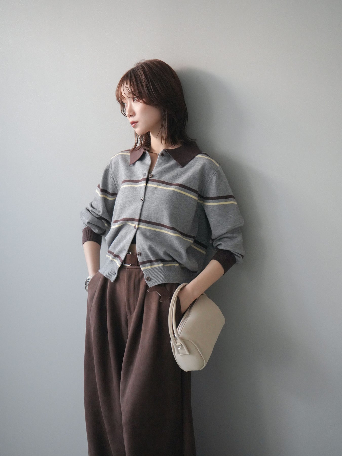 [予約]配色マルチボーダーポロニットカーディガン/gray