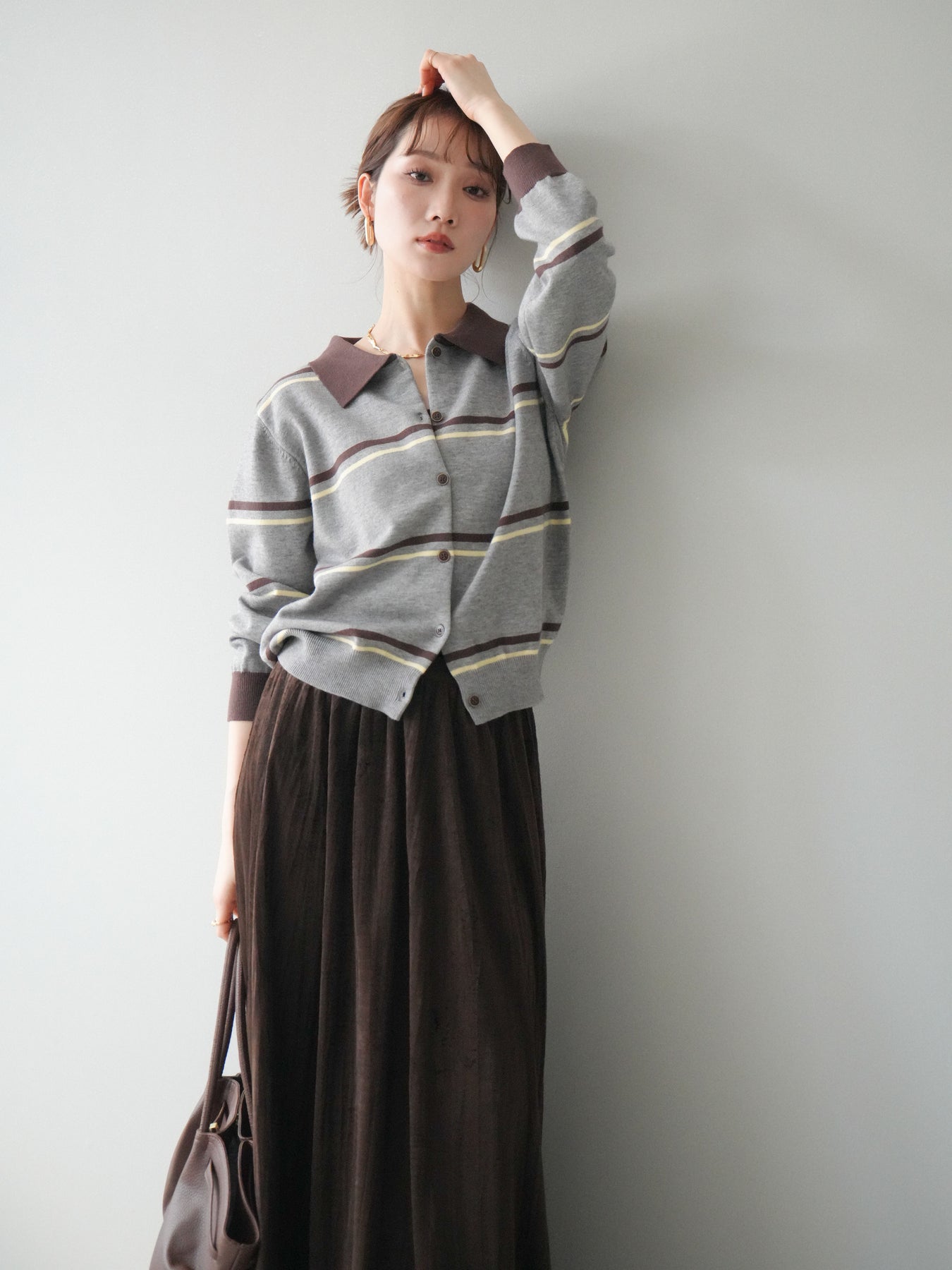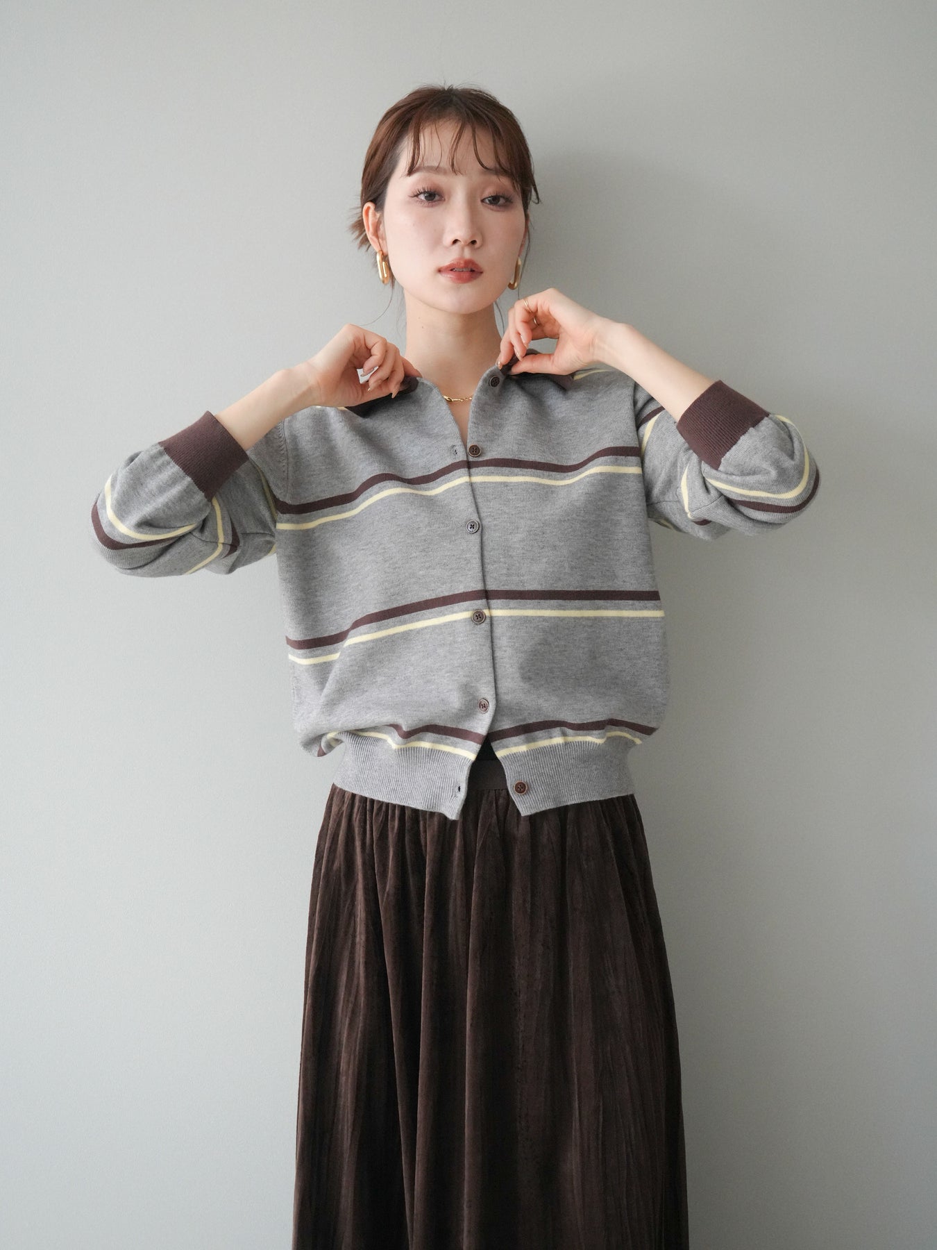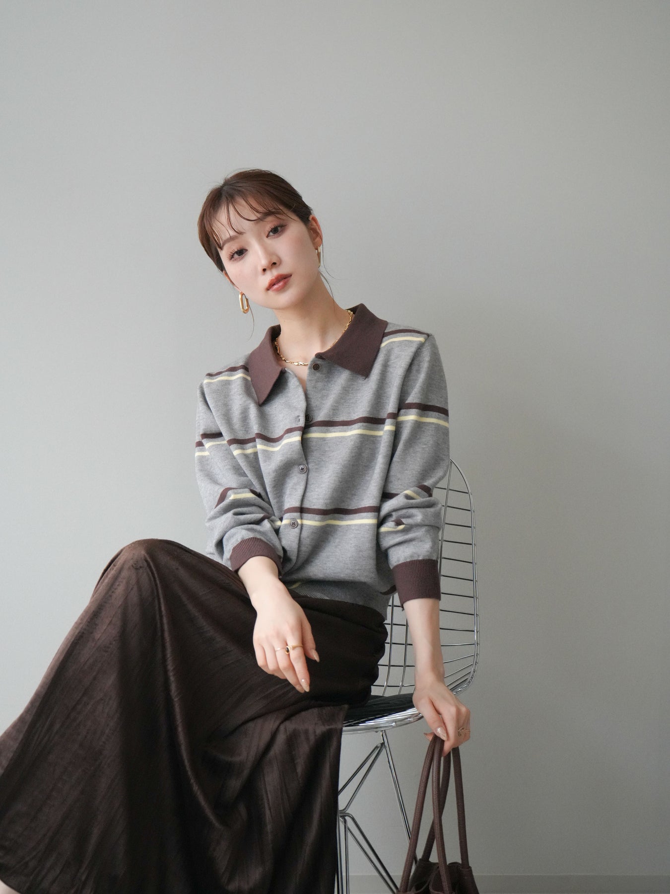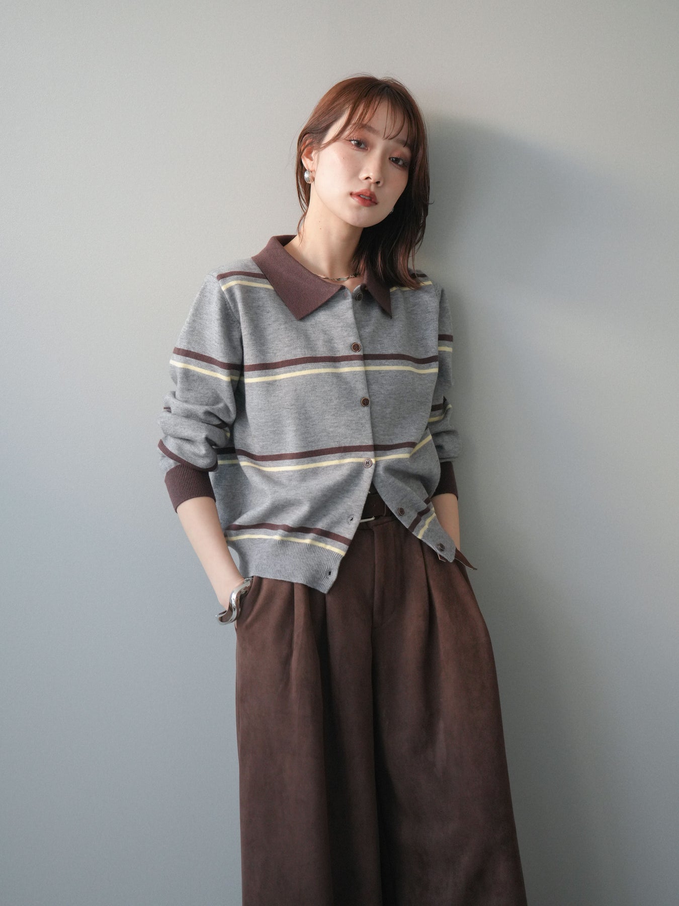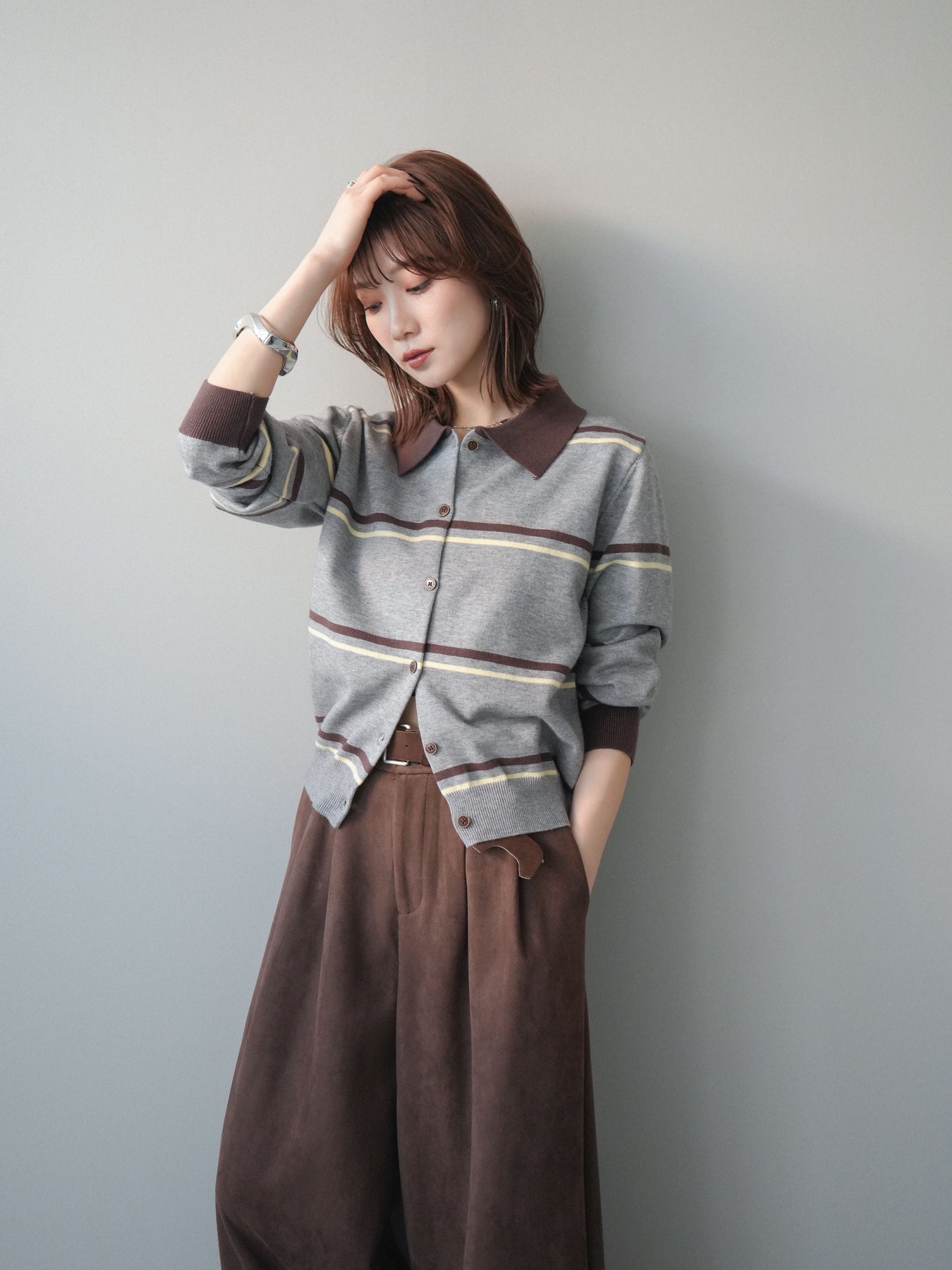 [予約]配色マルチボーダーポロニットカーディガン/gray