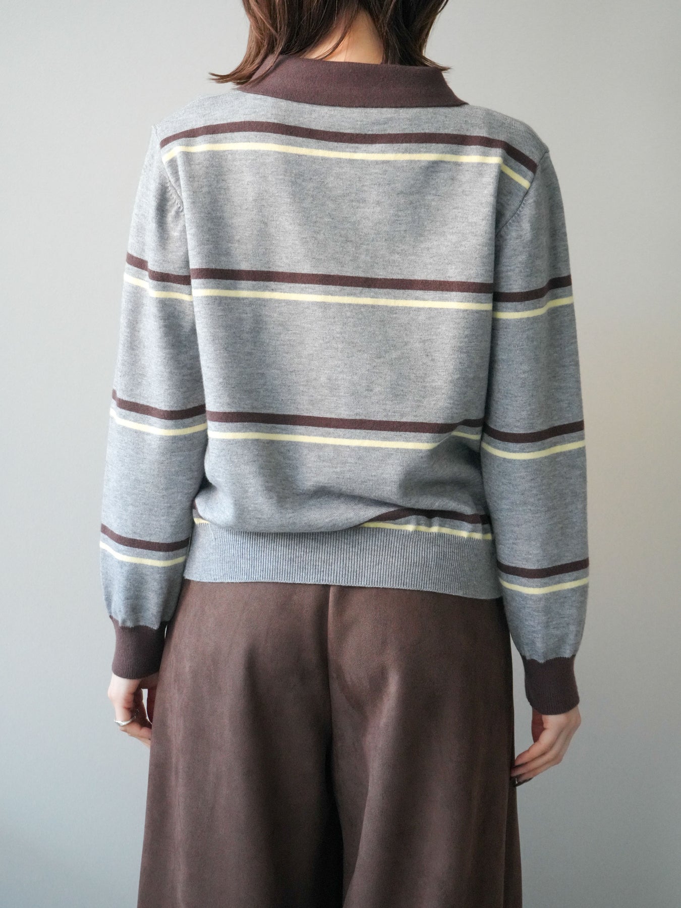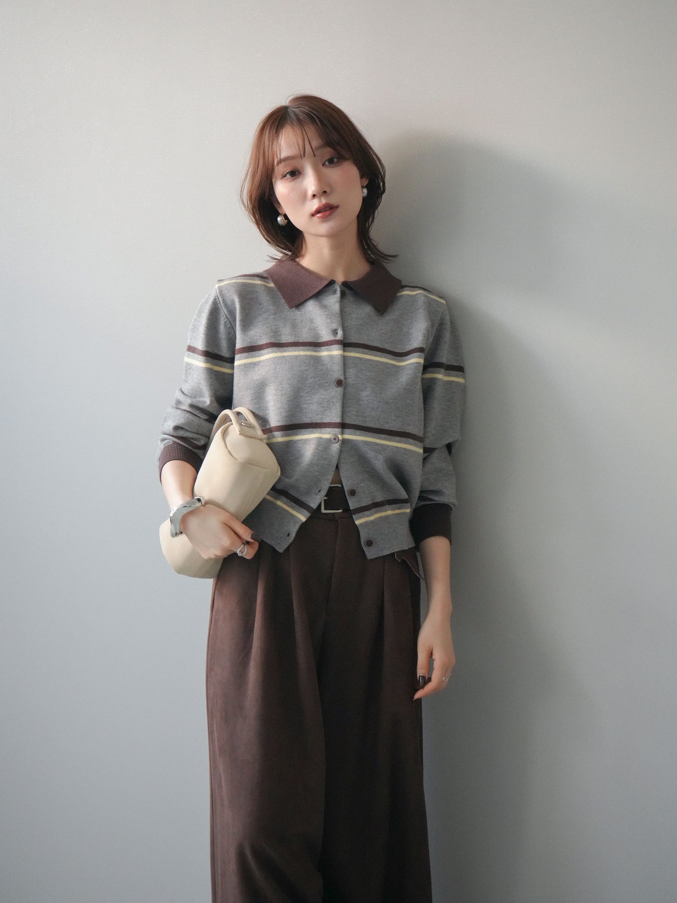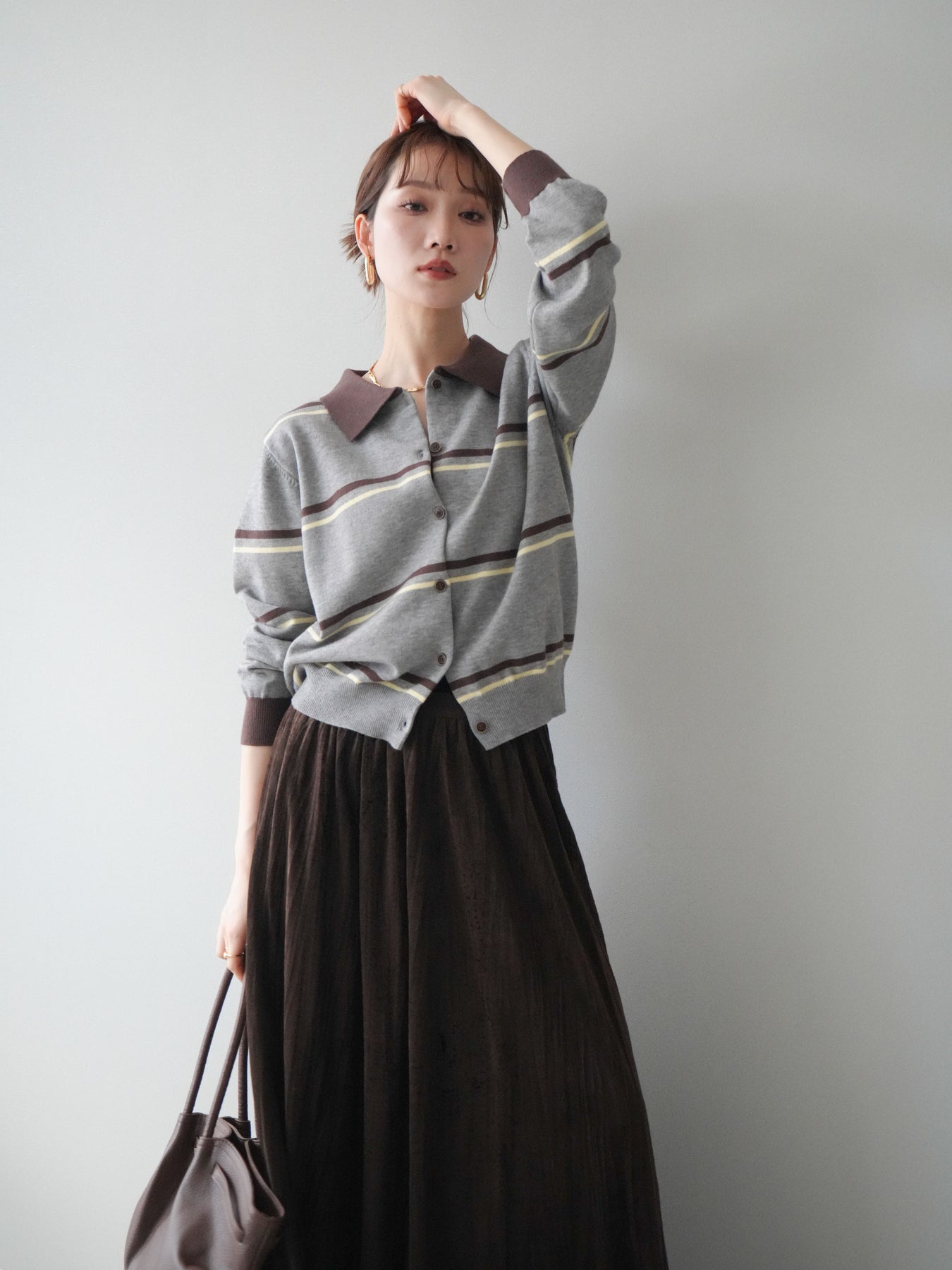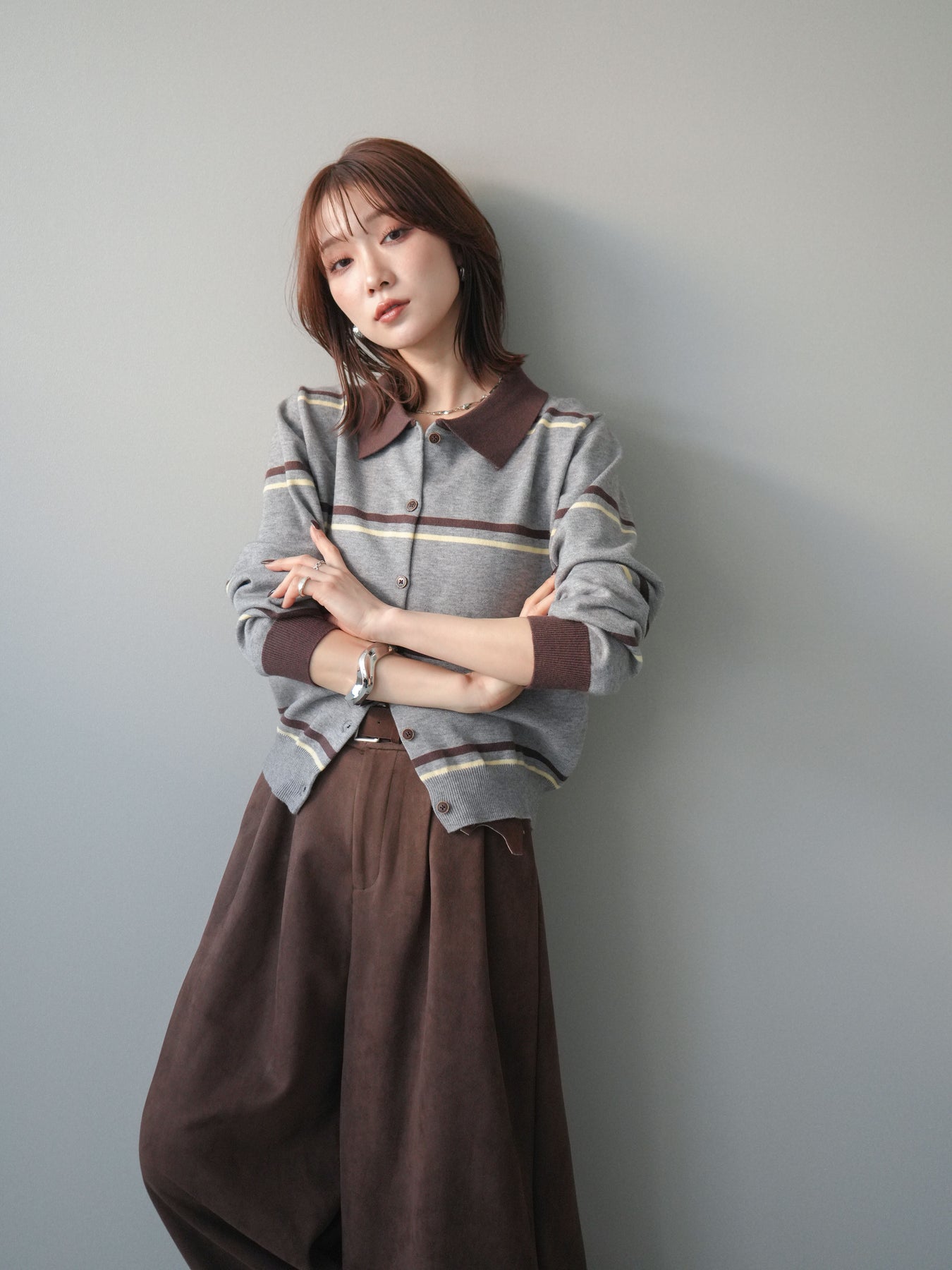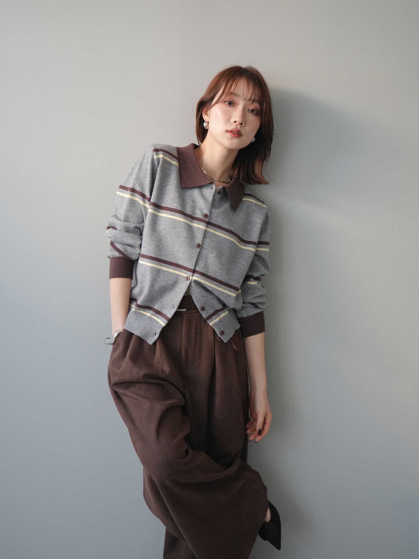 [予約]配色マルチボーダーポロニットカーディガン/gray