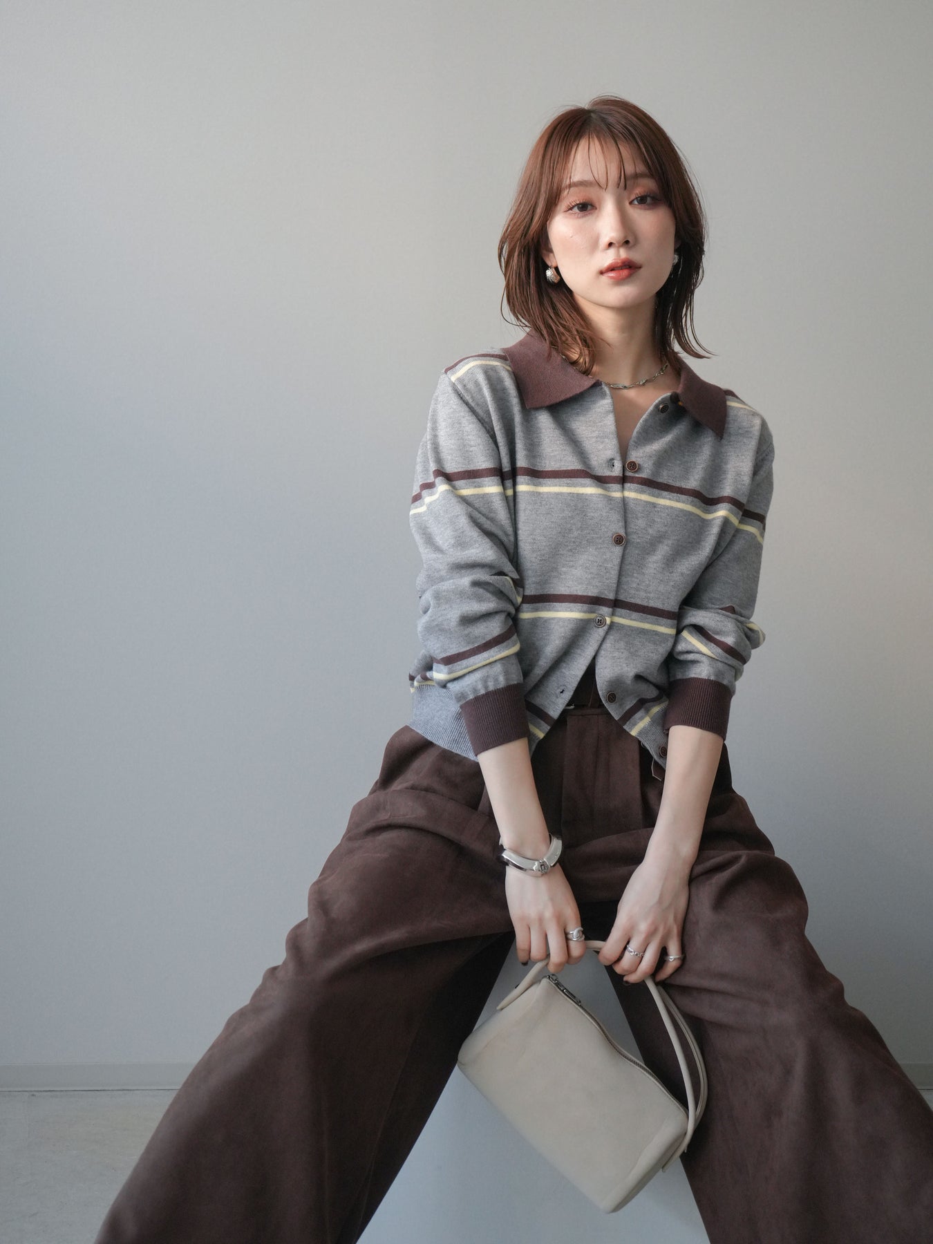配色衿とマルチボーダー柄が目を引く、ポロデザインのニットカーディガン。程よいレトロ感とカジュアルさがミックスされ、羽織りとしてもトップスとしても着映えする一枚です。柔らかく滑らかなタッチで着心地が良く、デイリーに取り入れやすいバランスに仕上げています。コンパクトなシルエットがすっきりと見せてくれ、シンプルなボトムと合わせるだけでスタイリングが決まるアイテム。配色ディテールがさりげないアクセントになり、コーディネートに華やぎを添えてくれます。 ※ボトムス、キャミソール(インナー)以外の商品は一律でインナーは付属していません。