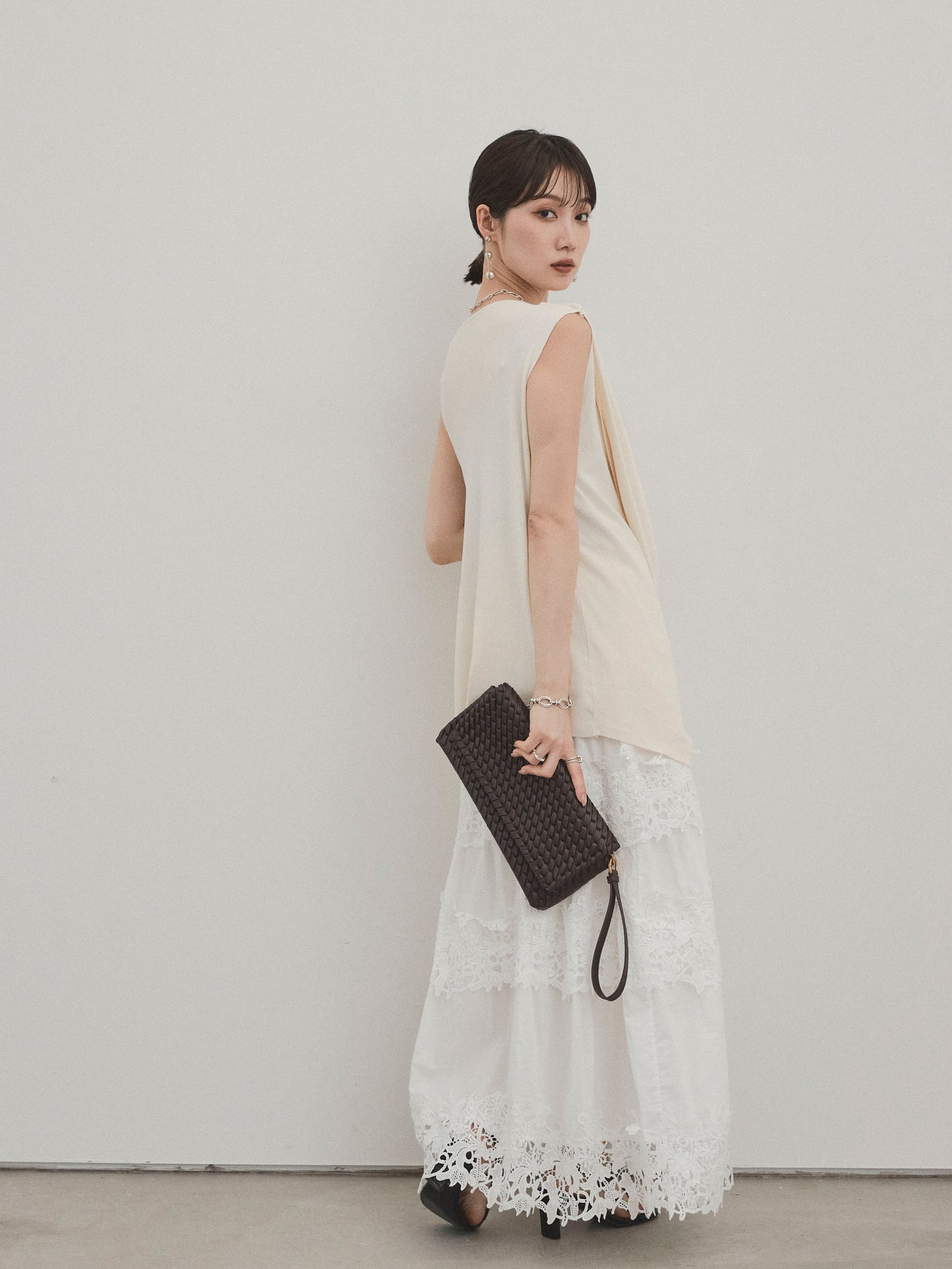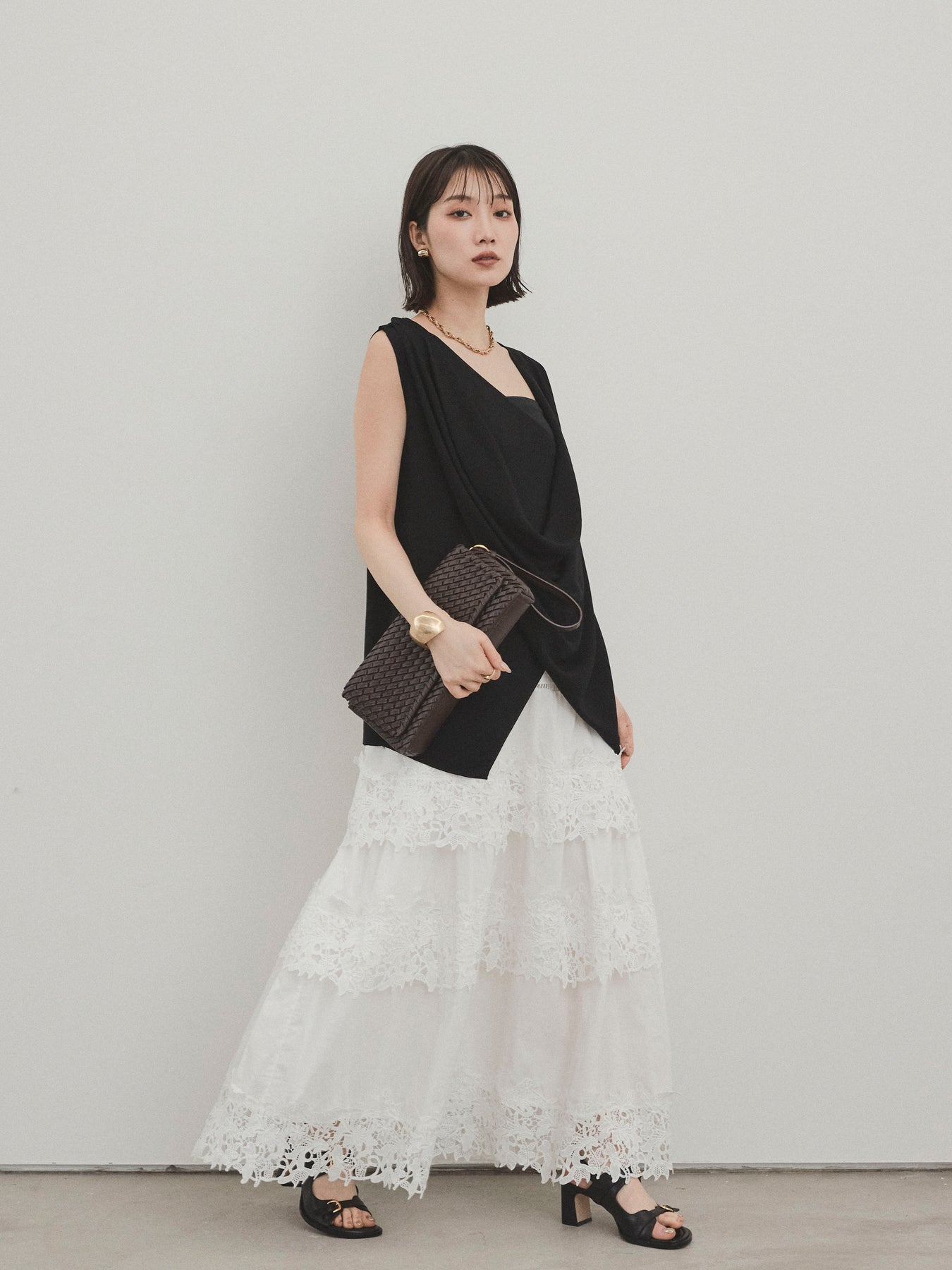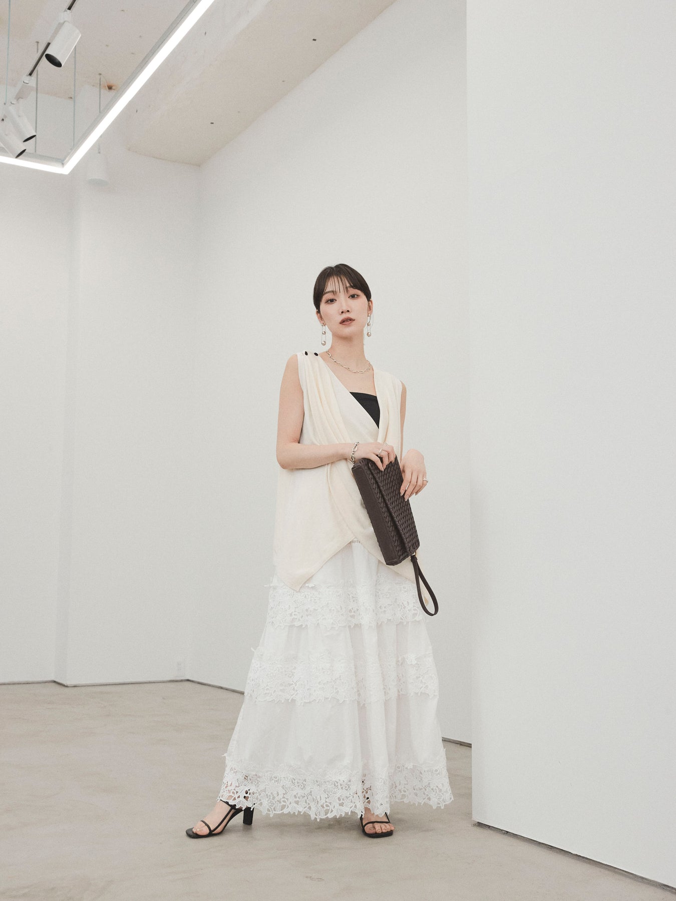 裾にあしらわれたスカラップレースが上品なアクセントになる、大人フェミニンなロングスカート。 繊細なレースの透け感と、柔らかく広がるシルエットが、動きに優雅さを添えてくれます。 落ち感のある素材で縦ラインを強調しつつ、ウエストゴム仕様で穿き心地はストレスフリー。 Tシャツやタンクトップと合わせてカジュアルに、ブラウスやジャケットと合わせてきれいめにも着こなせる、着回し力の高いアイテムです。 シーズン問わず使える素材感で、オンオフ問わず活躍する一枚。 ワードローブに加えておきたい、大人のためのレーススカートです。