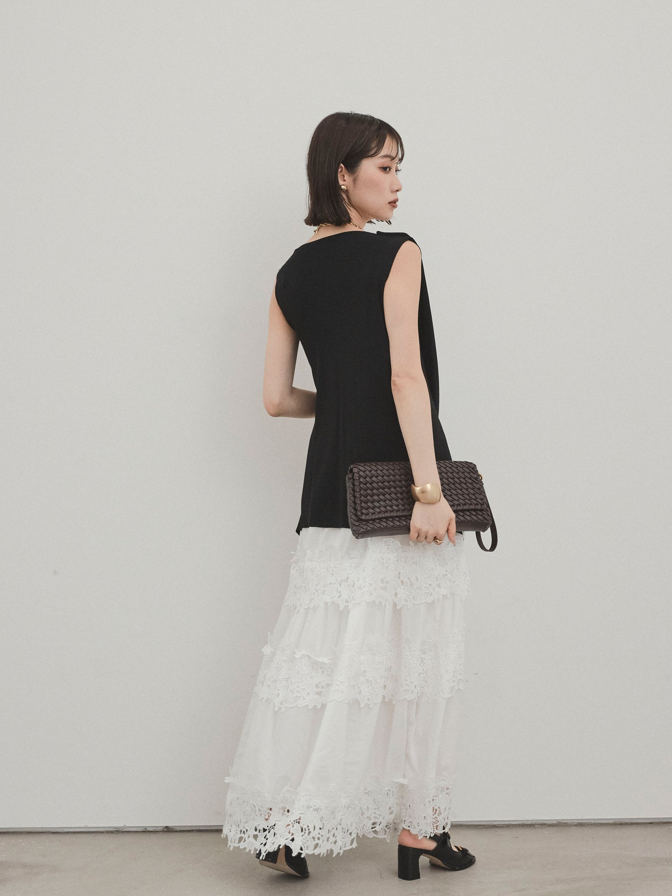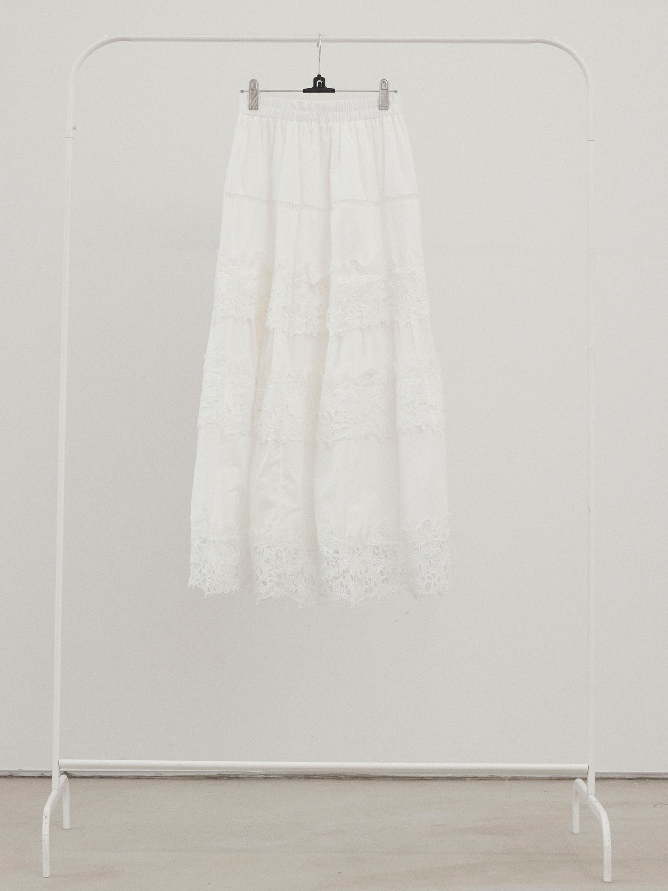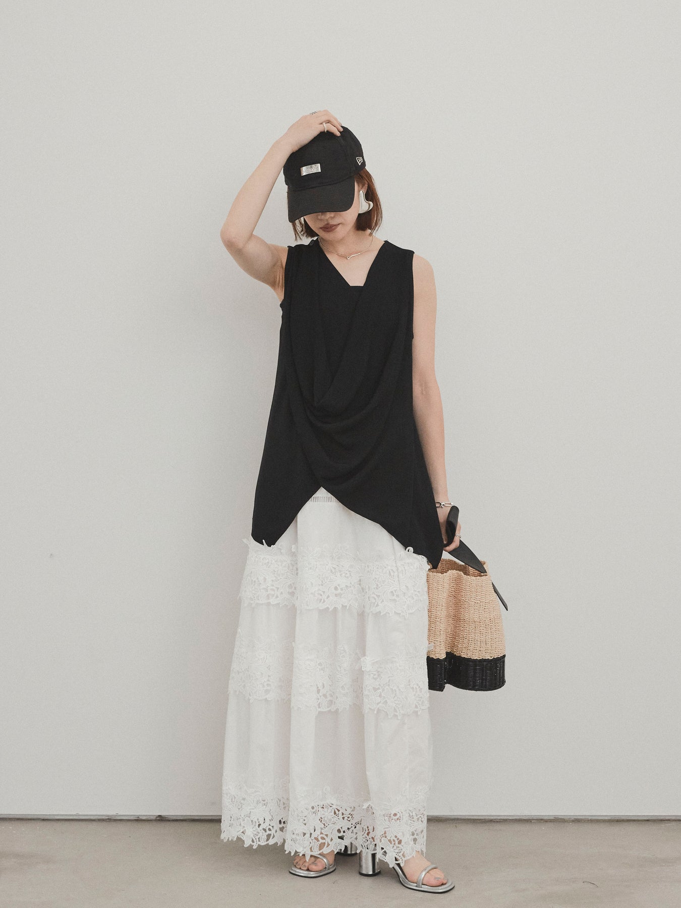 裾にあしらわれたスカラップレースが上品なアクセントになる、大人フェミニンなロングスカート。 繊細なレースの透け感と、柔らかく広がるシルエットが、動きに優雅さを添えてくれます。 落ち感のある素材で縦ラインを強調しつつ、ウエストゴム仕様で穿き心地はストレスフリー。 Tシャツやタンクトップと合わせてカジュアルに、ブラウスやジャケットと合わせてきれいめにも着こなせる、着回し力の高いアイテムです。 シーズン問わず使える素材感で、オンオフ問わず活躍する一枚。 ワードローブに加えておきたい、大人のためのレーススカートです。