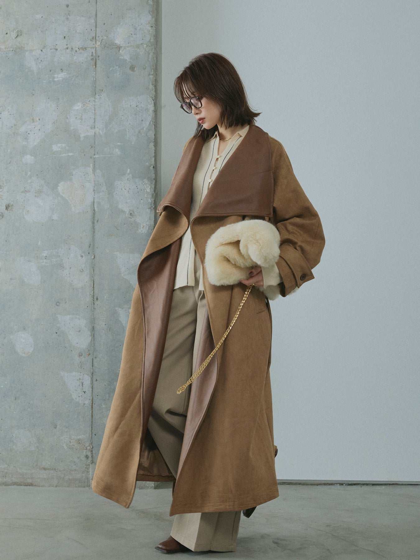 しなやかなスウェード調素材とフェイクレザーを組み合わせた、上品なムード漂うロングコート。 異素材のコントラストが洗練された印象を与え、羽織るだけでスタイルが完成する存在感のある一枚です。 ゆったりとしたシルエットながらも、落ち感のある生地が身体のラインを美しく見せ、抜け感のある大人の雰囲気を演出。 柔らかな質感で軽く羽織れるため、季節の変わり目にも活躍します。 デイリーから特別なシーンまで、幅広いスタイリングにマッチする主役アウターです。 ※ボトムス、キャミソール(インナー)以外の商品は一律でインナーは付属していません。
