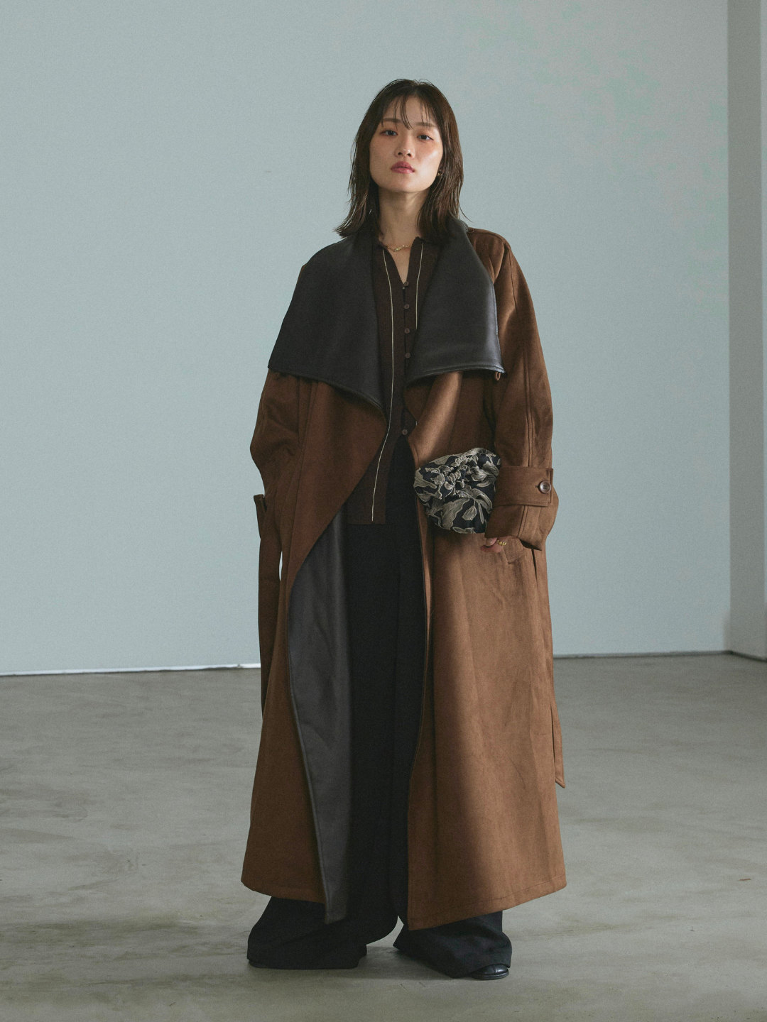 しなやかなスウェード調素材とフェイクレザーを組み合わせた、上品なムード漂うロングコート。 異素材のコントラストが洗練された印象を与え、羽織るだけでスタイルが完成する存在感のある一枚です。 ゆったりとしたシルエットながらも、落ち感のある生地が身体のラインを美しく見せ、抜け感のある大人の雰囲気を演出。 柔らかな質感で軽く羽織れるため、季節の変わり目にも活躍します。 デイリーから特別なシーンまで、幅広いスタイリングにマッチする主役アウターです。 ※ボトムス、キャミソール(インナー)以外の商品は一律でインナーは付属していません。