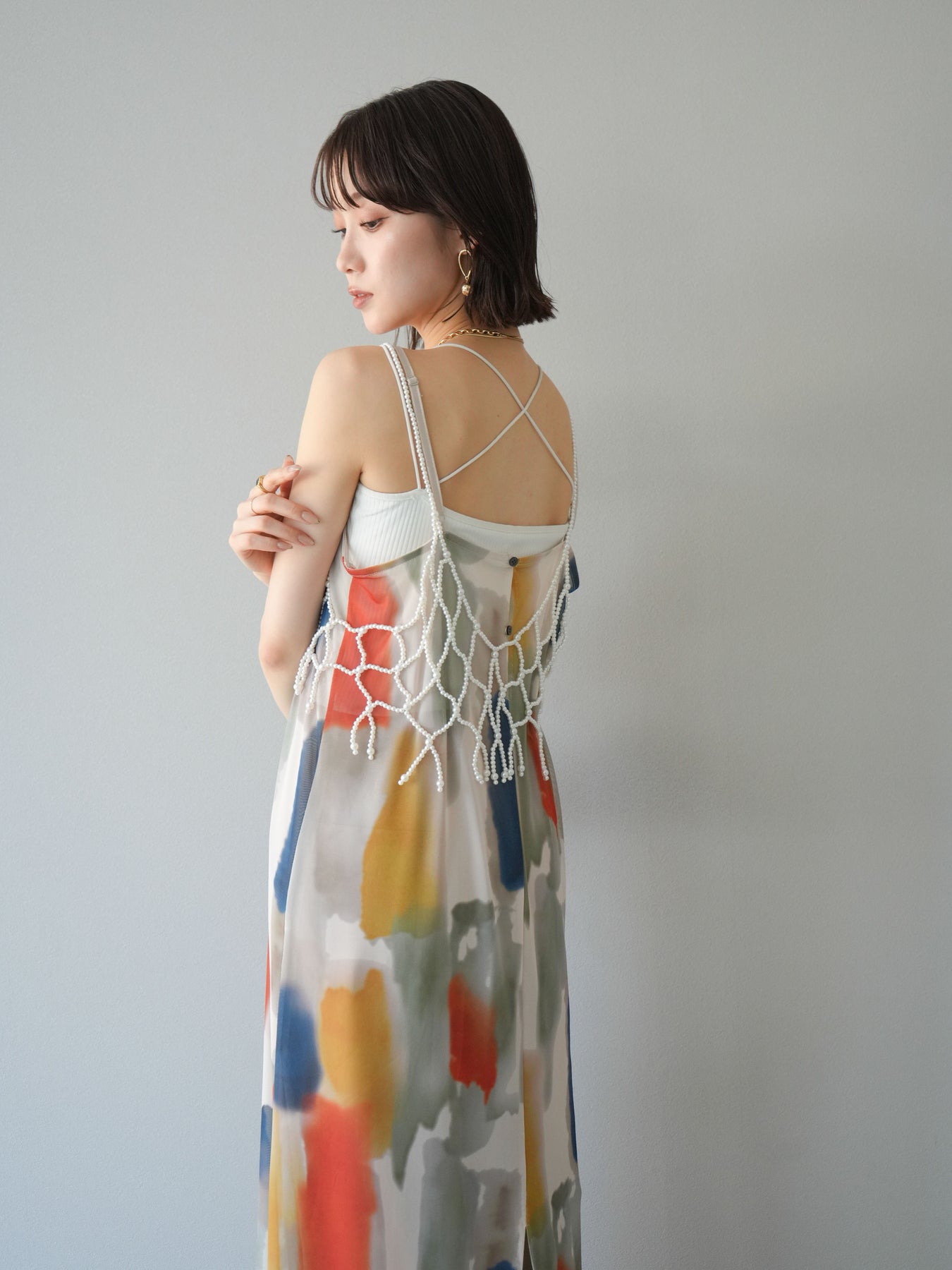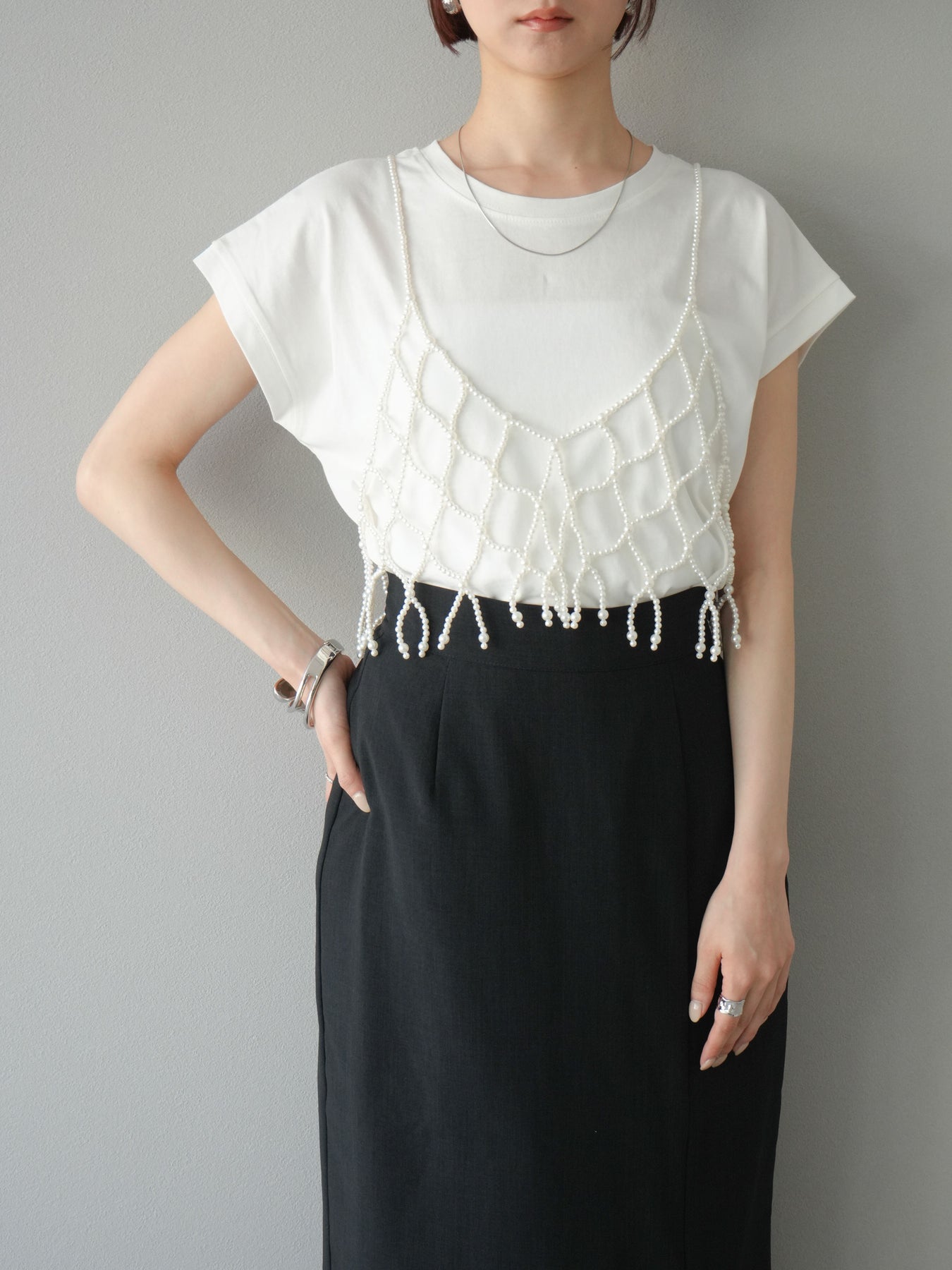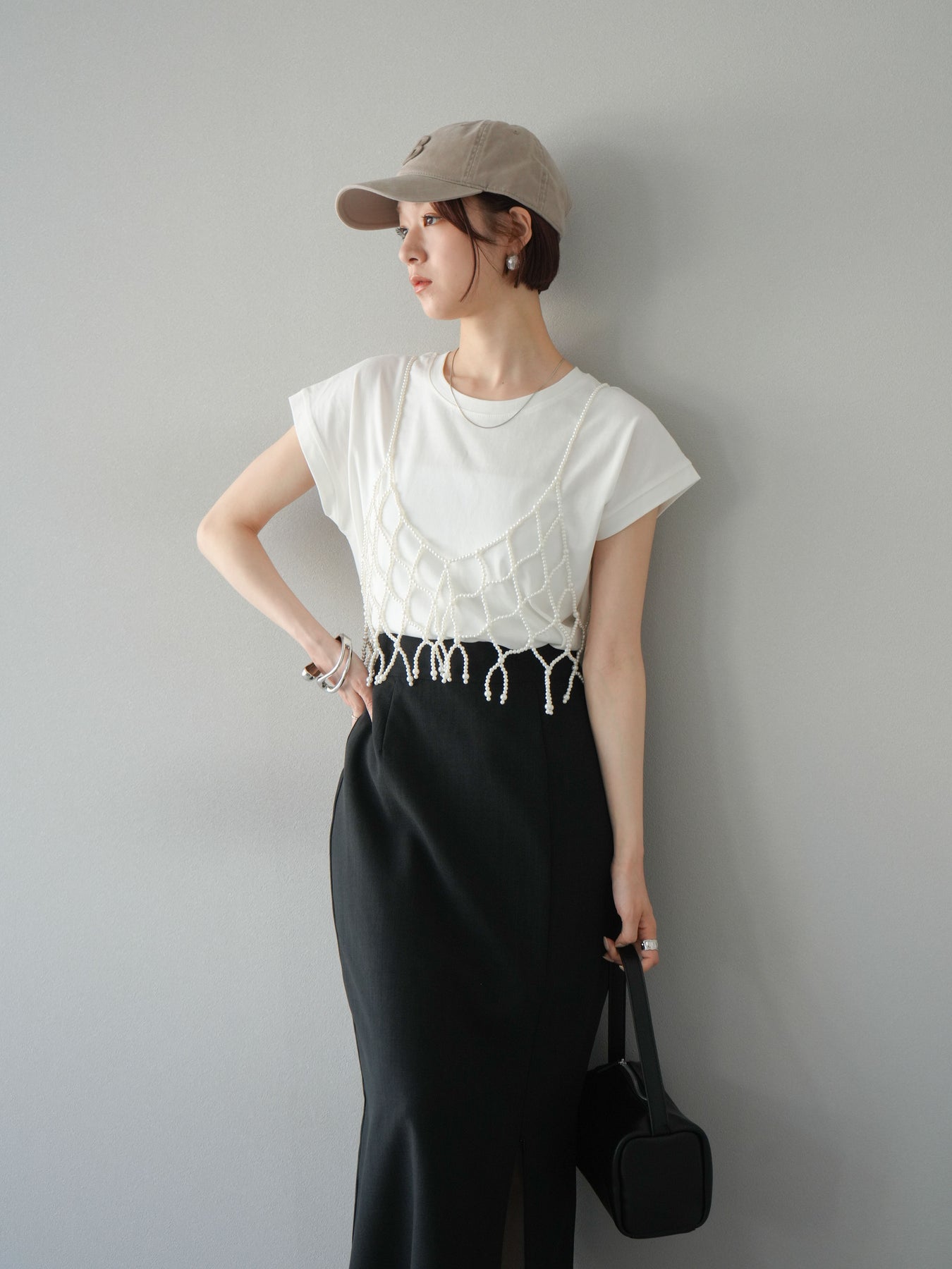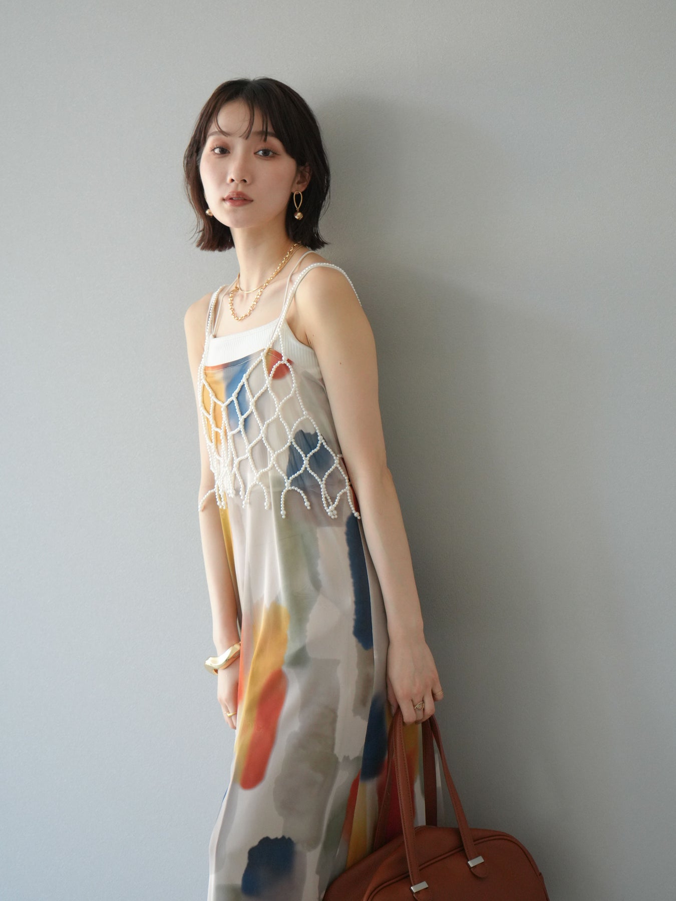立体的なビーズデザインが目を惹く、モード感漂うビーズビスチェ。繊細なビーズを編み込んだ華やかなデザインは、シンプルなスタイリングに重ねるだけで主役級の存在感を放ちます。華奢なストラップと程よい透け感が抜け感を演出し、トレンド感のあるレイヤードスタイルが楽しめる一枚。Tシャツやワンピース、シャツの上から重ねて、いつものスタイリングをぐっとアップデートしてくれるアイテムです。 ※ボトムス、キャミソール(インナー)以外の商品は一律でインナーは付属していません。