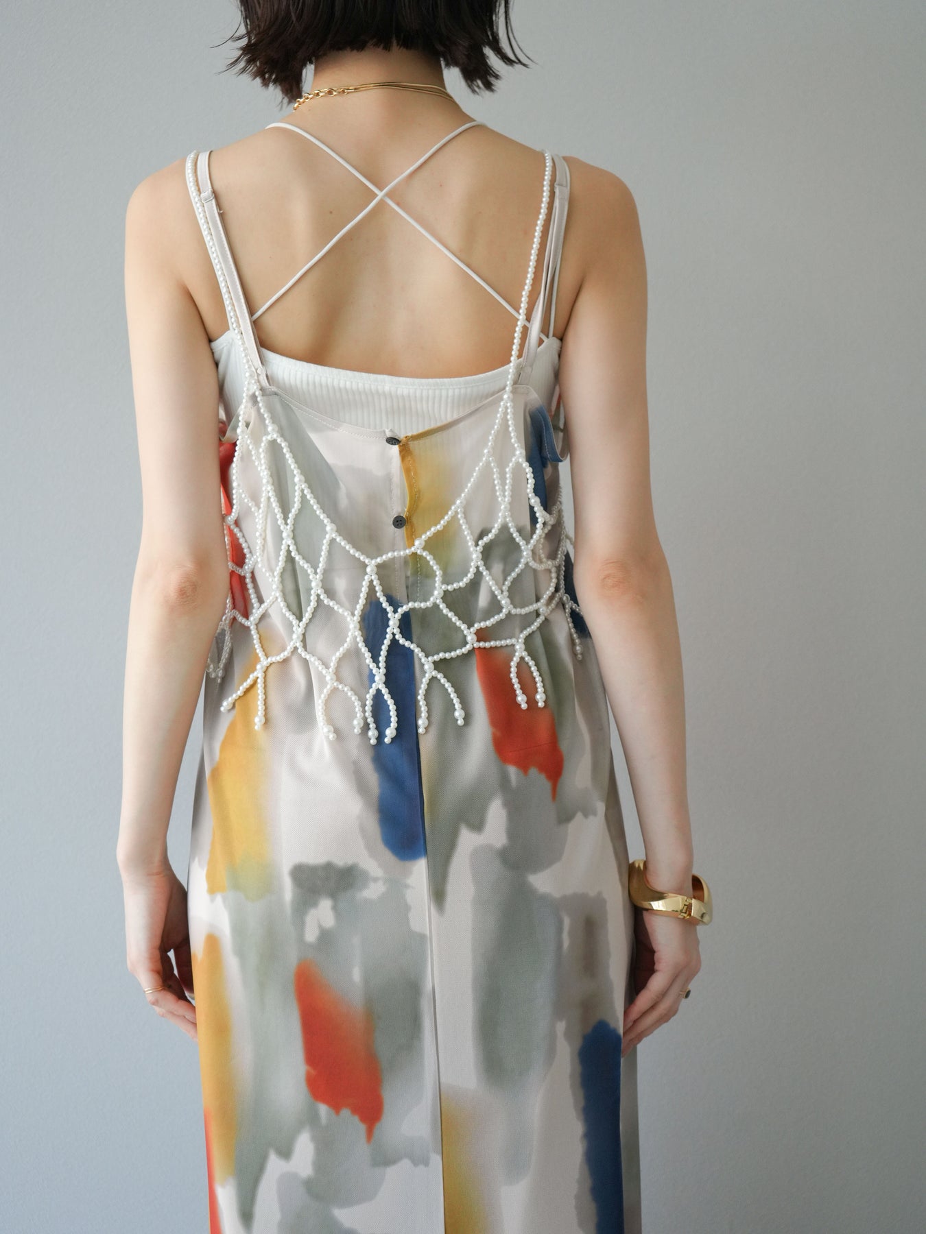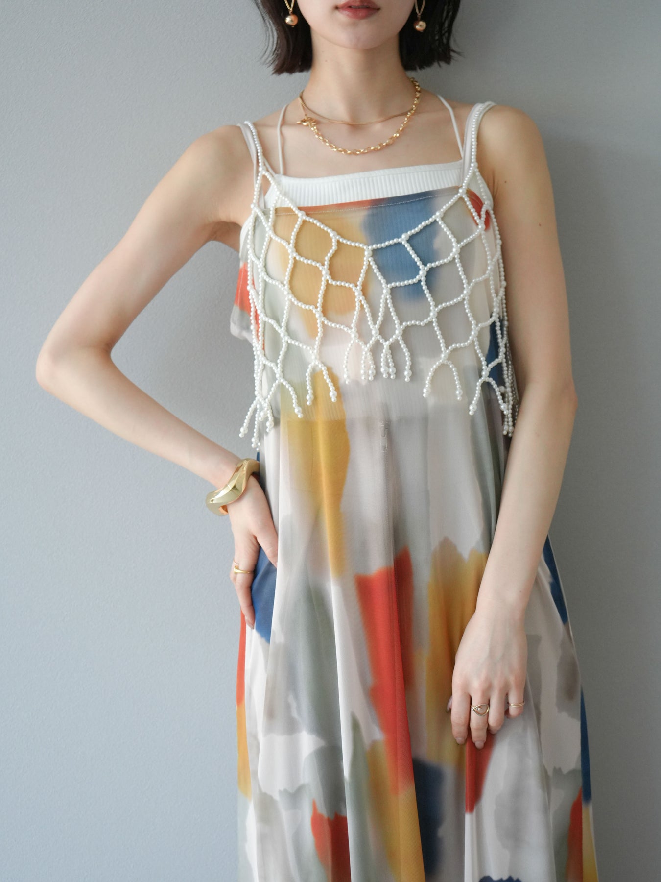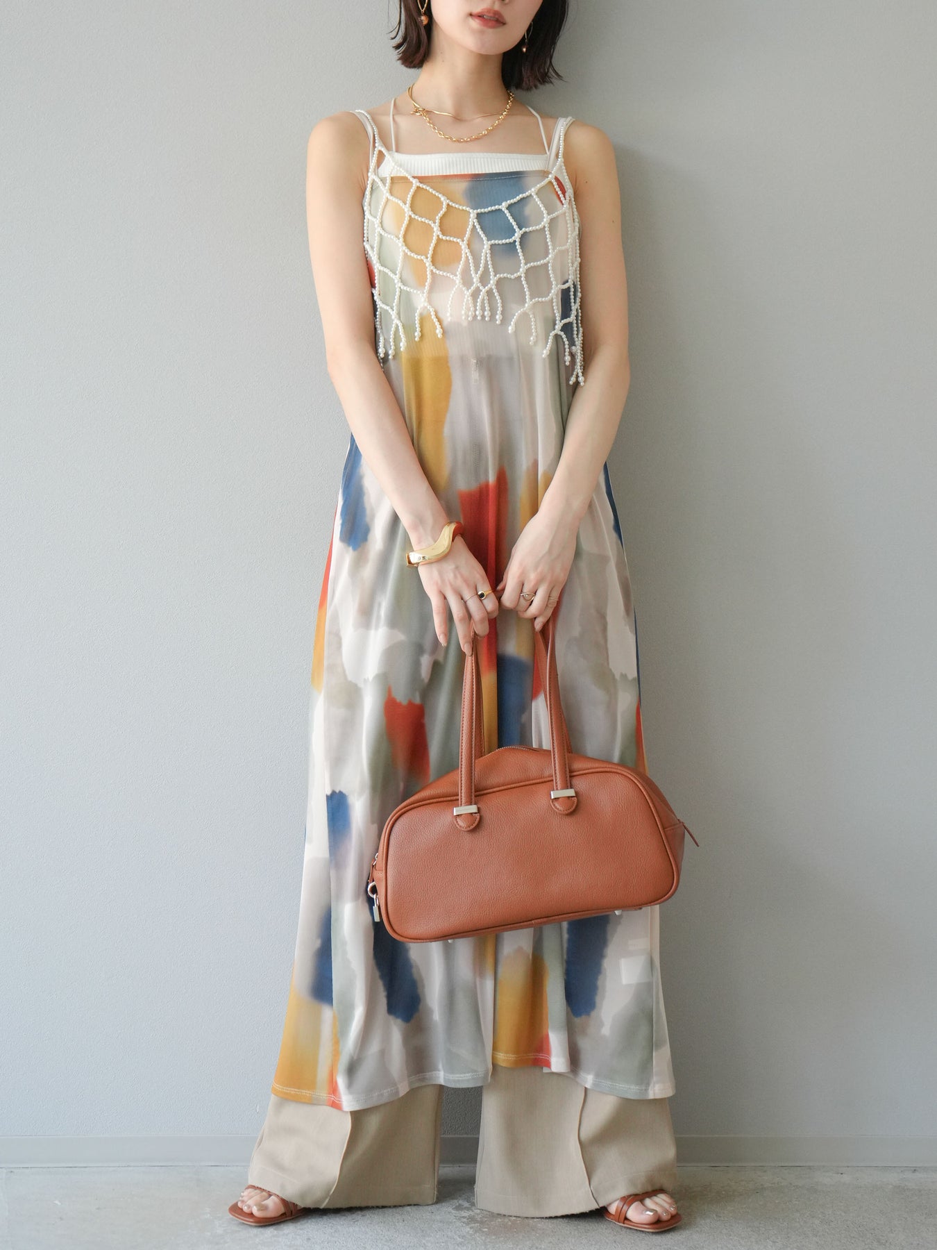 立体的なビーズデザインが目を惹く、モード感漂うビーズビスチェ。繊細なビーズを編み込んだ華やかなデザインは、シンプルなスタイリングに重ねるだけで主役級の存在感を放ちます。華奢なストラップと程よい透け感が抜け感を演出し、トレンド感のあるレイヤードスタイルが楽しめる一枚。Tシャツやワンピース、シャツの上から重ねて、いつものスタイリングをぐっとアップデートしてくれるアイテムです。 ※ボトムス、キャミソール(インナー)以外の商品は一律でインナーは付属していません。
