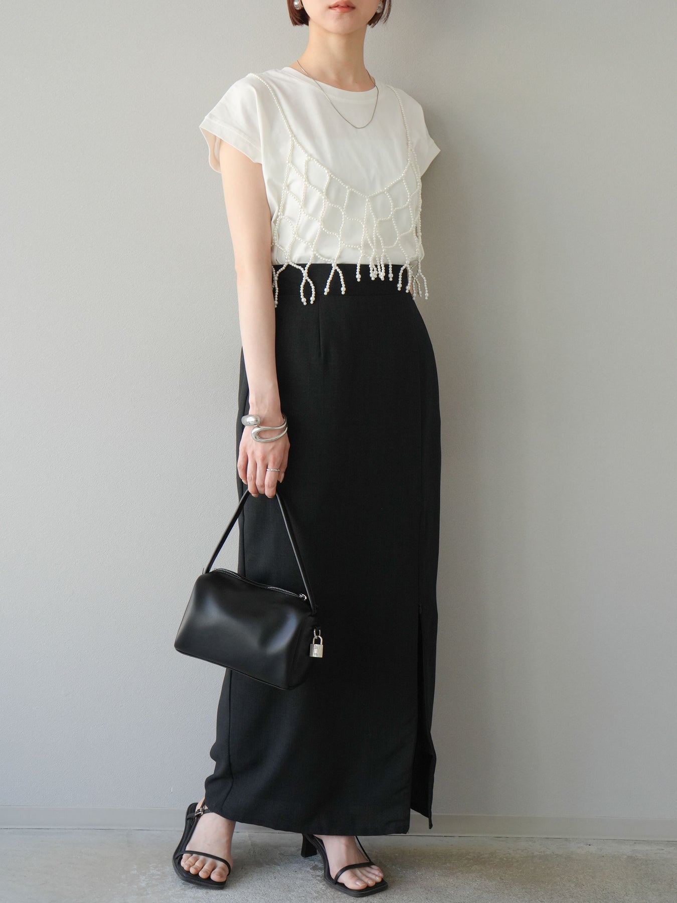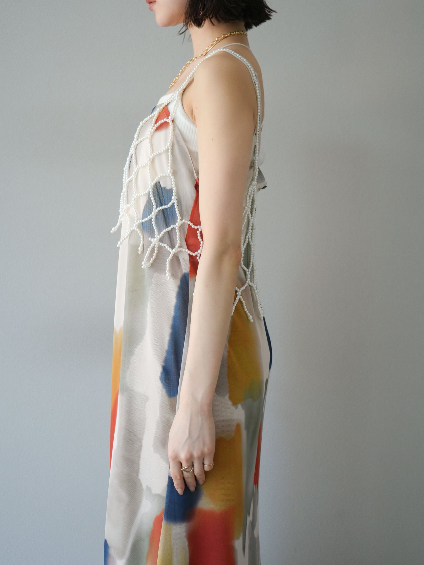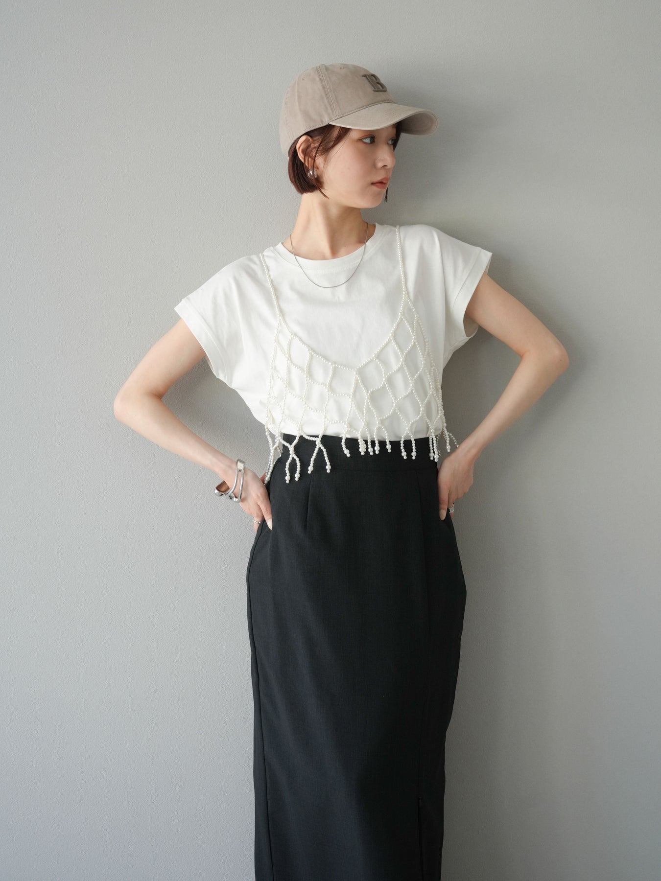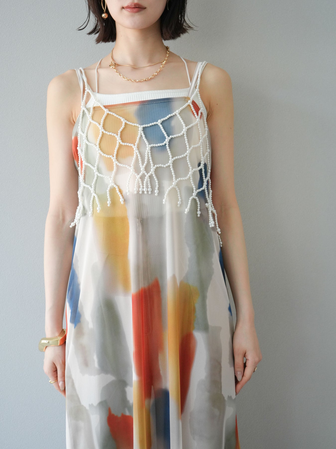 立体的なビーズデザインが目を惹く、モード感漂うビーズビスチェ。繊細なビーズを編み込んだ華やかなデザインは、シンプルなスタイリングに重ねるだけで主役級の存在感を放ちます。華奢なストラップと程よい透け感が抜け感を演出し、トレンド感のあるレイヤードスタイルが楽しめる一枚。Tシャツやワンピース、シャツの上から重ねて、いつものスタイリングをぐっとアップデートしてくれるアイテムです。 ※ボトムス、キャミソール(インナー)以外の商品は一律でインナーは付属していません。