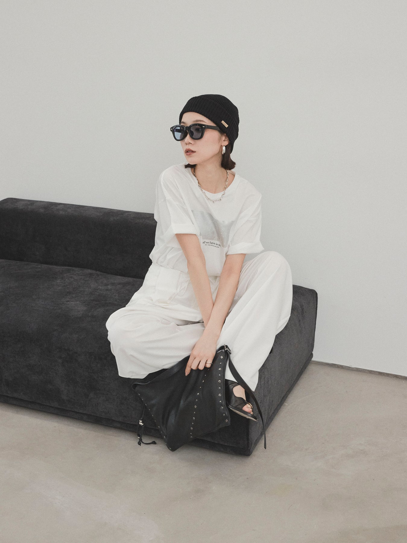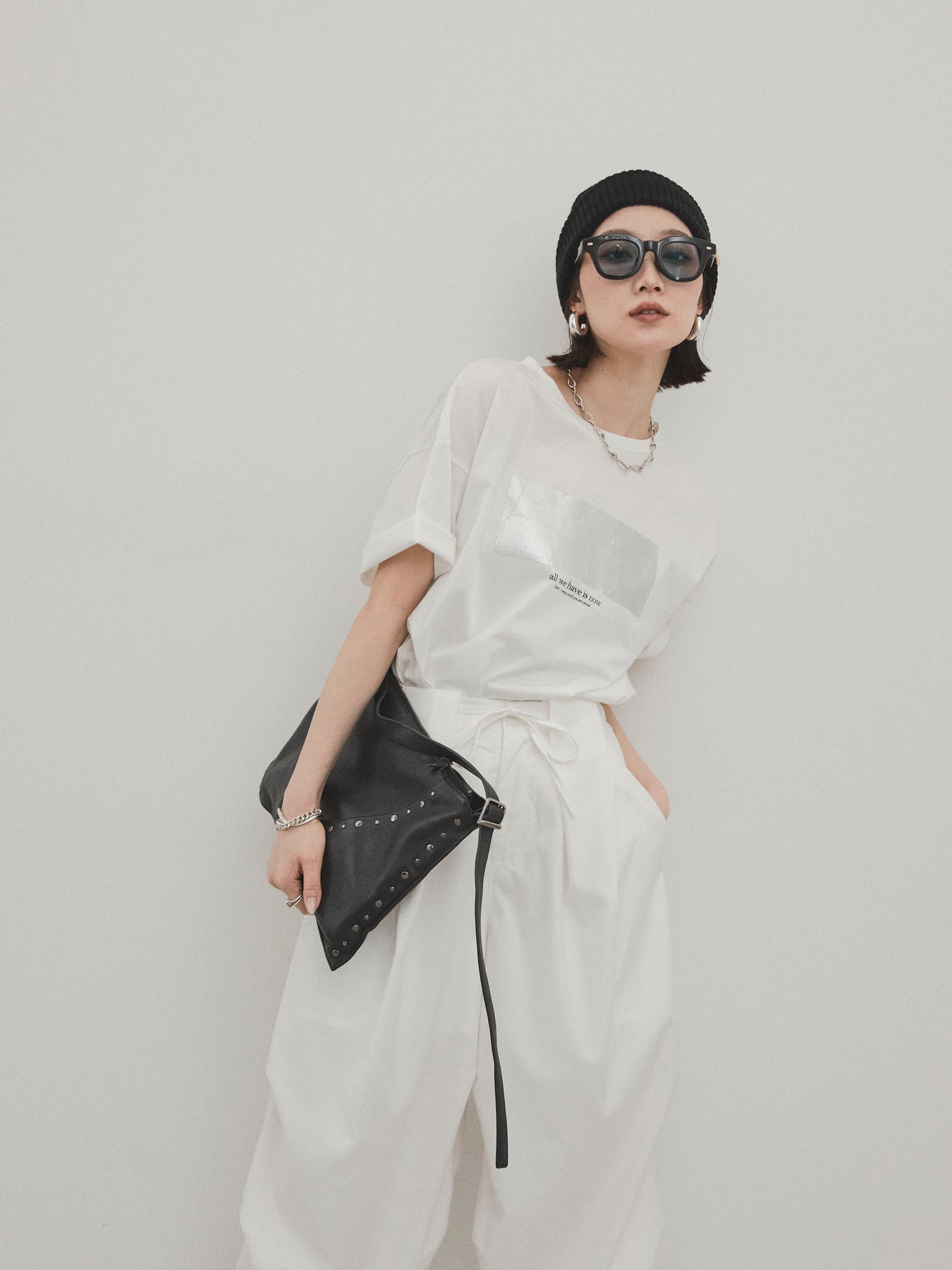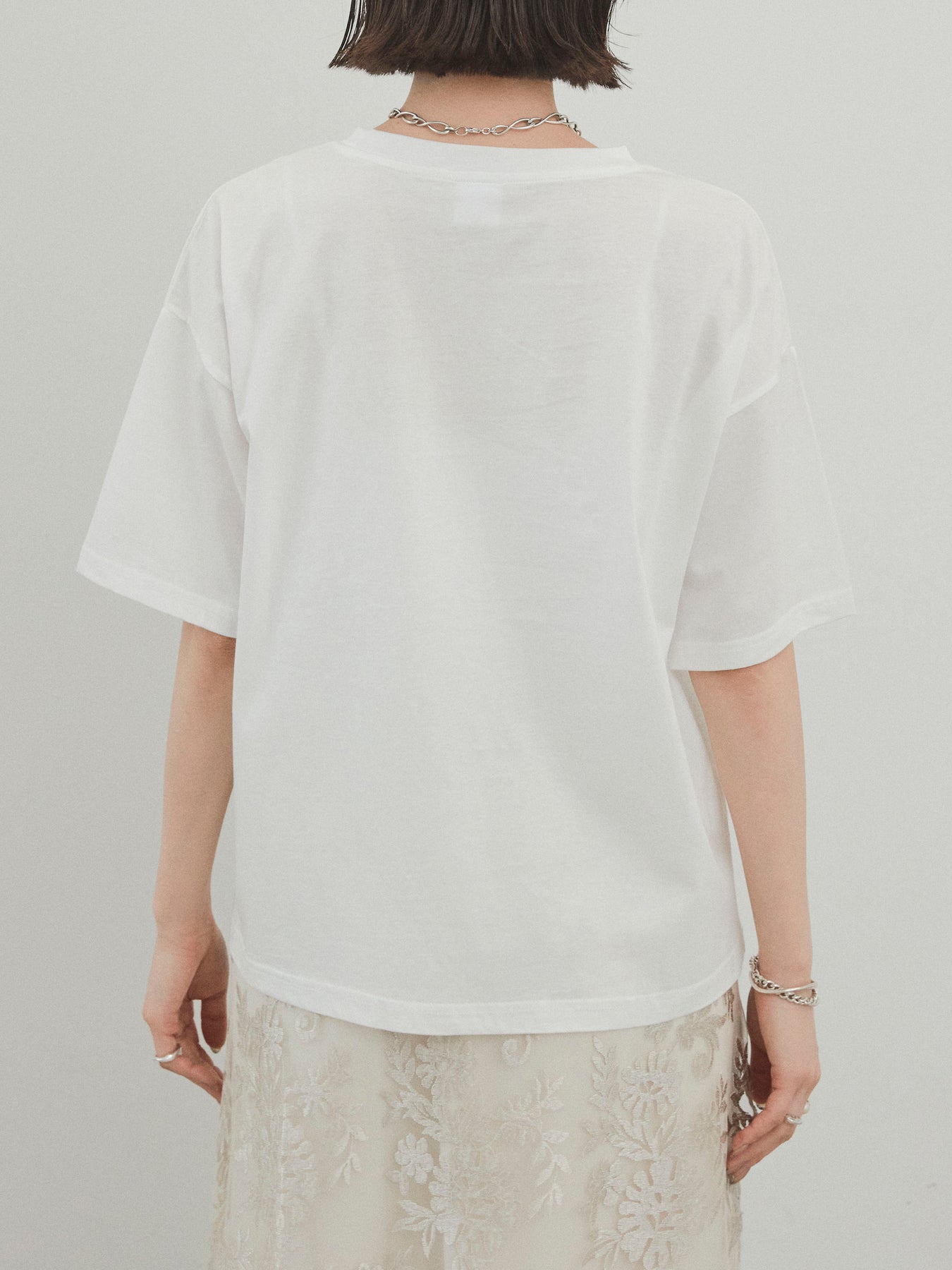 存在感のある箔プリントが目を惹く、大人のためのグラフィックTシャツ。 メッセージ性のあるロゴとマーブル調のアートが、シンプルながらも個性を引き立ててくれます。 さらっとしたドライタッチなコットン素材で、汗ばむ季節でも快適な着心地。 程よくゆとりのあるシルエットで、タックインもアウトも決まる万能な一枚です。 カジュアルなデニムや、レーススカートなど異素材ミックスコーデにも好相性。 デイリー使いはもちろん、ワンポイントでスタイリングに差がつくアイテムです。