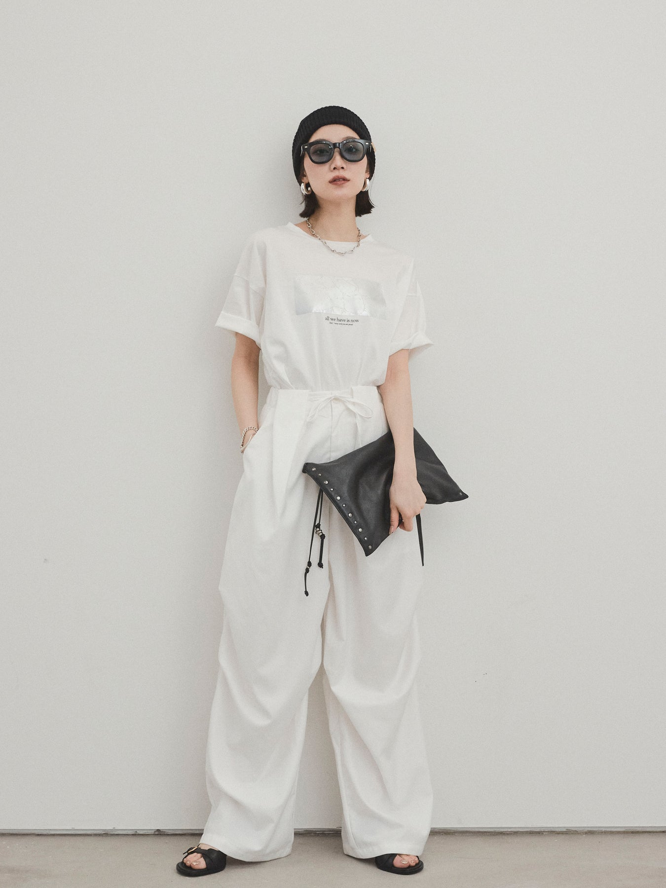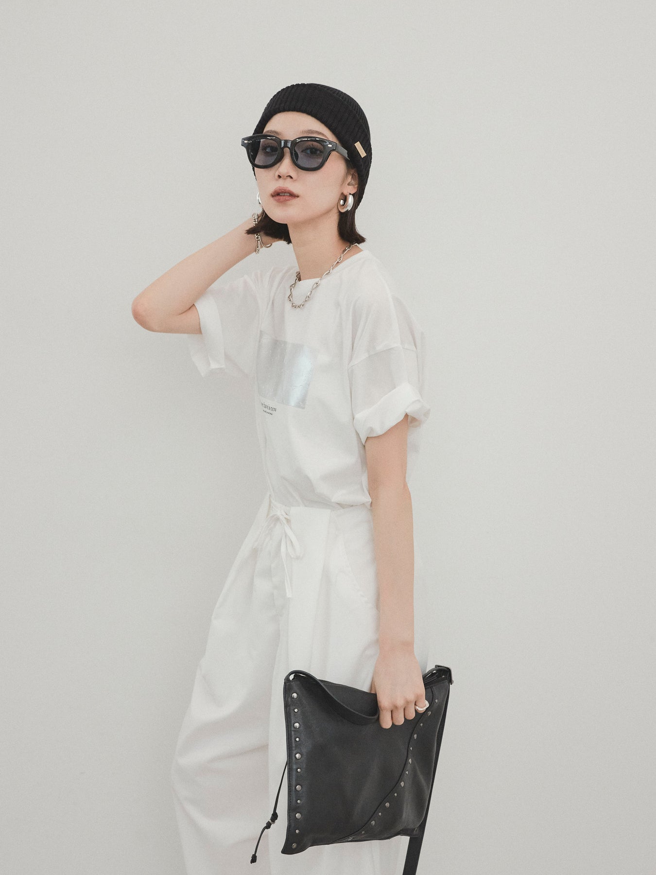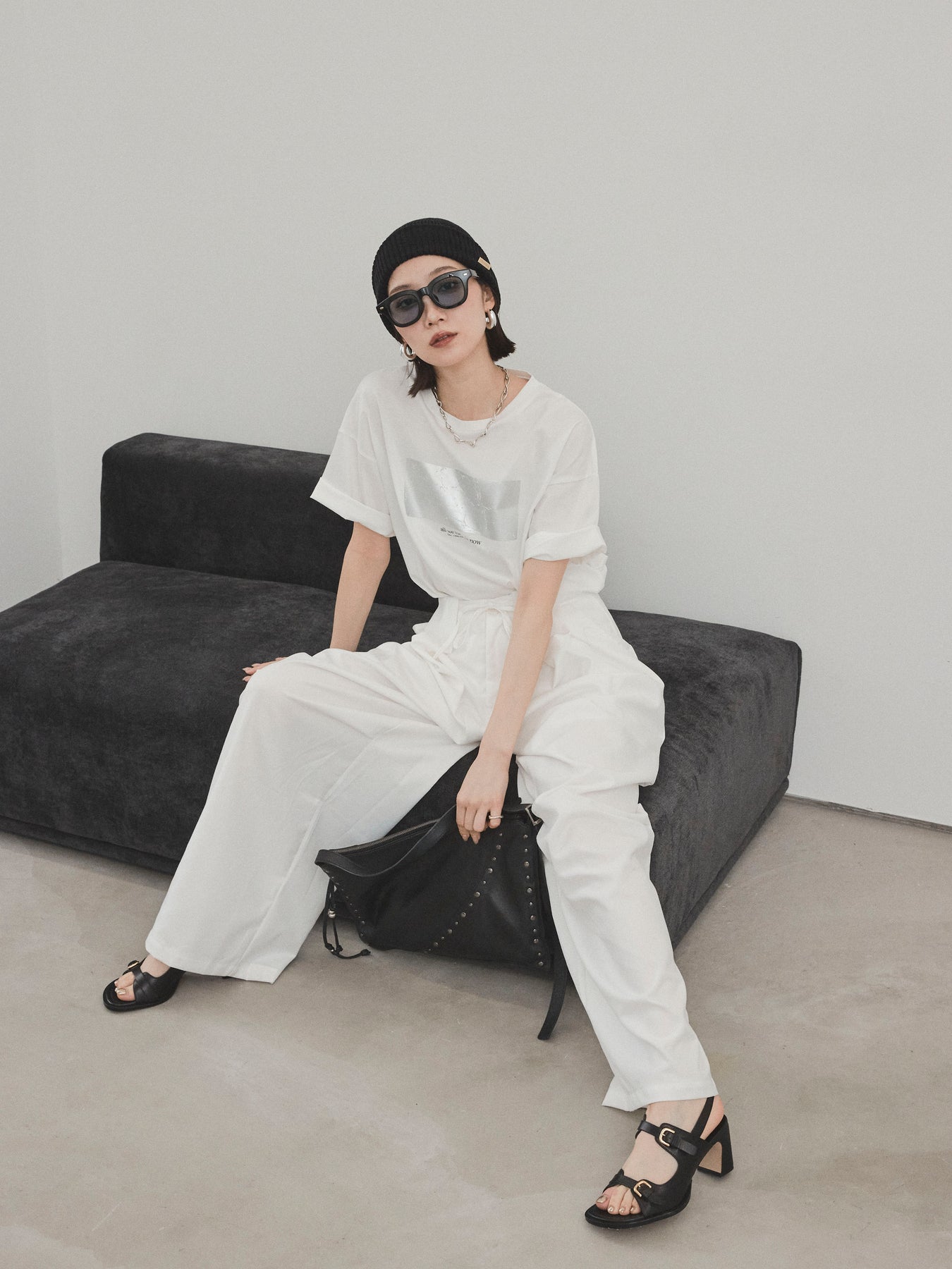 存在感のある箔プリントが目を惹く、大人のためのグラフィックTシャツ。 メッセージ性のあるロゴとマーブル調のアートが、シンプルながらも個性を引き立ててくれます。 さらっとしたドライタッチなコットン素材で、汗ばむ季節でも快適な着心地。 程よくゆとりのあるシルエットで、タックインもアウトも決まる万能な一枚です。 カジュアルなデニムや、レーススカートなど異素材ミックスコーデにも好相性。 デイリー使いはもちろん、ワンポイントでスタイリングに差がつくアイテムです。