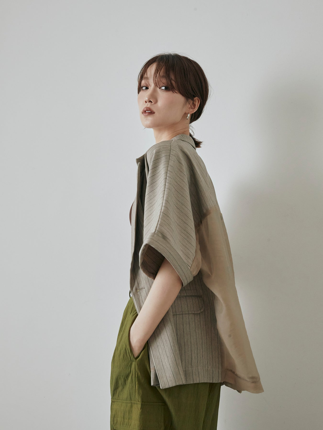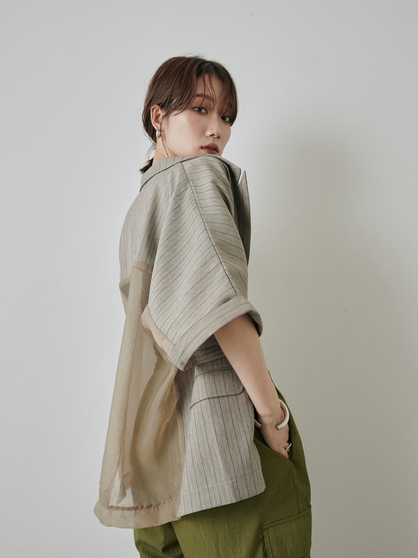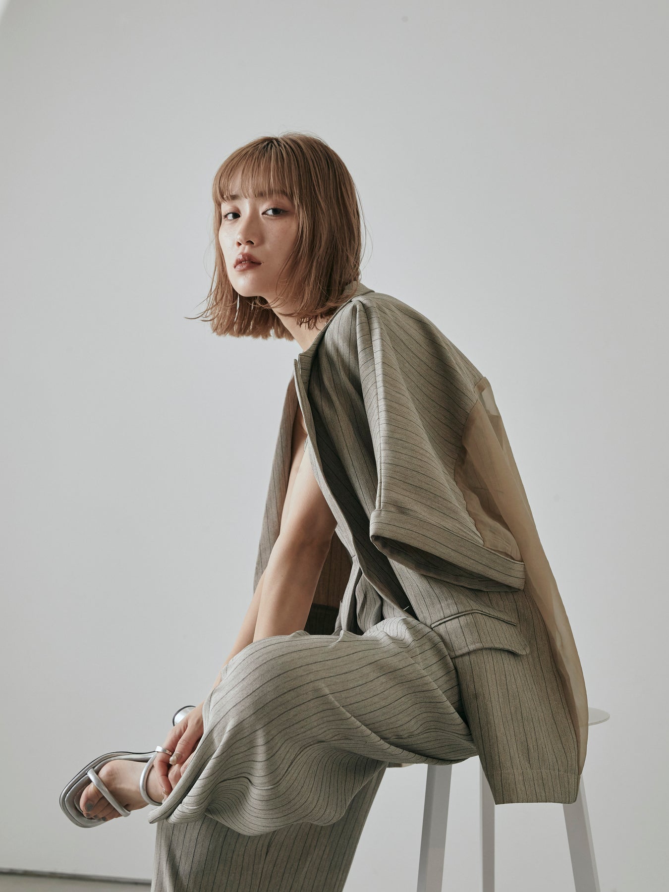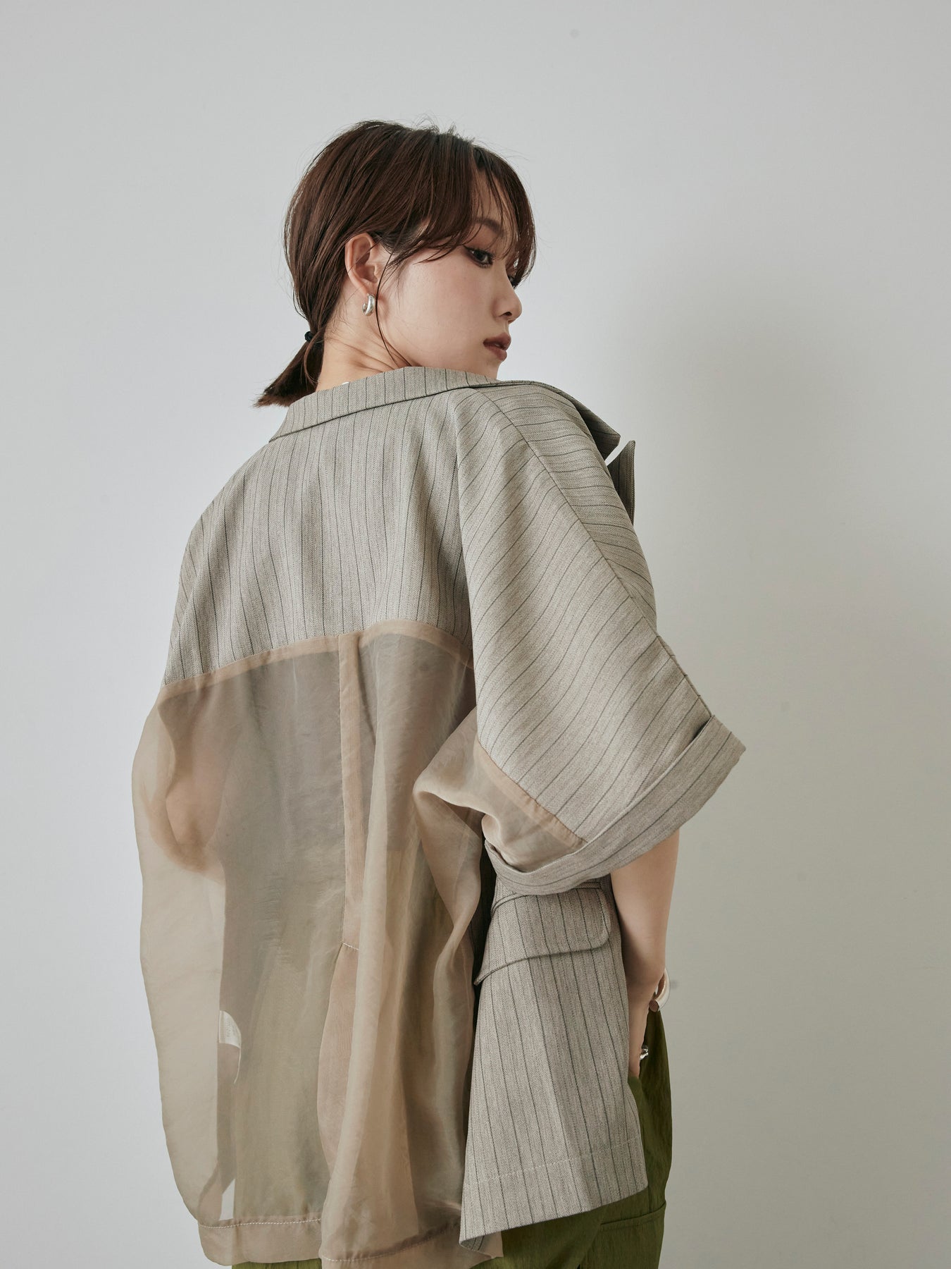 クラシカルなヘリンボーンストライプに、バックスタイルで魅せるオーガンジー切り替えを施した、モード感あふれるハーフジャケット。 マニッシュな印象のテーラードデザインに、透け感のあるディテールをプラスすることで、洗練された抜け感を演出します。 ドロップショルダーとワイドなシルエットがこなれた雰囲気を生み出し、インナーを選ばず羽織るだけでサマになるデザイン。 ややハリ感のある素材とストライプの縦ラインが、自然なスタイルアップを叶えてくれます。 同素材のサロペットやパンツとセットアップでの着用はもちろん、カジュアルなデニムやTシャツと合わせてミックススタイルも楽しめる万能ジャケットです。