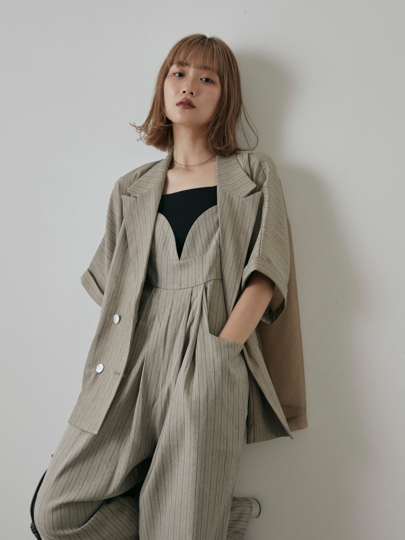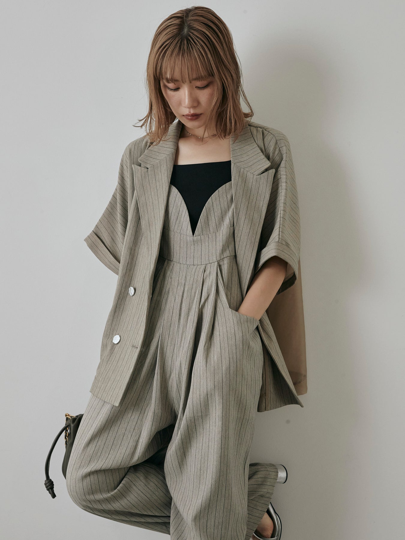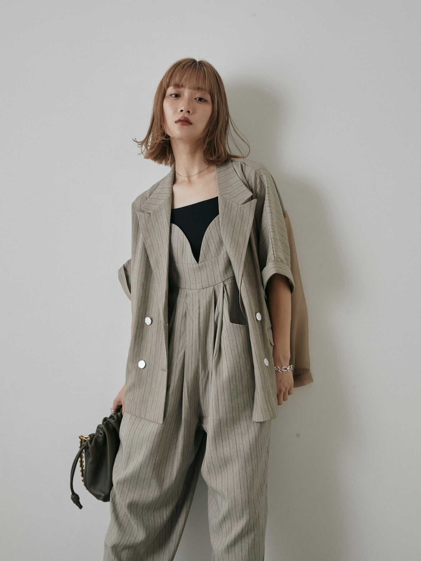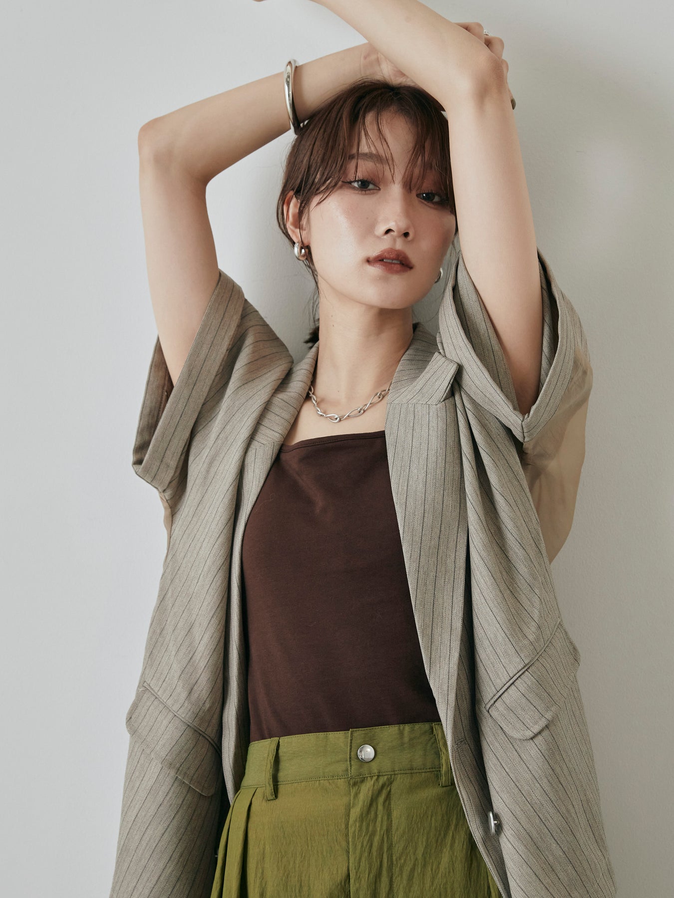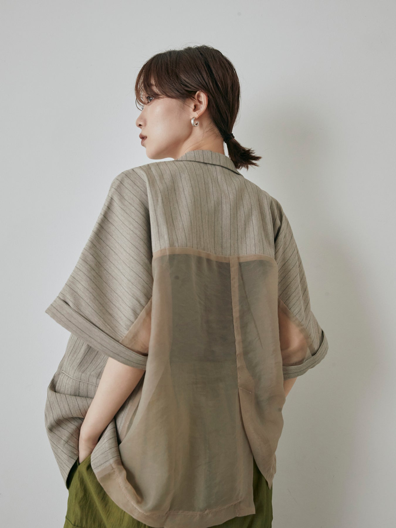 クラシカルなヘリンボーンストライプに、バックスタイルで魅せるオーガンジー切り替えを施した、モード感あふれるハーフジャケット。 マニッシュな印象のテーラードデザインに、透け感のあるディテールをプラスすることで、洗練された抜け感を演出します。 ドロップショルダーとワイドなシルエットがこなれた雰囲気を生み出し、インナーを選ばず羽織るだけでサマになるデザイン。 ややハリ感のある素材とストライプの縦ラインが、自然なスタイルアップを叶えてくれます。 同素材のサロペットやパンツとセットアップでの着用はもちろん、カジュアルなデニムやTシャツと合わせてミックススタイルも楽しめる万能ジャケットです。