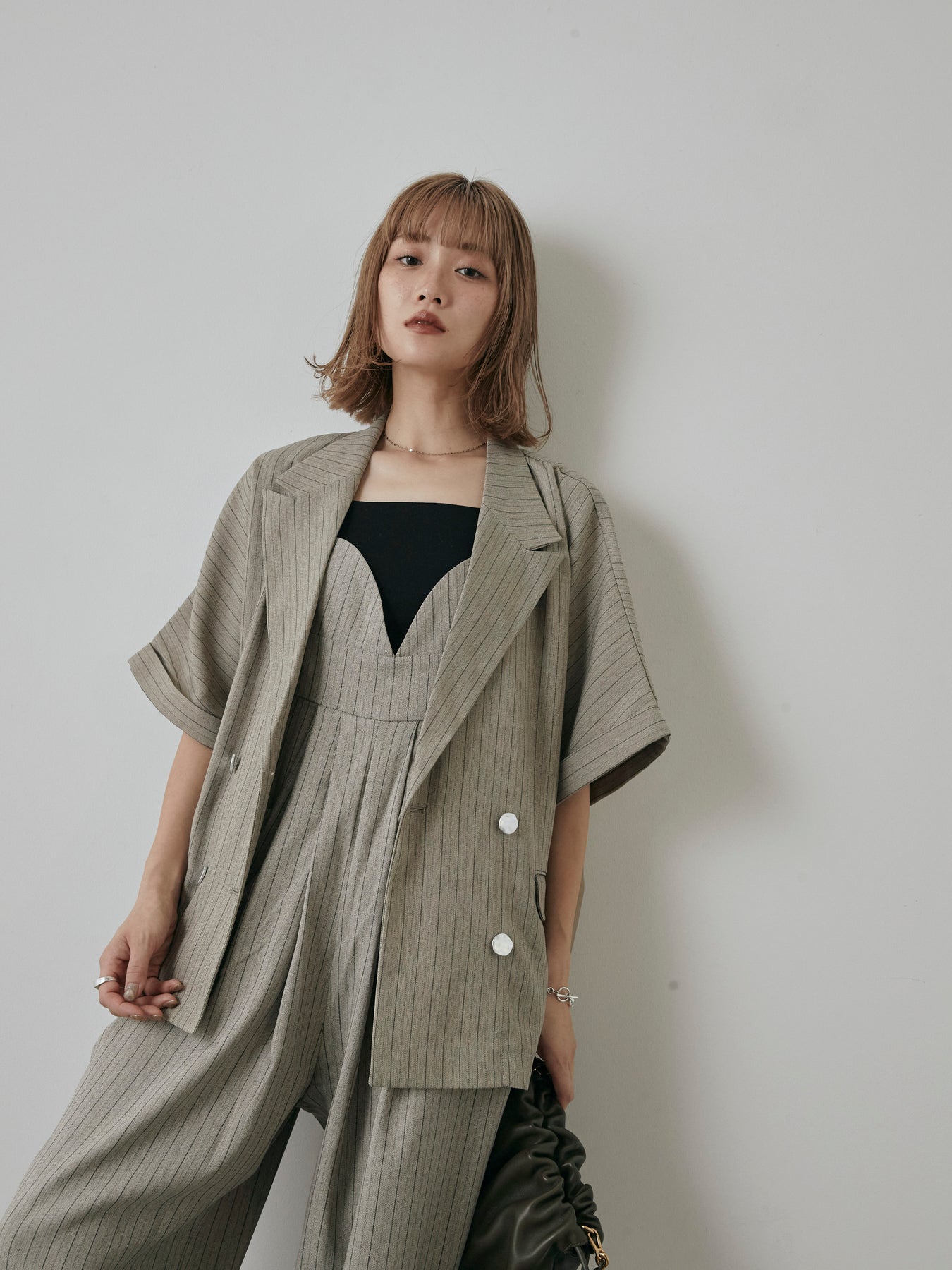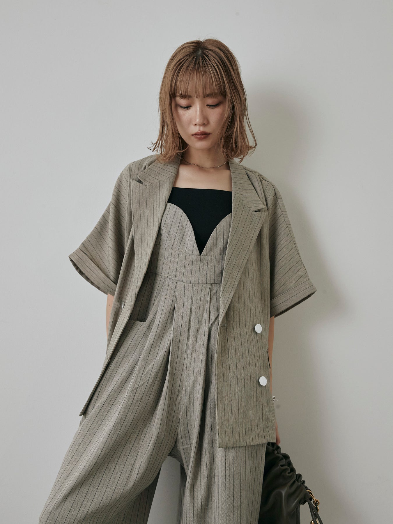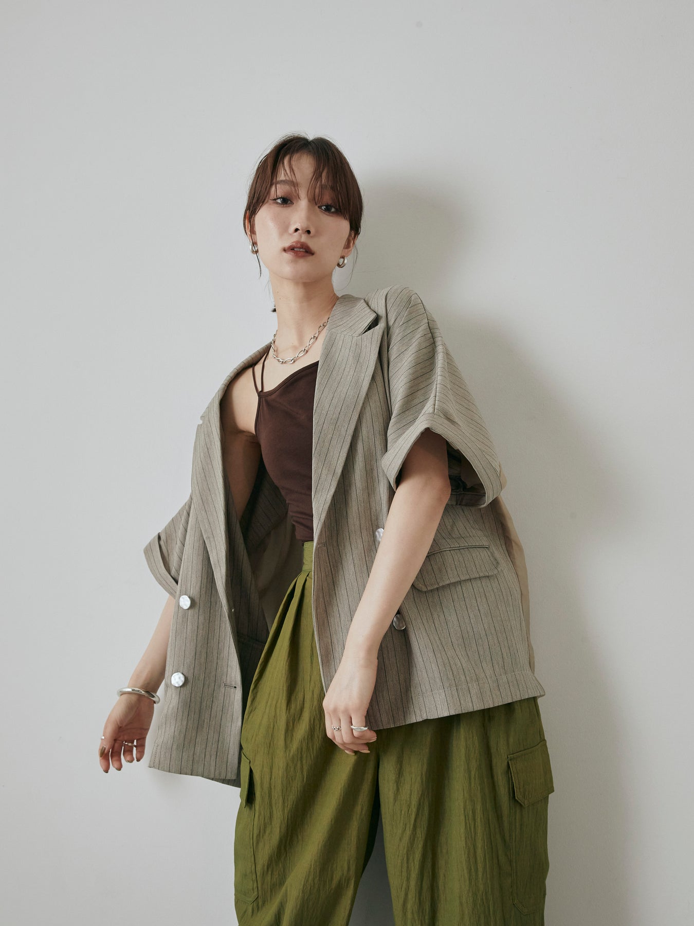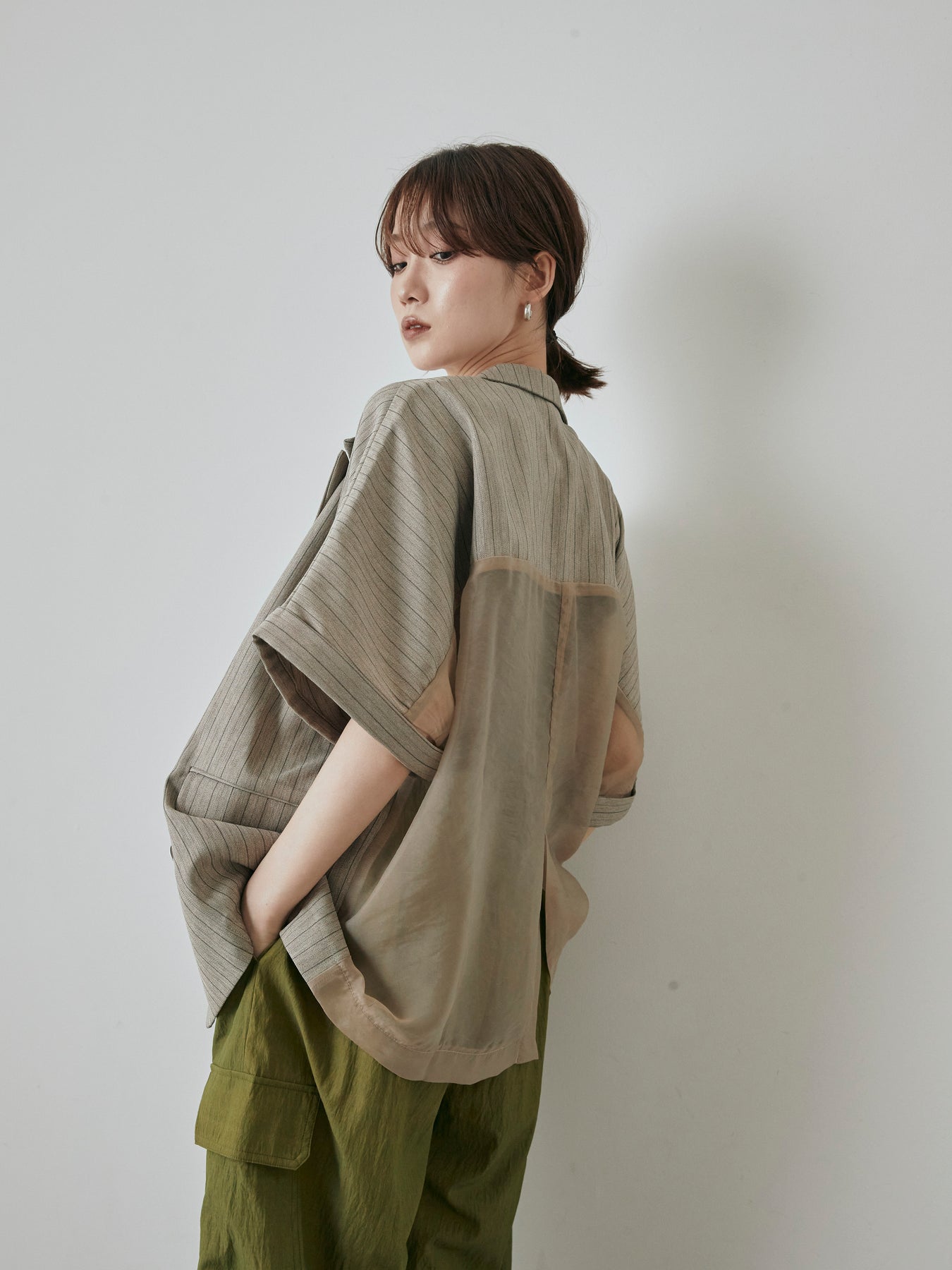 クラシカルなヘリンボーンストライプに、バックスタイルで魅せるオーガンジー切り替えを施した、モード感あふれるハーフジャケット。 マニッシュな印象のテーラードデザインに、透け感のあるディテールをプラスすることで、洗練された抜け感を演出します。 ドロップショルダーとワイドなシルエットがこなれた雰囲気を生み出し、インナーを選ばず羽織るだけでサマになるデザイン。 ややハリ感のある素材とストライプの縦ラインが、自然なスタイルアップを叶えてくれます。 同素材のサロペットやパンツとセットアップでの着用はもちろん、カジュアルなデニムやTシャツと合わせてミックススタイルも楽しめる万能ジャケットです。