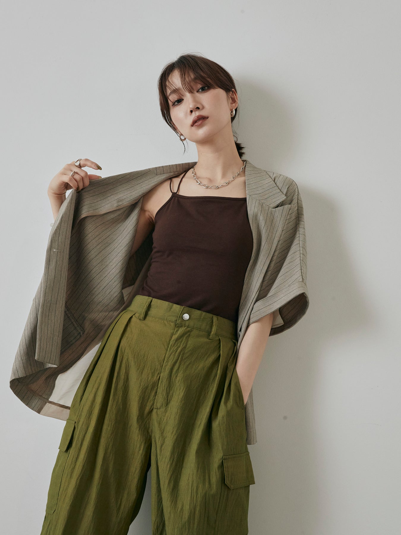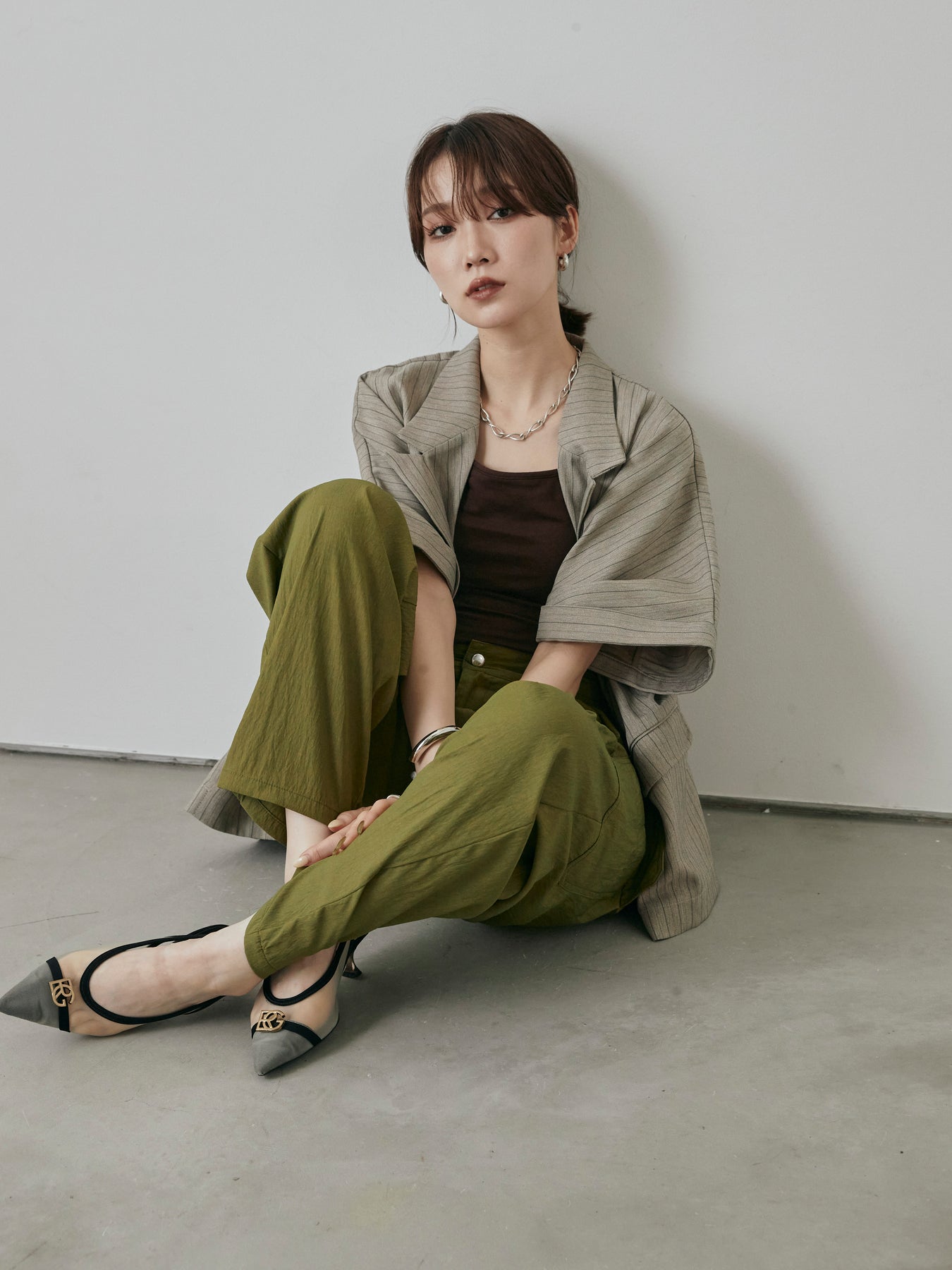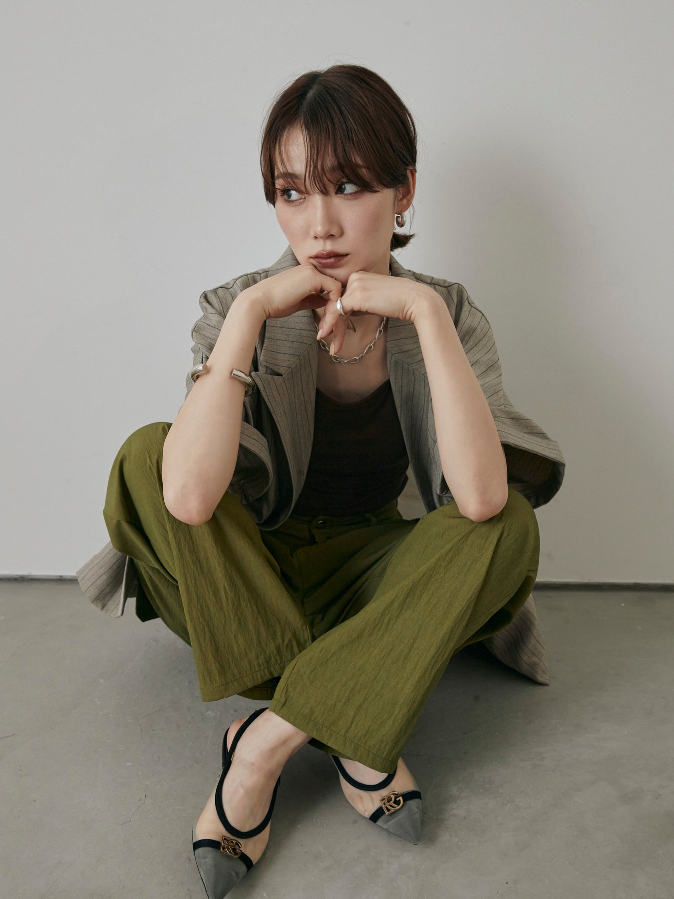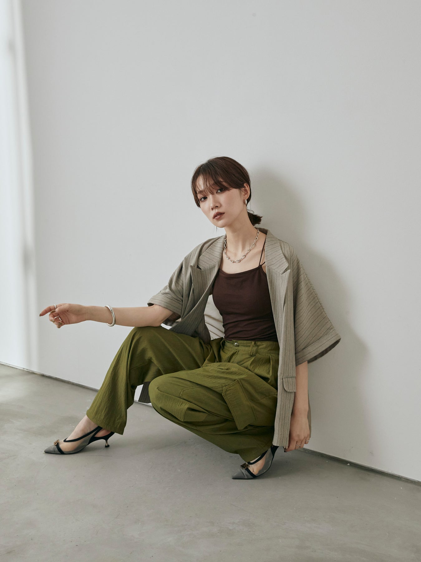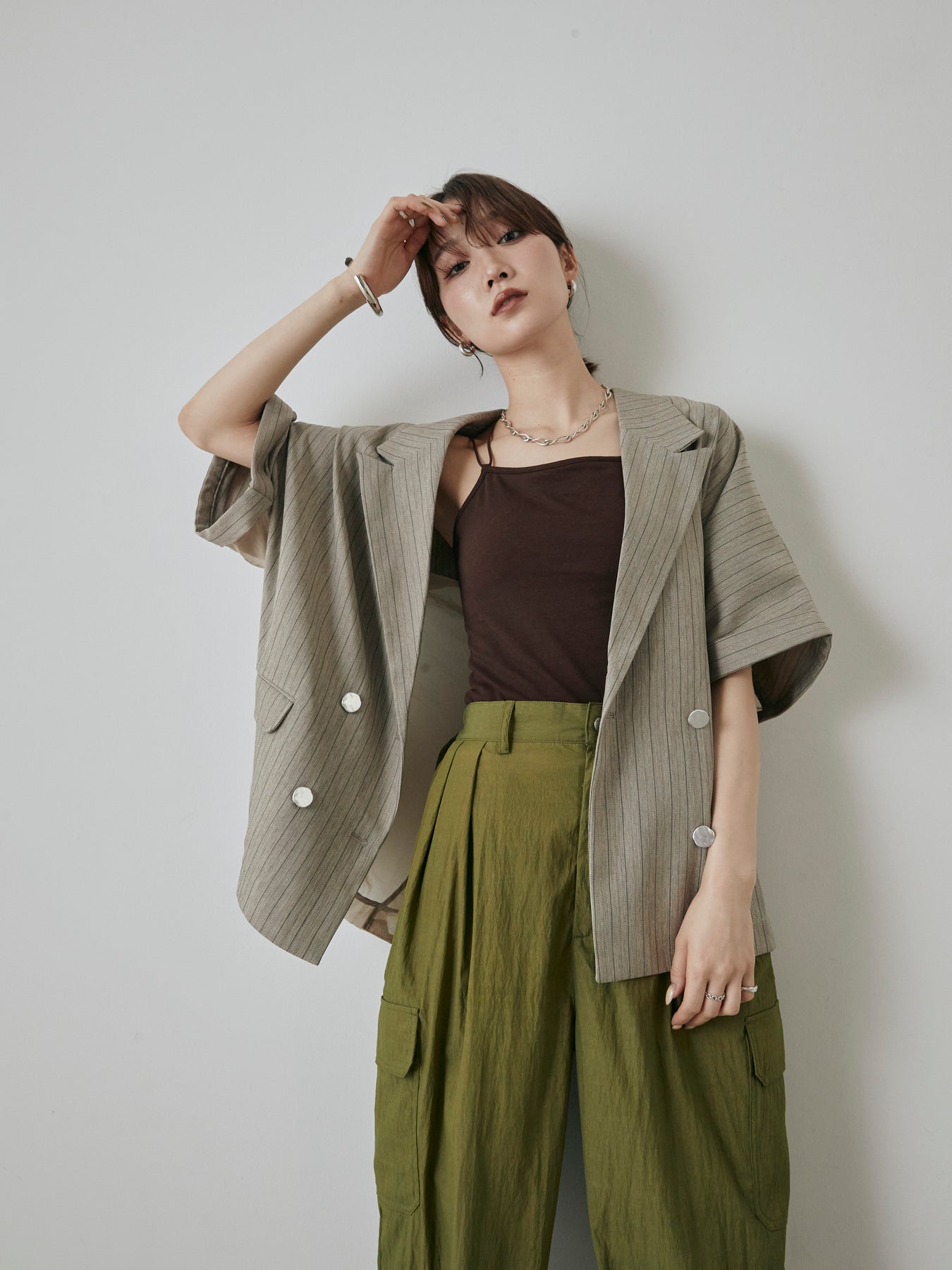 クラシカルなヘリンボーンストライプに、バックスタイルで魅せるオーガンジー切り替えを施した、モード感あふれるハーフジャケット。 マニッシュな印象のテーラードデザインに、透け感のあるディテールをプラスすることで、洗練された抜け感を演出します。 ドロップショルダーとワイドなシルエットがこなれた雰囲気を生み出し、インナーを選ばず羽織るだけでサマになるデザイン。 ややハリ感のある素材とストライプの縦ラインが、自然なスタイルアップを叶えてくれます。 同素材のサロペットやパンツとセットアップでの着用はもちろん、カジュアルなデニムやTシャツと合わせてミックススタイルも楽しめる万能ジャケットです。