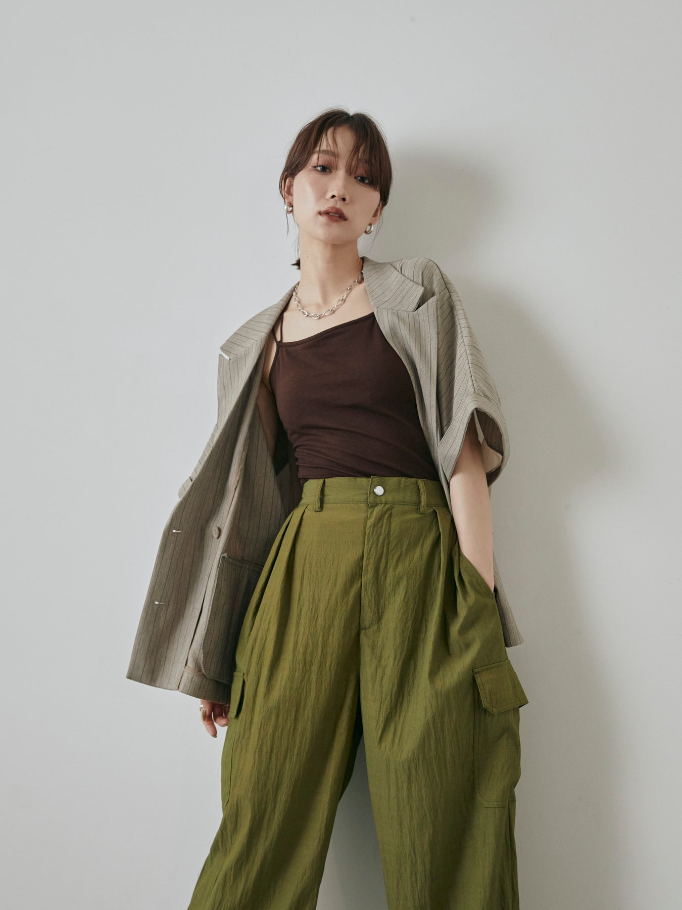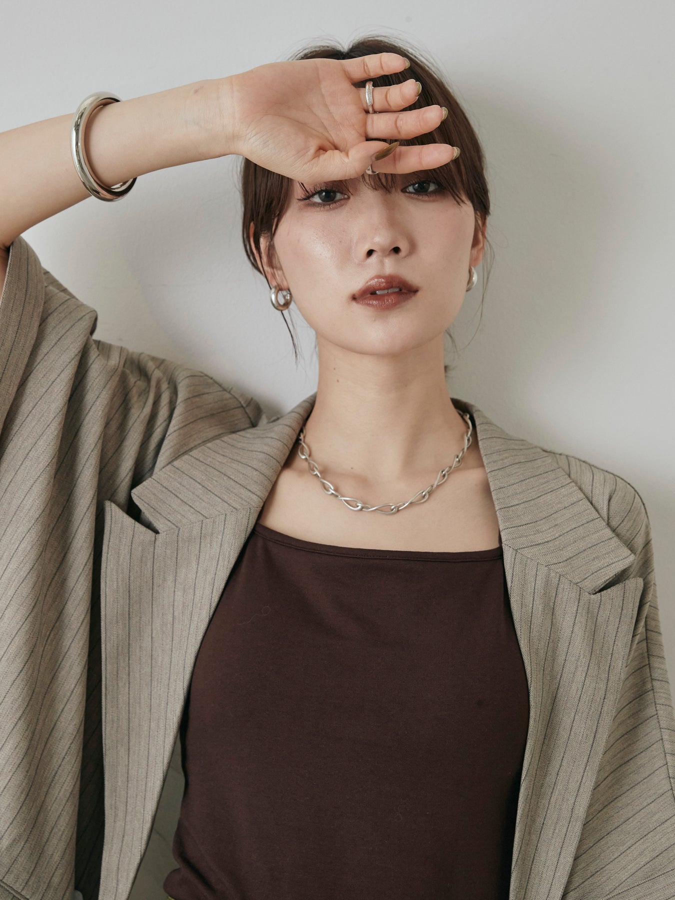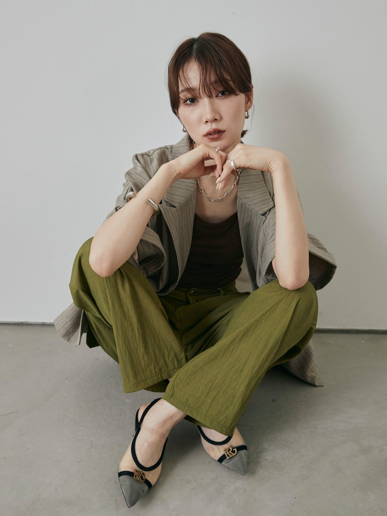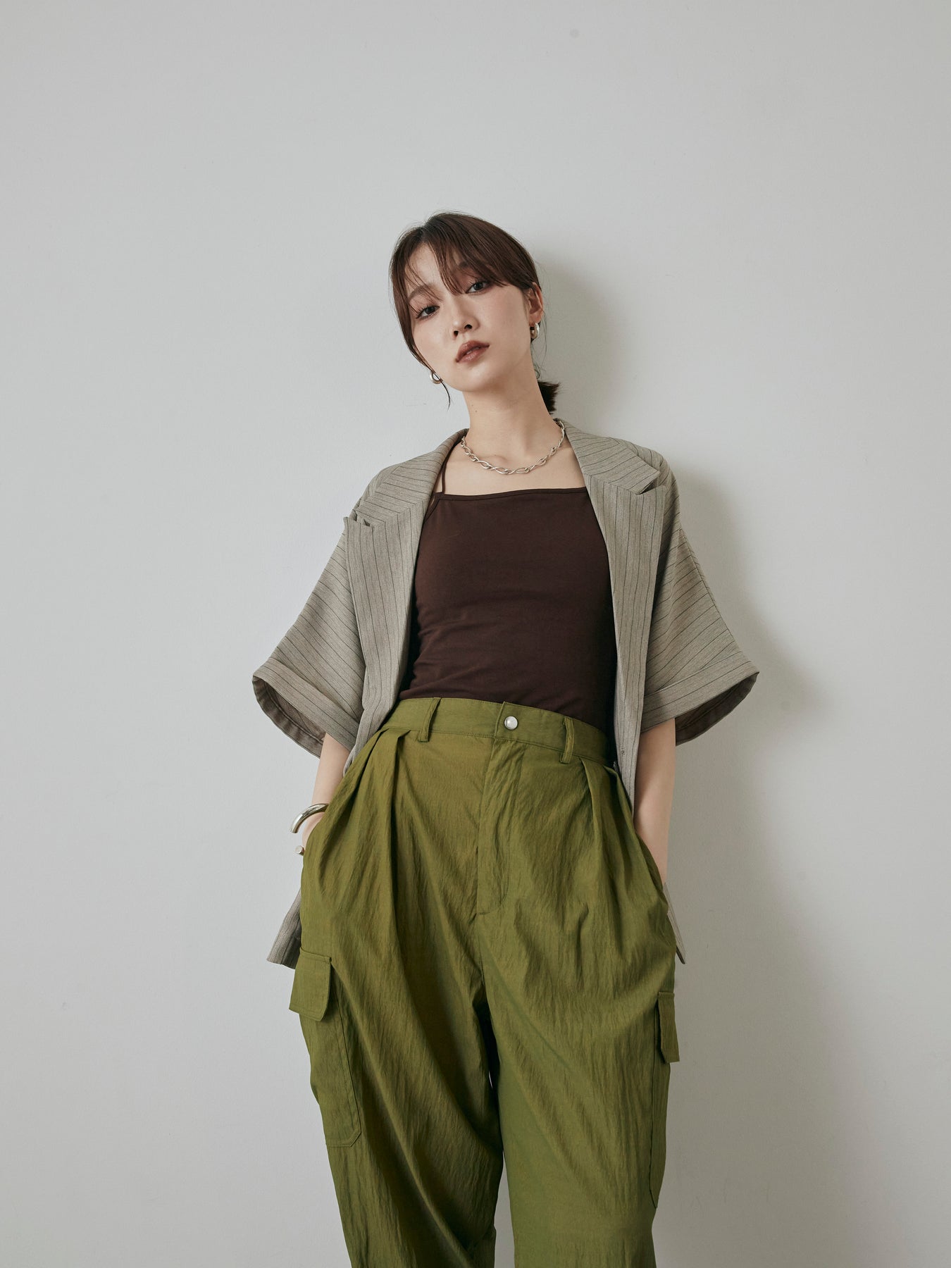 クラシカルなヘリンボーンストライプに、バックスタイルで魅せるオーガンジー切り替えを施した、モード感あふれるハーフジャケット。 マニッシュな印象のテーラードデザインに、透け感のあるディテールをプラスすることで、洗練された抜け感を演出します。 ドロップショルダーとワイドなシルエットがこなれた雰囲気を生み出し、インナーを選ばず羽織るだけでサマになるデザイン。 ややハリ感のある素材とストライプの縦ラインが、自然なスタイルアップを叶えてくれます。 同素材のサロペットやパンツとセットアップでの着用はもちろん、カジュアルなデニムやTシャツと合わせてミックススタイルも楽しめる万能ジャケットです。