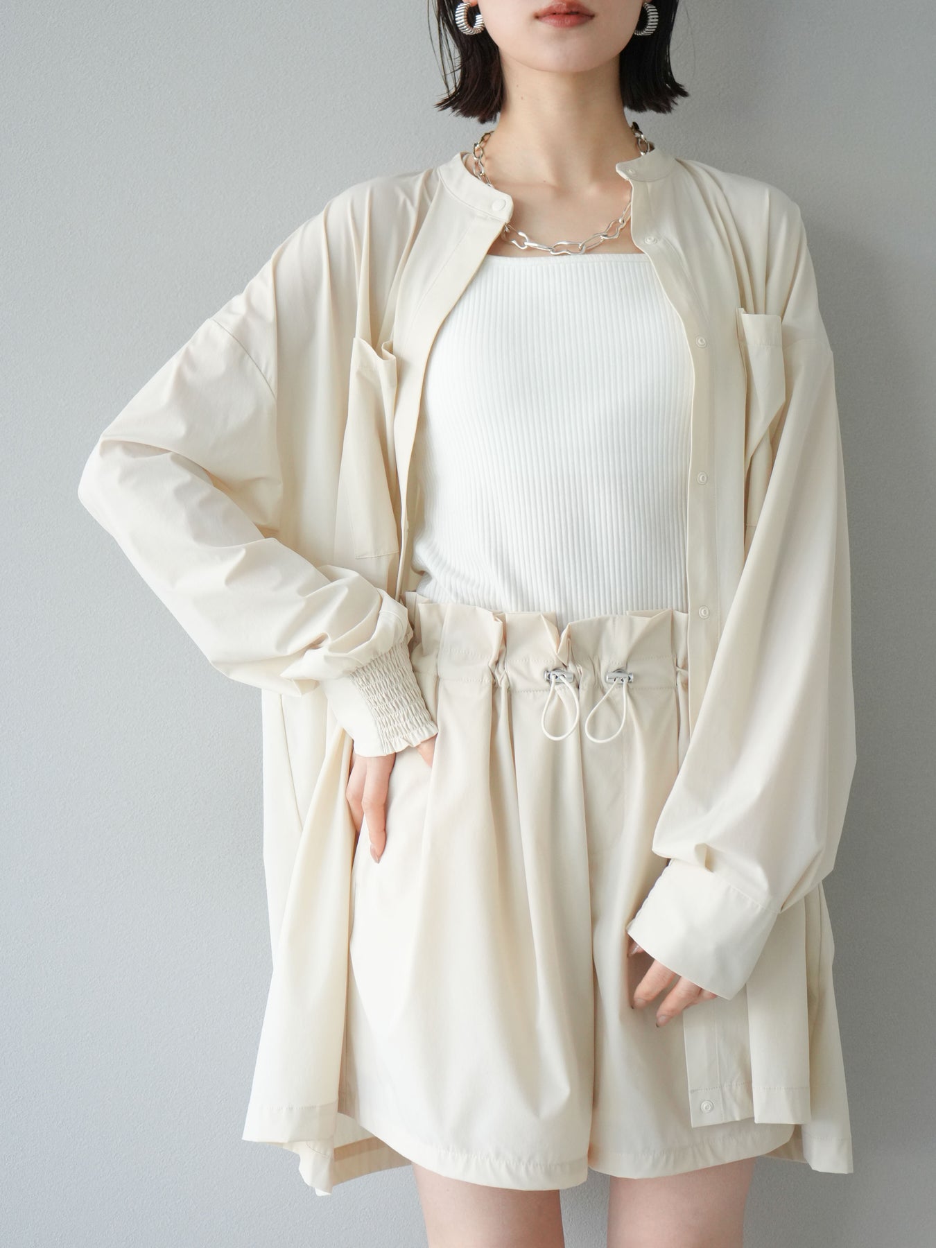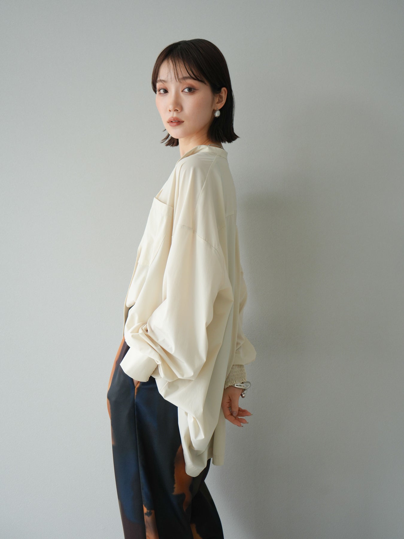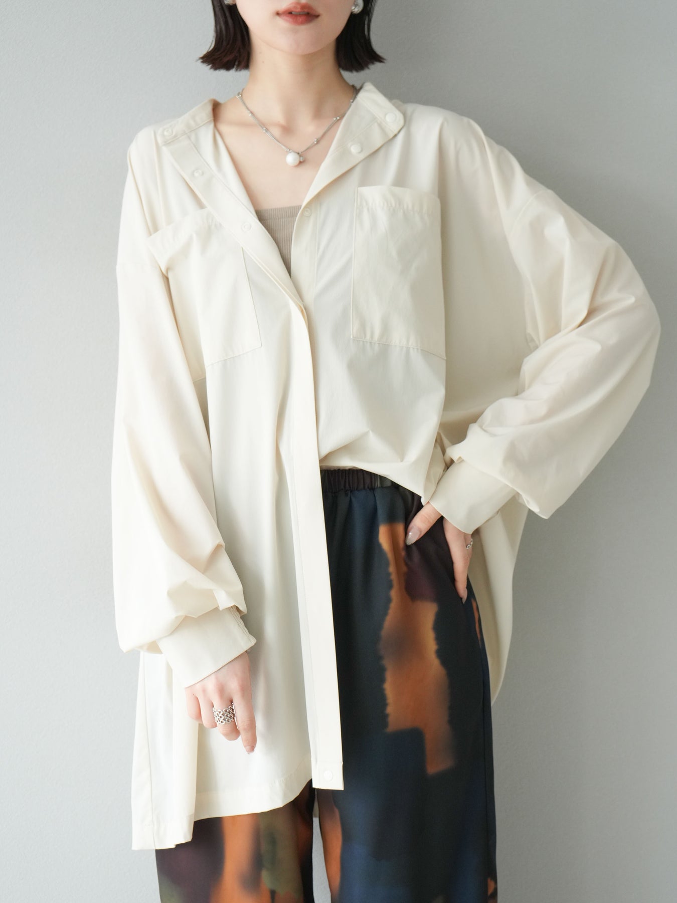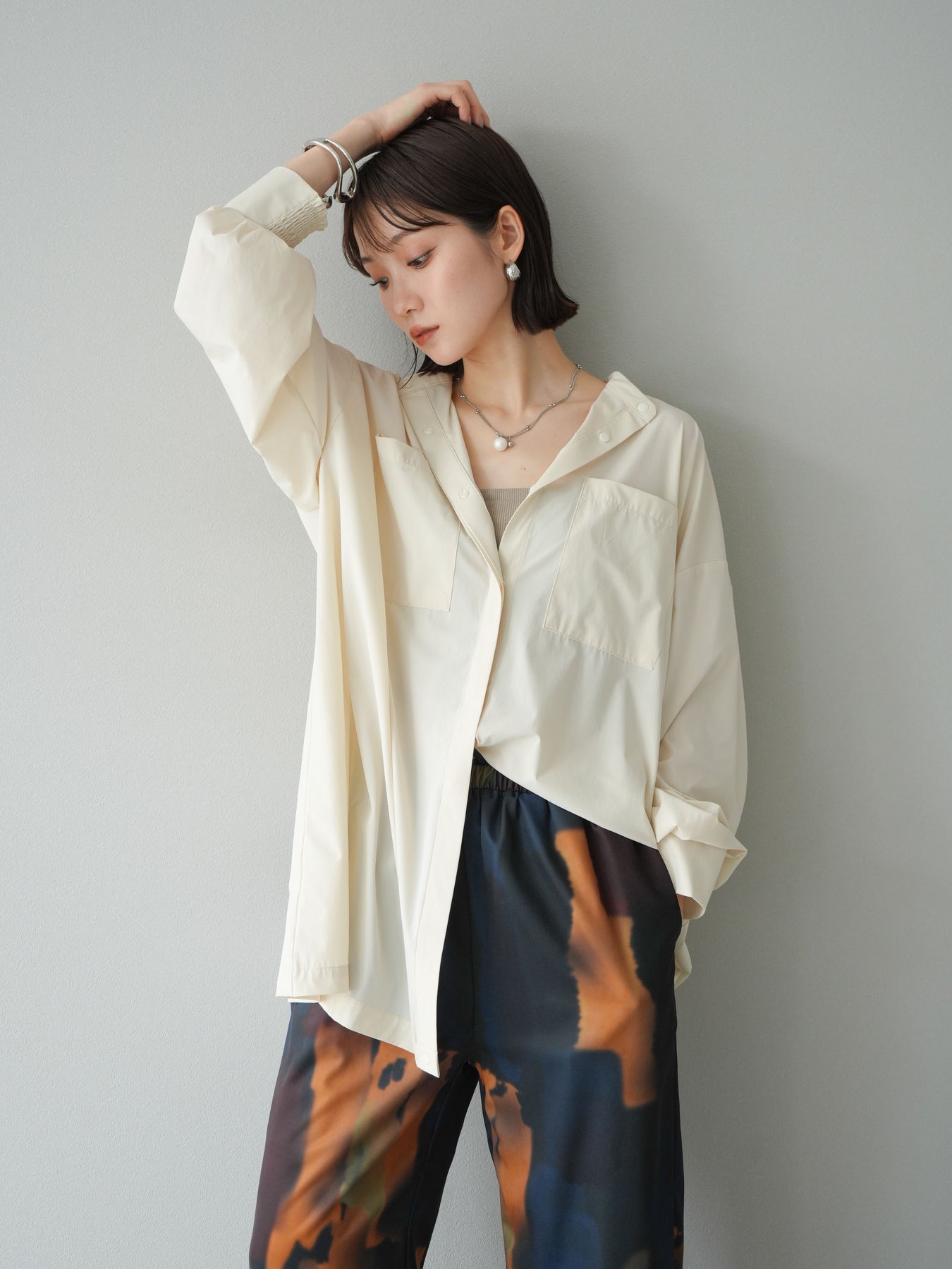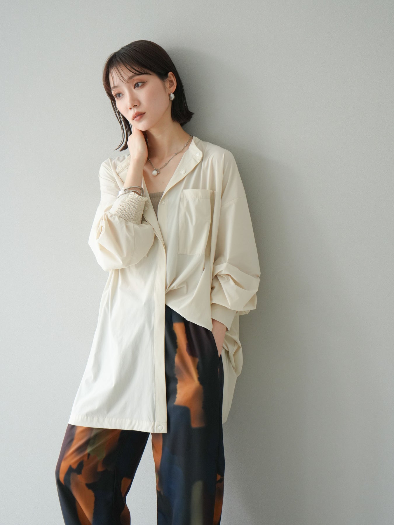 ひんやりとした肌触りが魅力のICE TOUCH素材を使用した、2WAY仕様のオーバーシャツ。さらっとした着心地と軽やかなドレープ感が特徴で、暑い季節も快適に過ごせる一着です。バンドカラーと比翼仕立てのミニマルなデザインで、前後どちらを前にしても着用可能な2WAY仕様。シャツとしてはもちろん、羽織りとしても活躍し、シーズンを通して着回しの幅が広がります。ヒップが隠れる丈感で、体型カバーにも◎。 ※ボトムス、キャミソール(インナー)以外の商品は一律でインナーは付属していません。