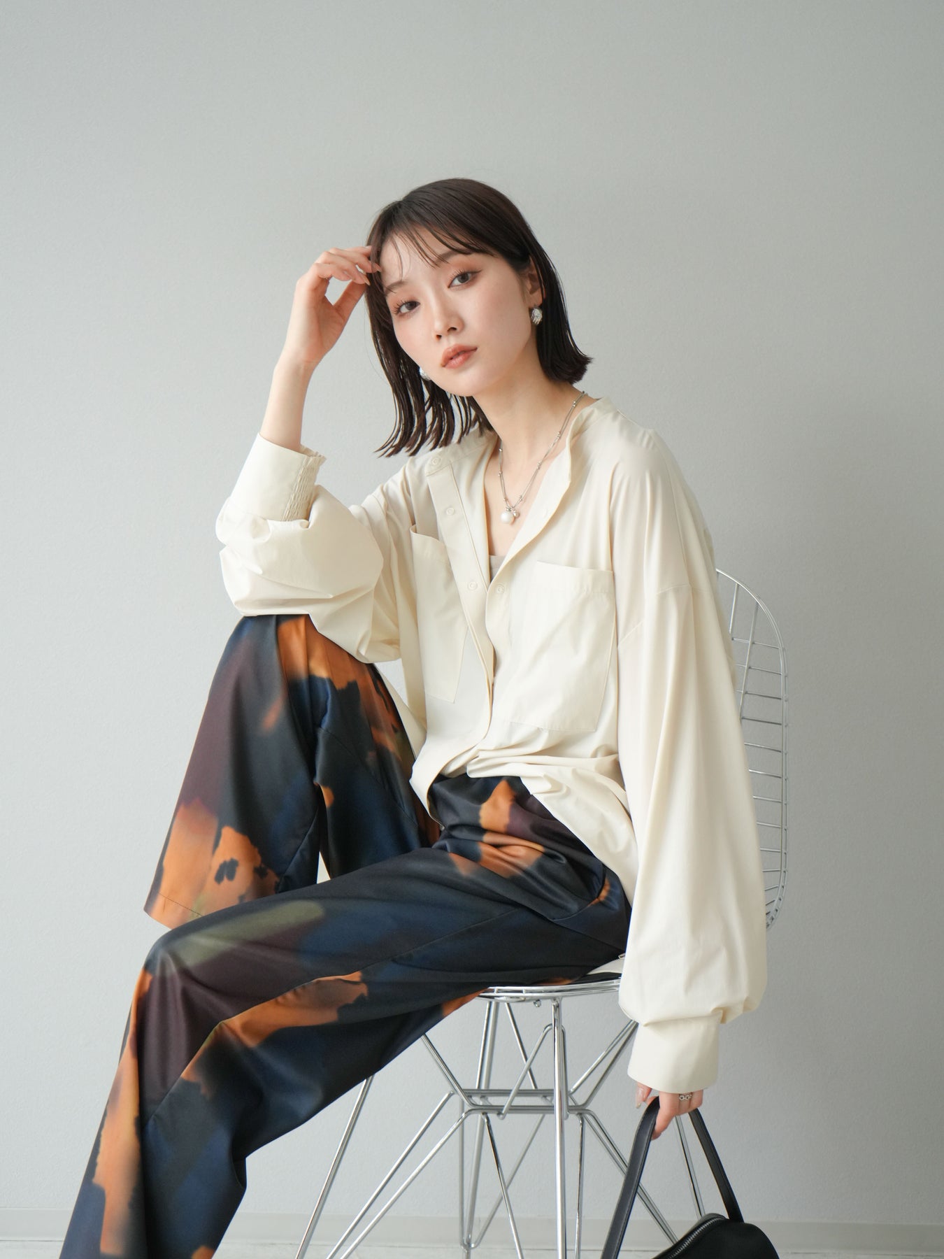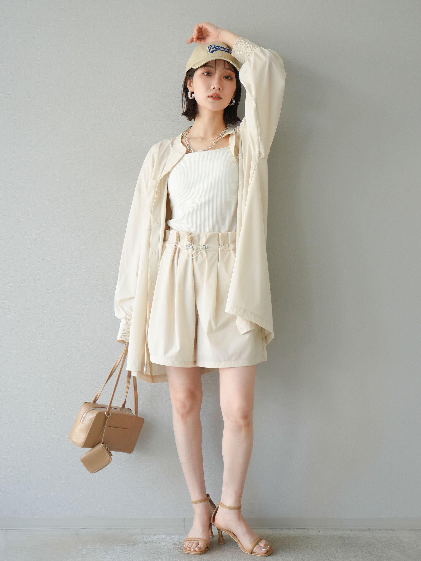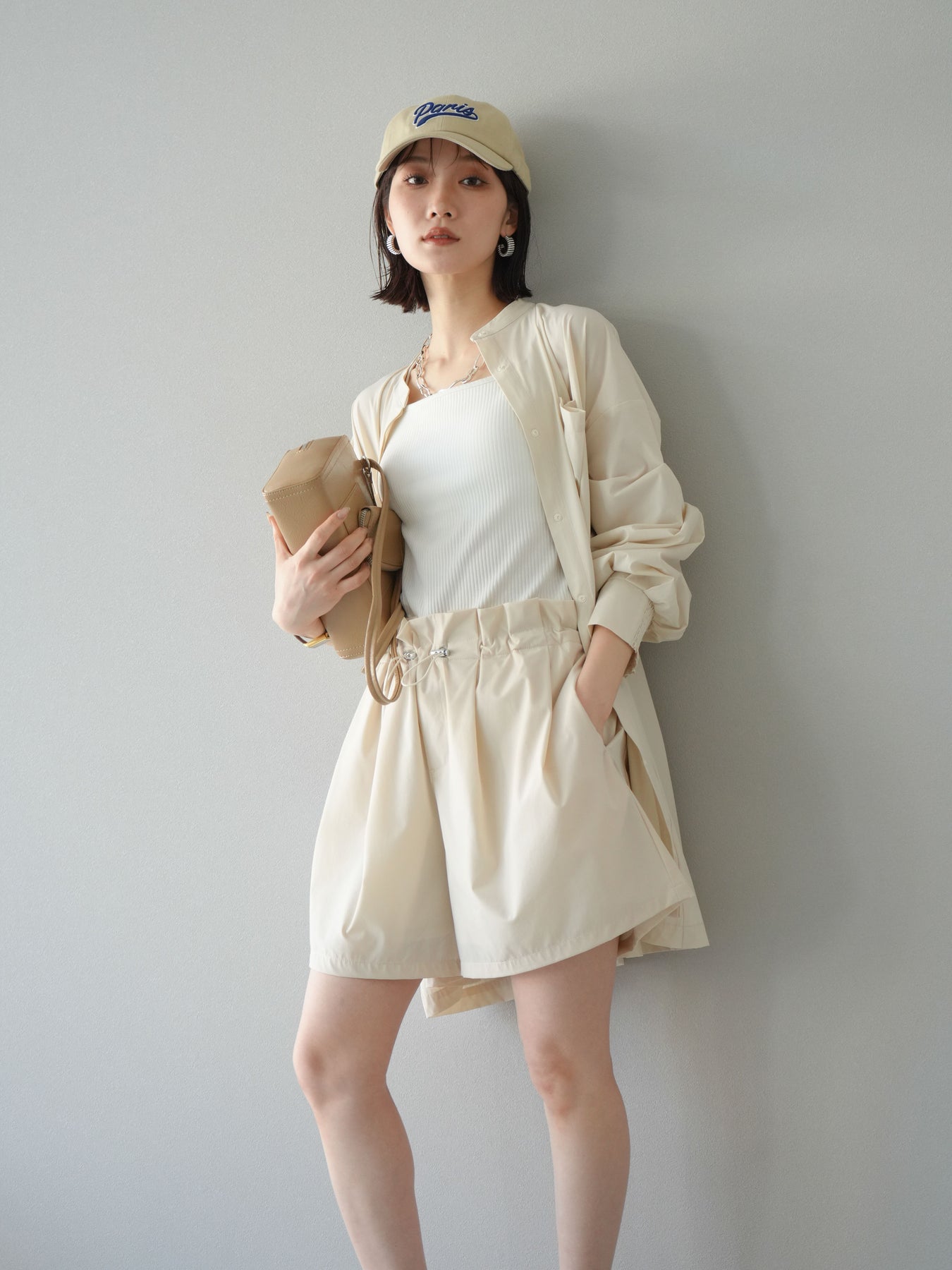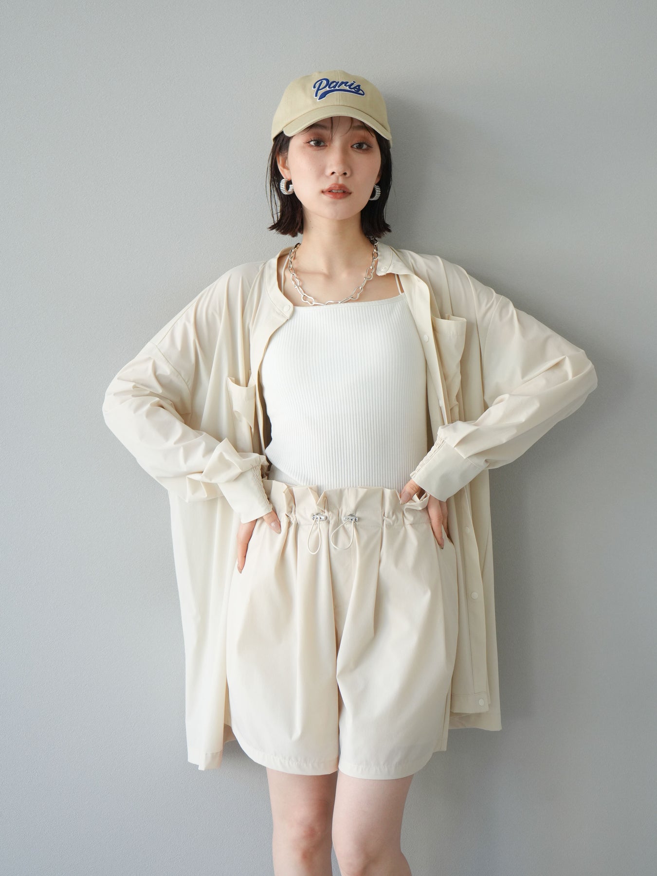 ひんやりとした肌触りが魅力のICE TOUCH素材を使用した、2WAY仕様のオーバーシャツ。さらっとした着心地と軽やかなドレープ感が特徴で、暑い季節も快適に過ごせる一着です。バンドカラーと比翼仕立てのミニマルなデザインで、前後どちらを前にしても着用可能な2WAY仕様。シャツとしてはもちろん、羽織りとしても活躍し、シーズンを通して着回しの幅が広がります。ヒップが隠れる丈感で、体型カバーにも◎。 ※ボトムス、キャミソール(インナー)以外の商品は一律でインナーは付属していません。