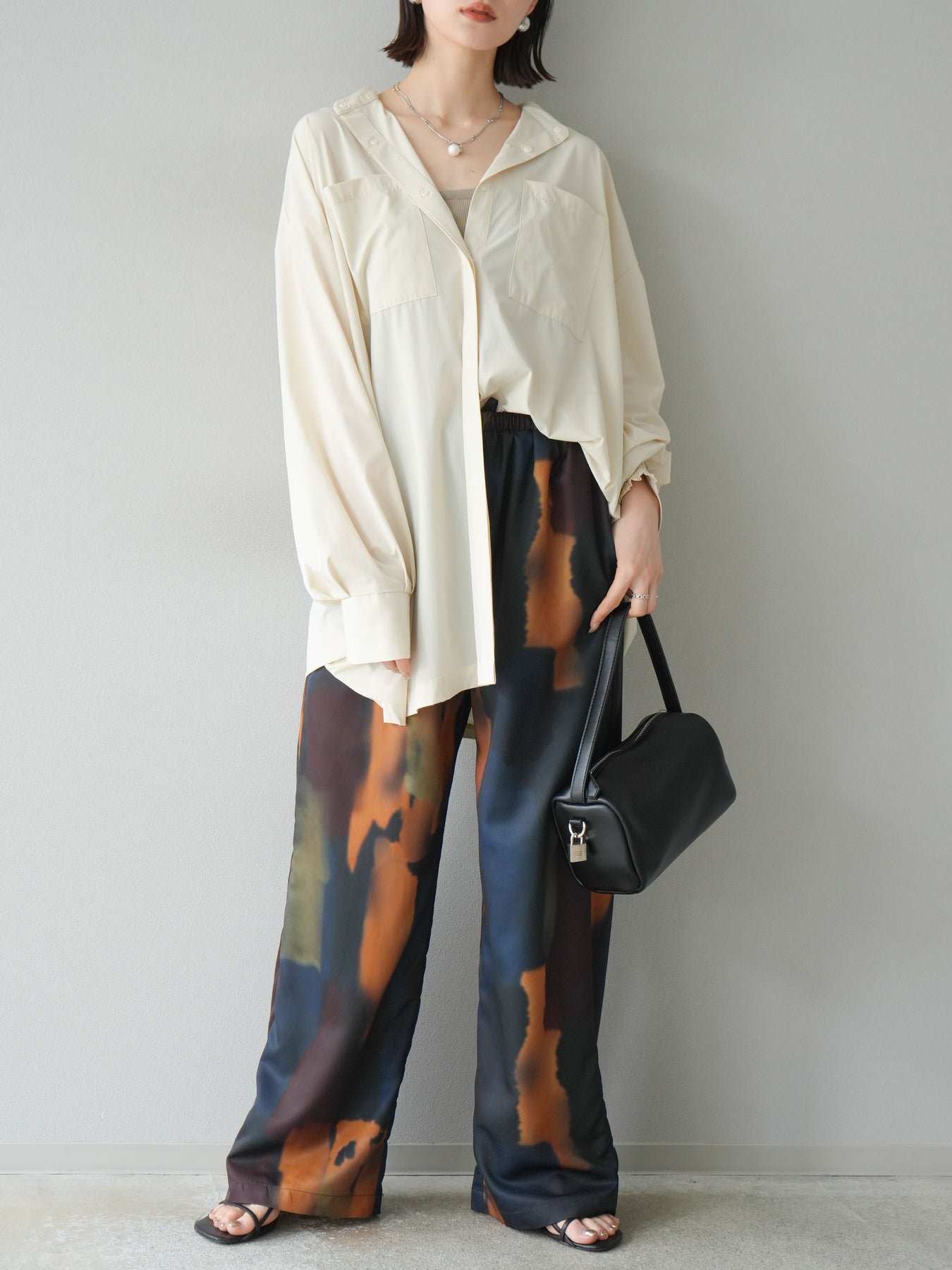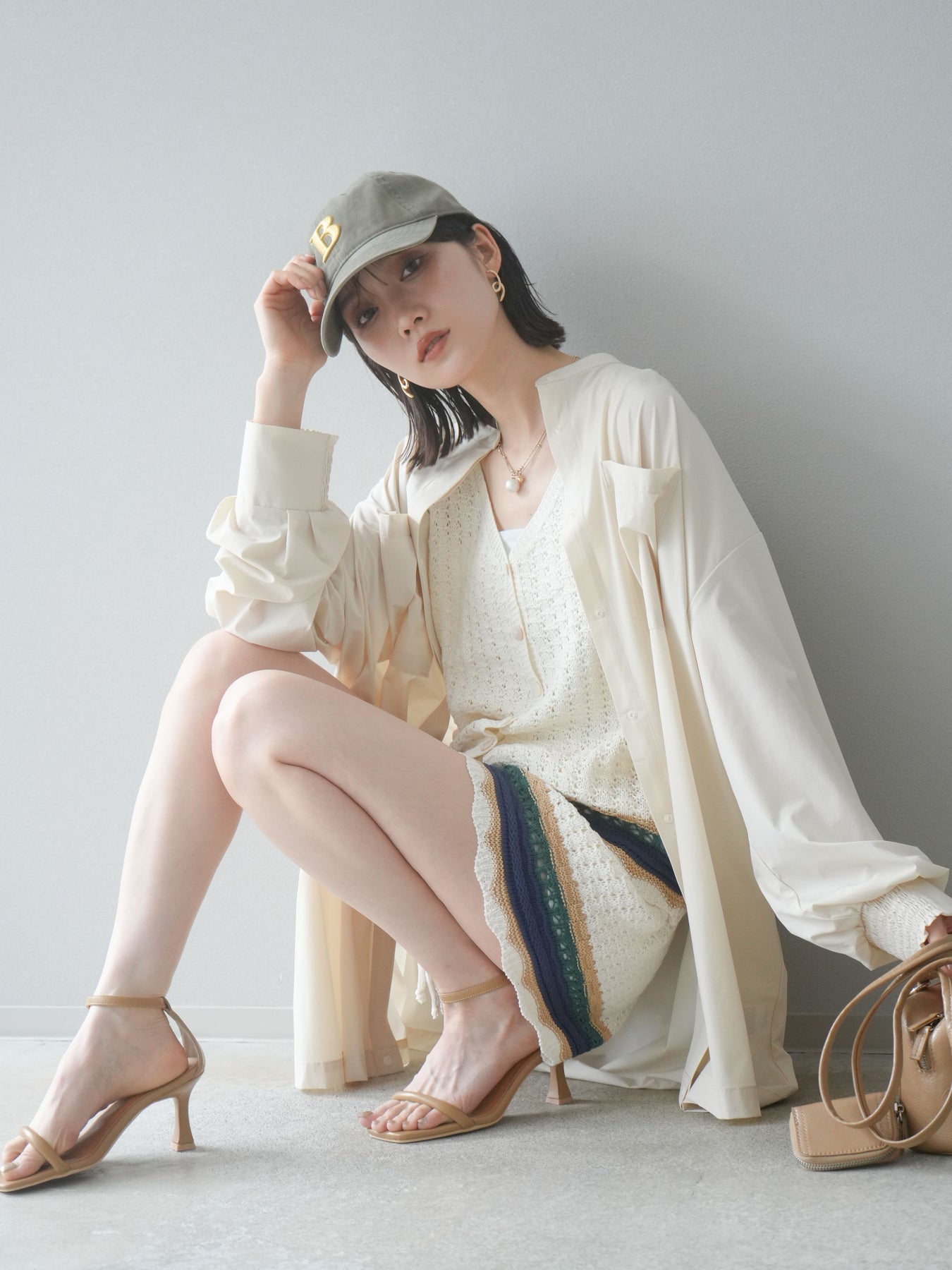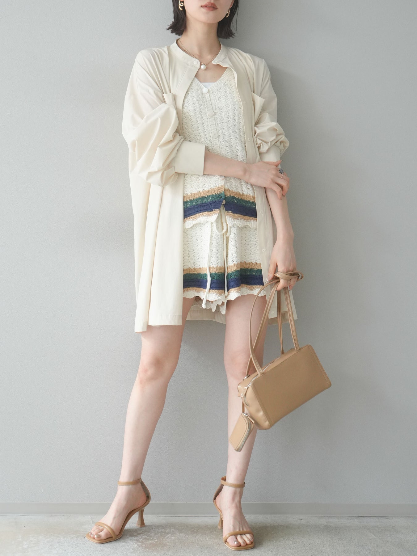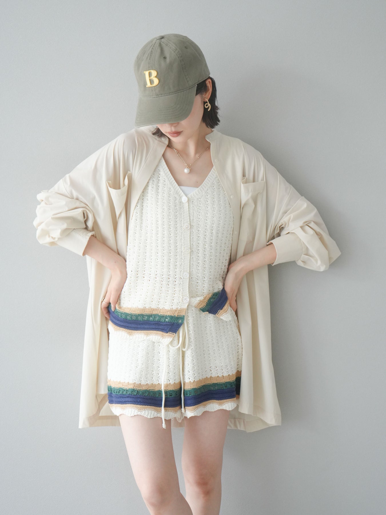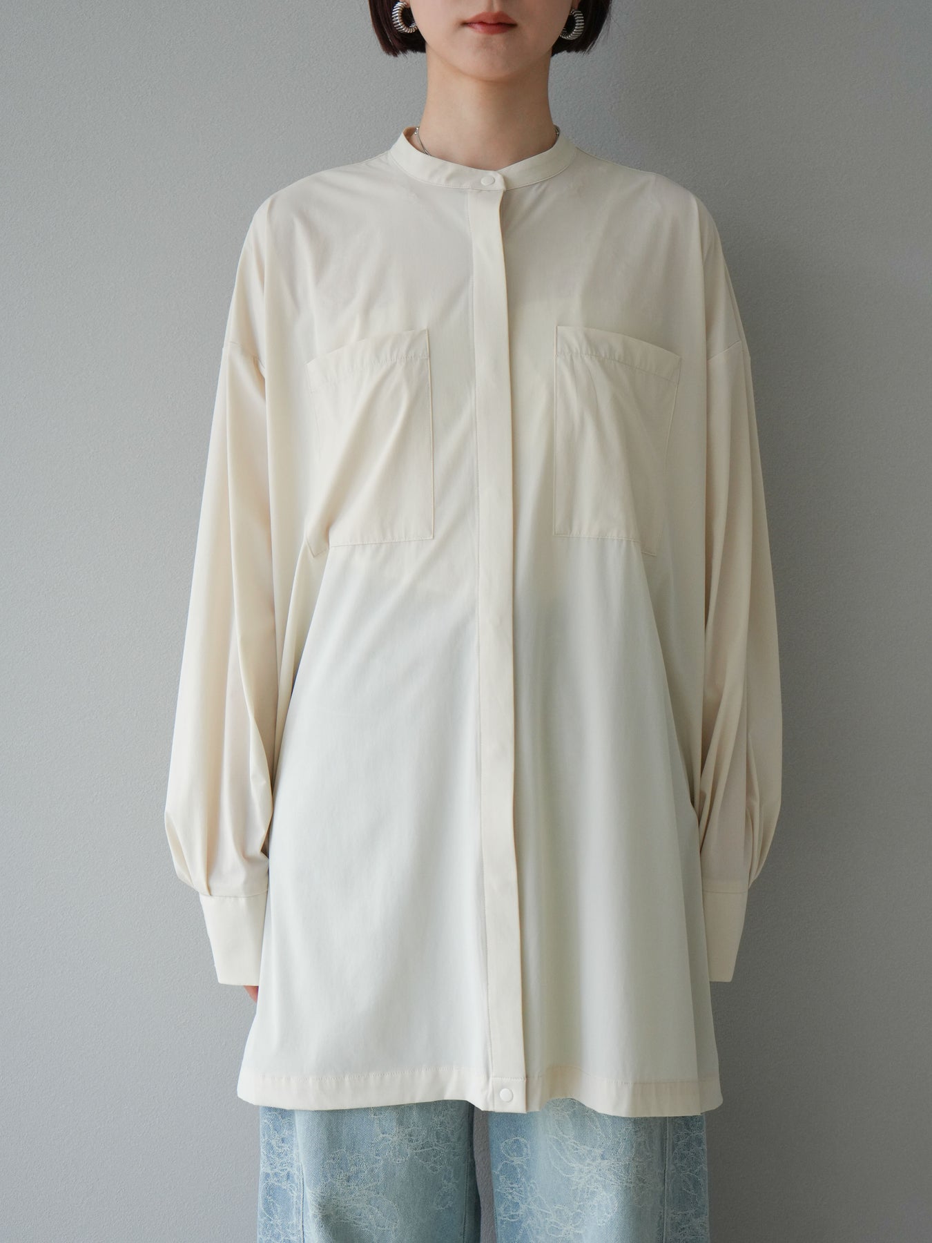 ひんやりとした肌触りが魅力のICE TOUCH素材を使用した、2WAY仕様のオーバーシャツ。さらっとした着心地と軽やかなドレープ感が特徴で、暑い季節も快適に過ごせる一着です。バンドカラーと比翼仕立てのミニマルなデザインで、前後どちらを前にしても着用可能な2WAY仕様。シャツとしてはもちろん、羽織りとしても活躍し、シーズンを通して着回しの幅が広がります。ヒップが隠れる丈感で、体型カバーにも◎。 ※ボトムス、キャミソール(インナー)以外の商品は一律でインナーは付属していません。