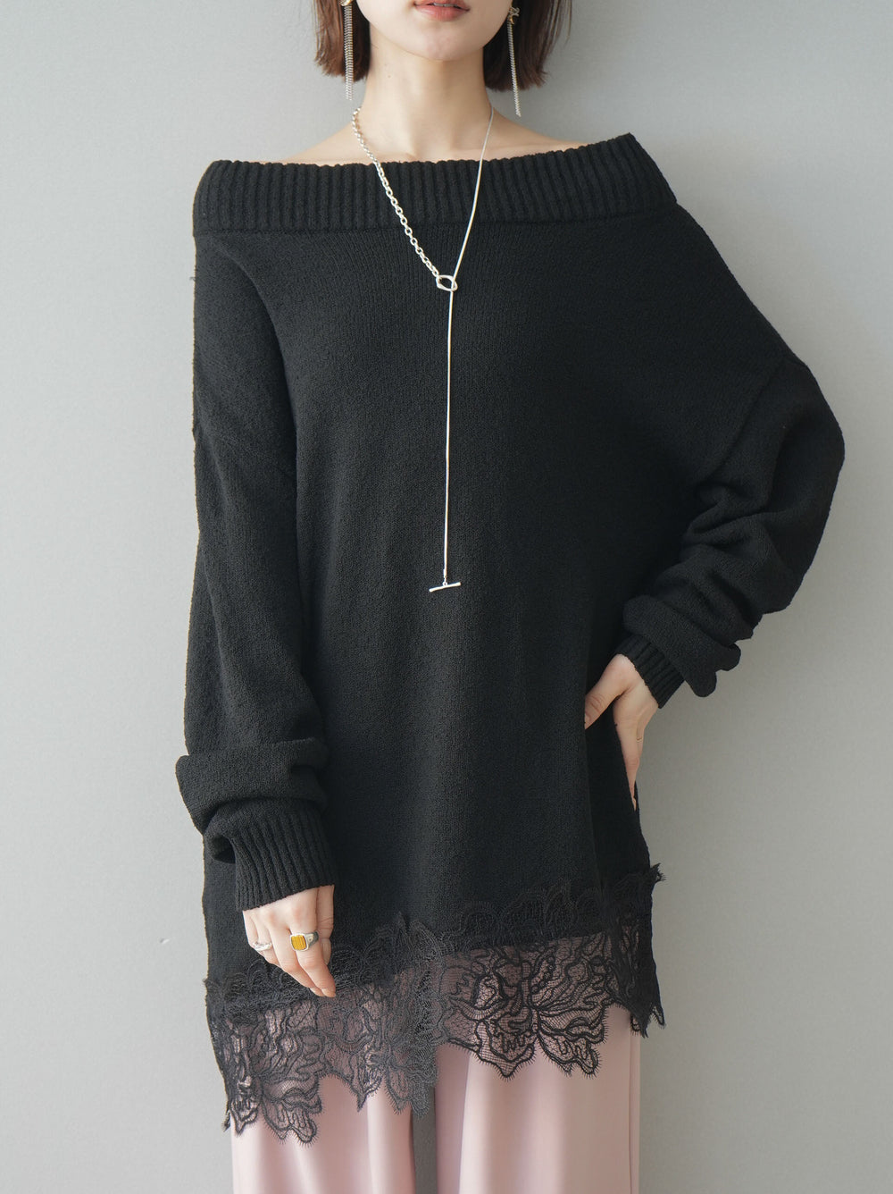 [予約]アシンメトリーレースヘムニットプルオーバー/black