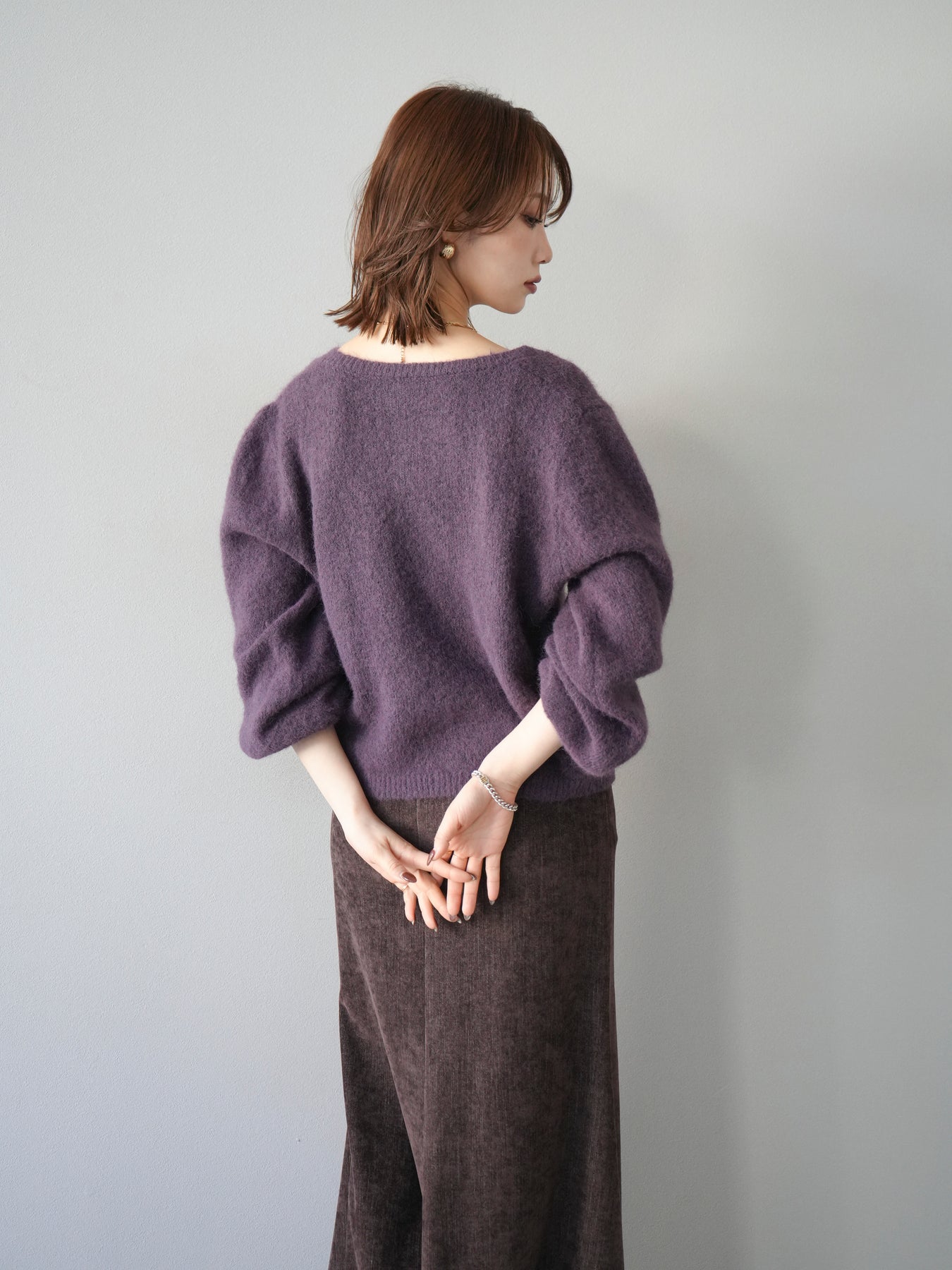柔らかなタッチの起毛ニットを使用したカーディガン。ボリュームスリーブやゴールドボタンがアクセントになり、1枚で女性らしい印象に仕上がります。フロントを閉じてプルオーバー風にも、開けて羽織りとしても着用でき、着こなしの幅が広がる1着。