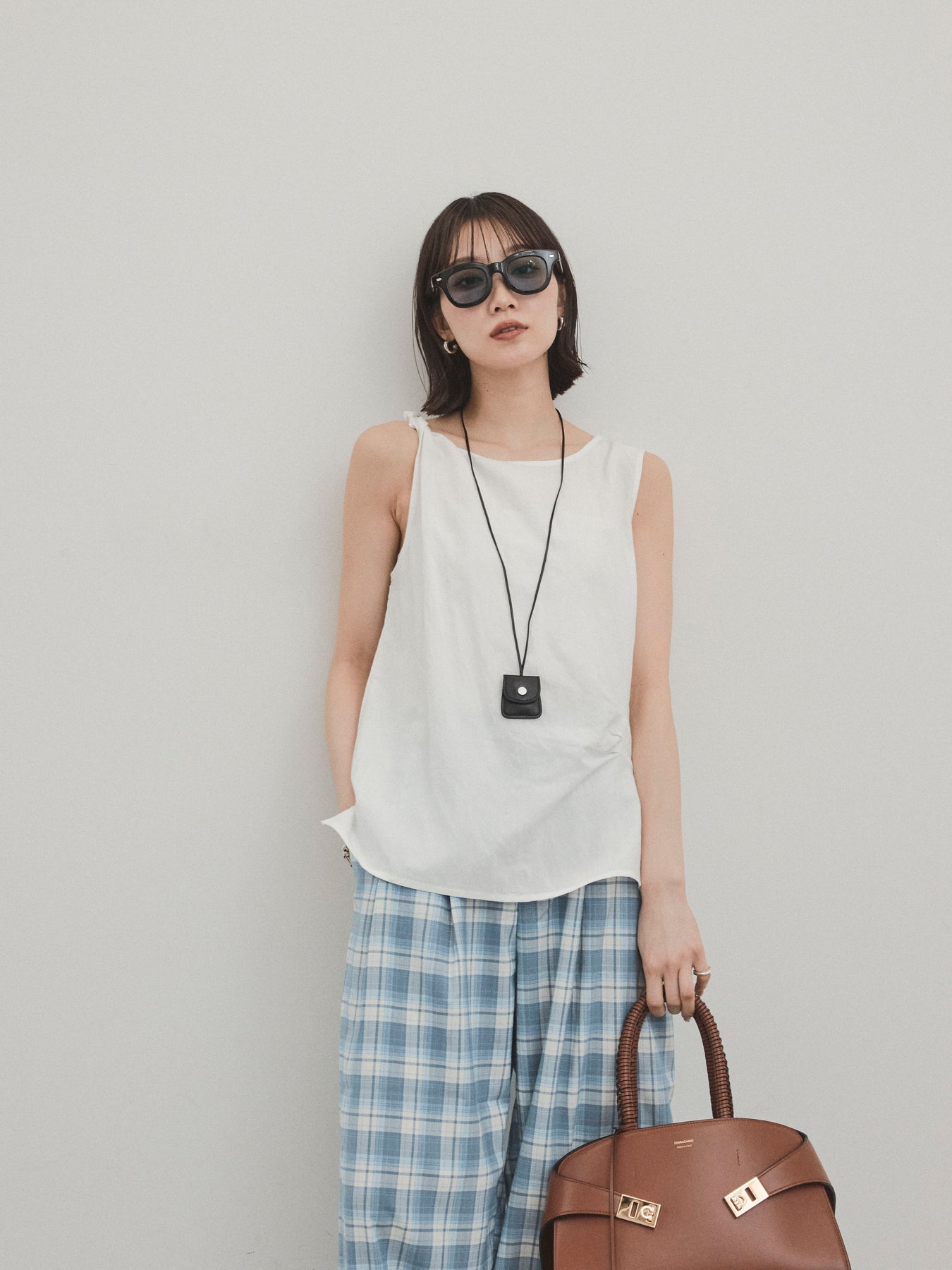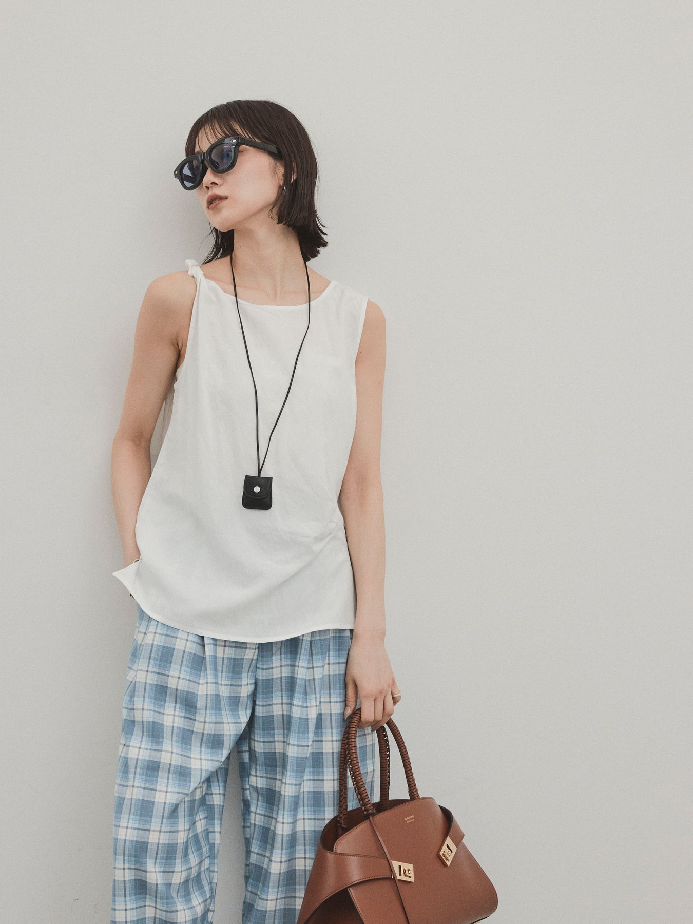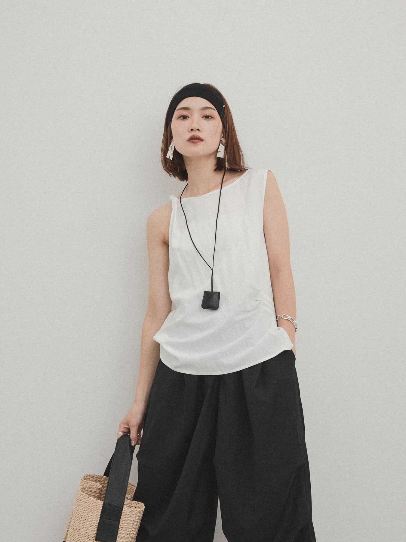肩のツイストデザインが印象的な、洗練された雰囲気を纏うノースリーブブラウス。 ドライタッチな素材感で、暑い季節にも心地よく着用できる軽やかな一枚です。 シンプルな中にもひねりを効かせたツイストディテールが、スタイリングに奥行きをプラス。 セットのレザーネックレスは取り外し可能で、気分やコーデに合わせてアレンジを楽しめます。 ワイドパンツやデニムとの相性はもちろん、スカートと合わせれば女性らしい印象に。 一枚でサマになる、旬なムード漂う万能トップスです。