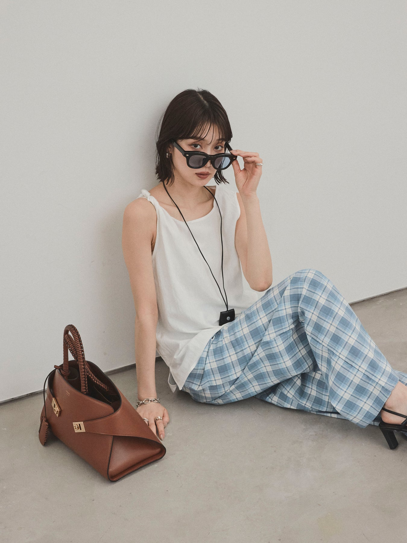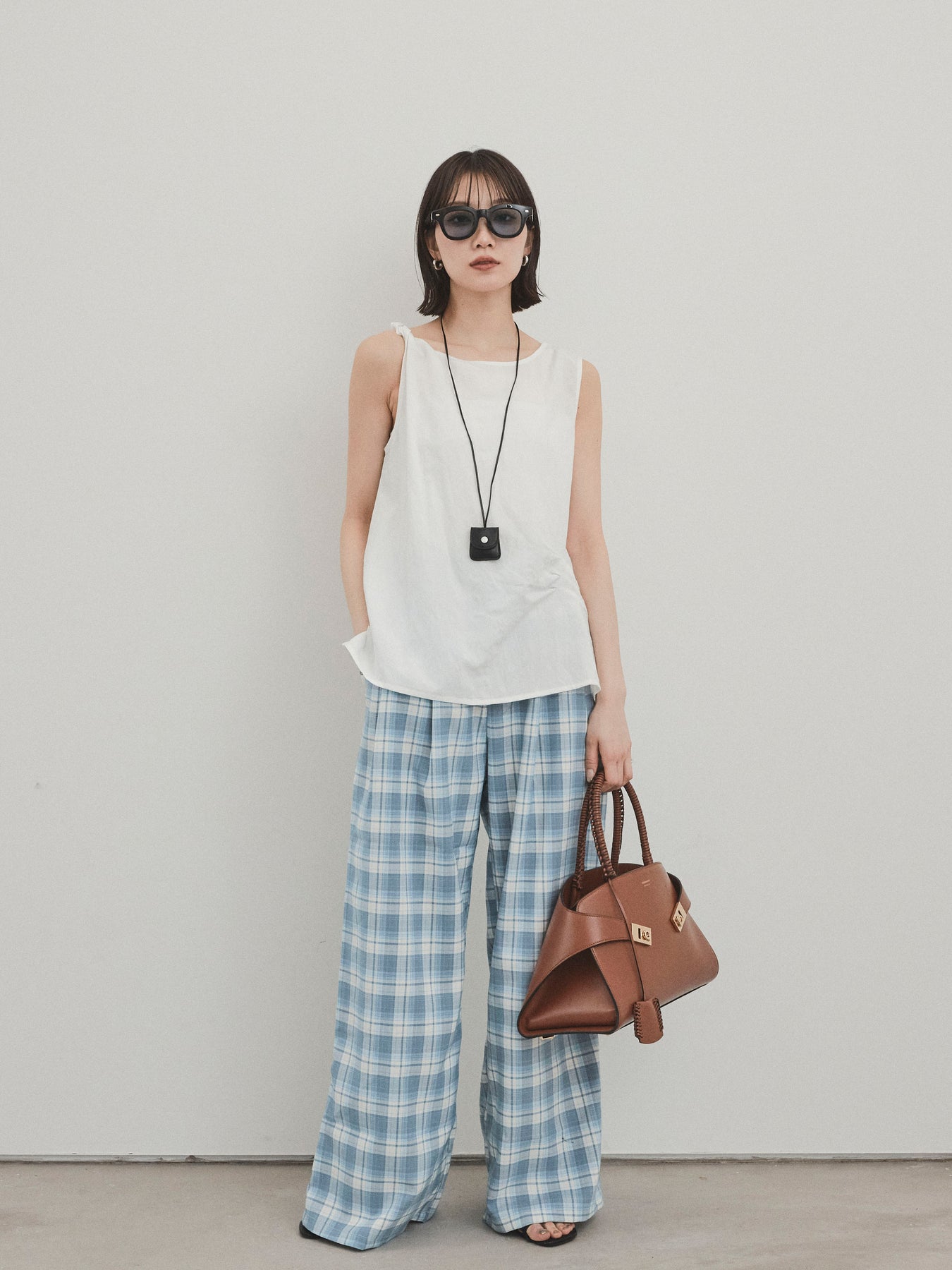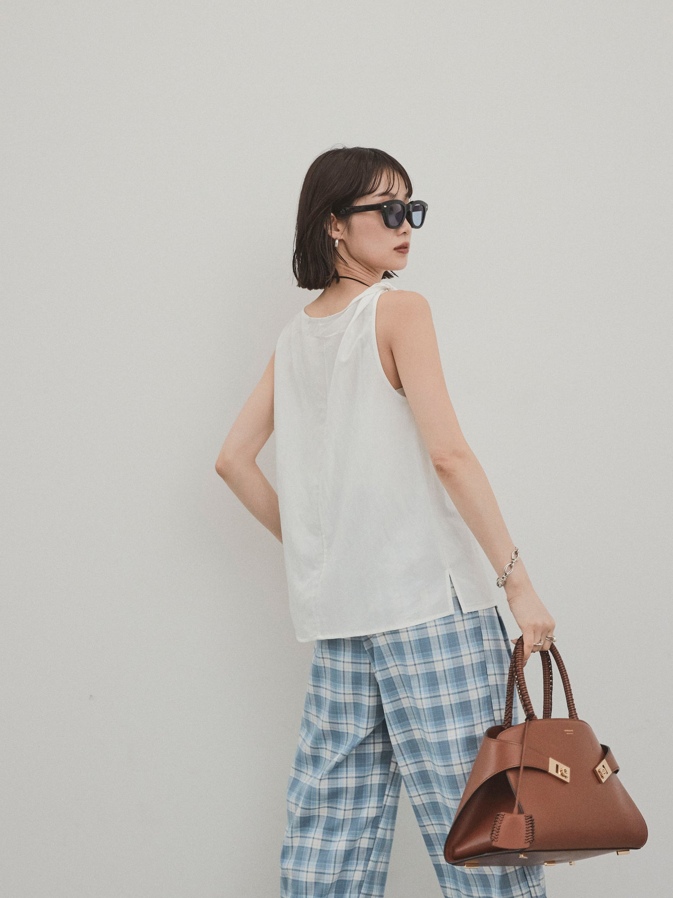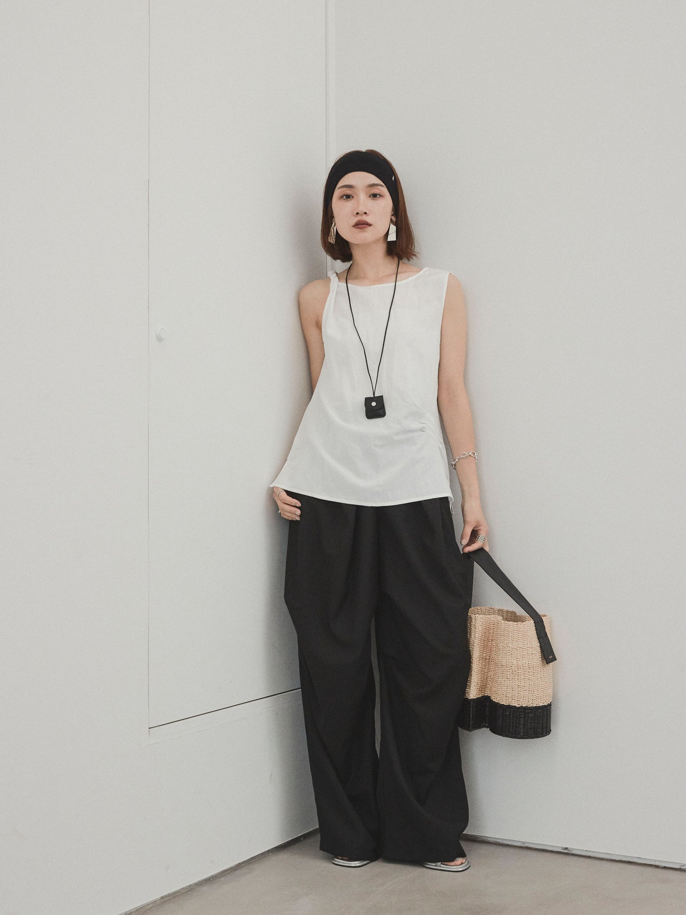 肩のツイストデザインが印象的な、洗練された雰囲気を纏うノースリーブブラウス。 ドライタッチな素材感で、暑い季節にも心地よく着用できる軽やかな一枚です。 シンプルな中にもひねりを効かせたツイストディテールが、スタイリングに奥行きをプラス。 セットのレザーネックレスは取り外し可能で、気分やコーデに合わせてアレンジを楽しめます。 ワイドパンツやデニムとの相性はもちろん、スカートと合わせれば女性らしい印象に。 一枚でサマになる、旬なムード漂う万能トップスです。