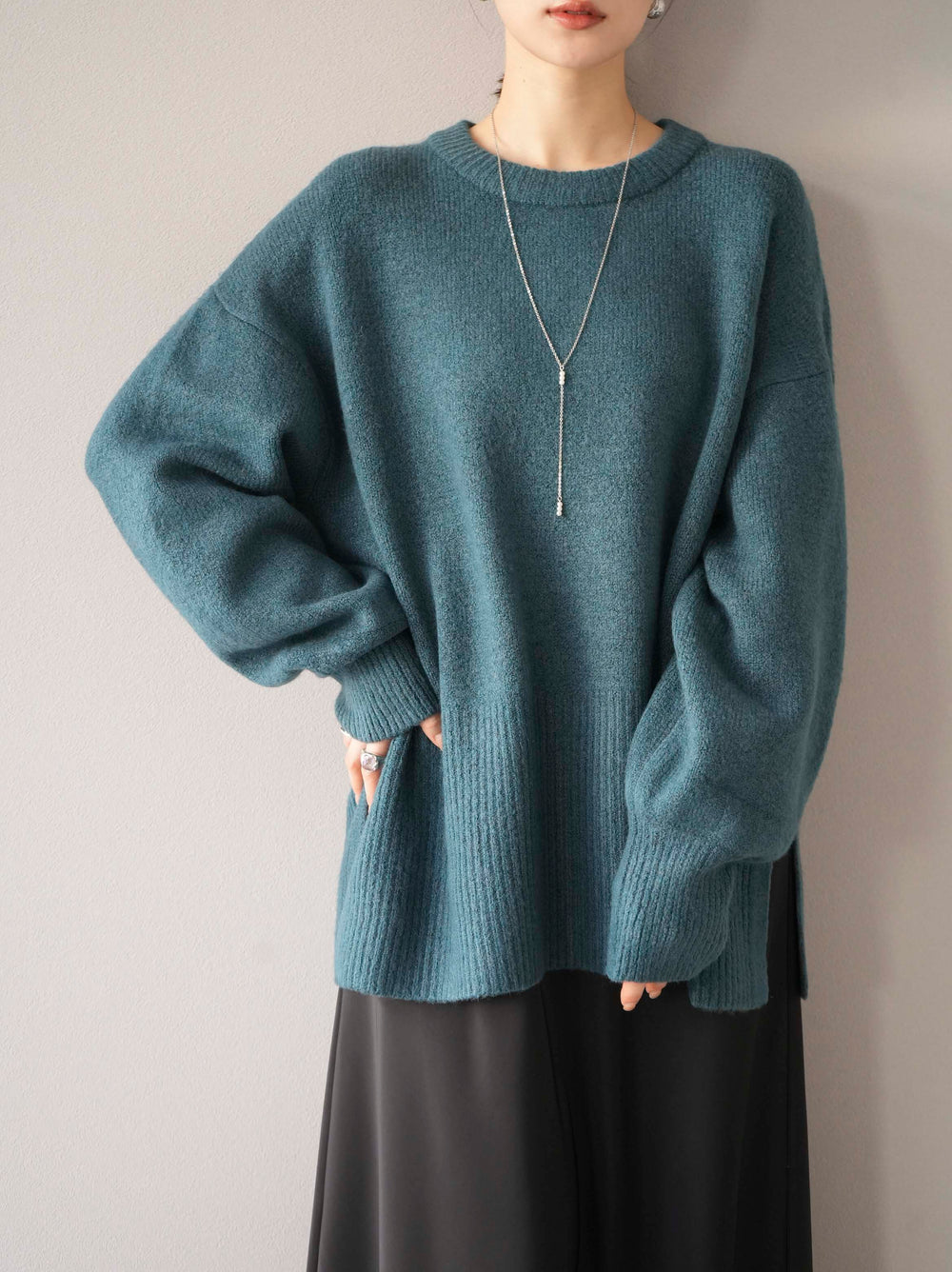 [予約]サイドスリットクルーネックニットプルオーバー/ブルーグリーン