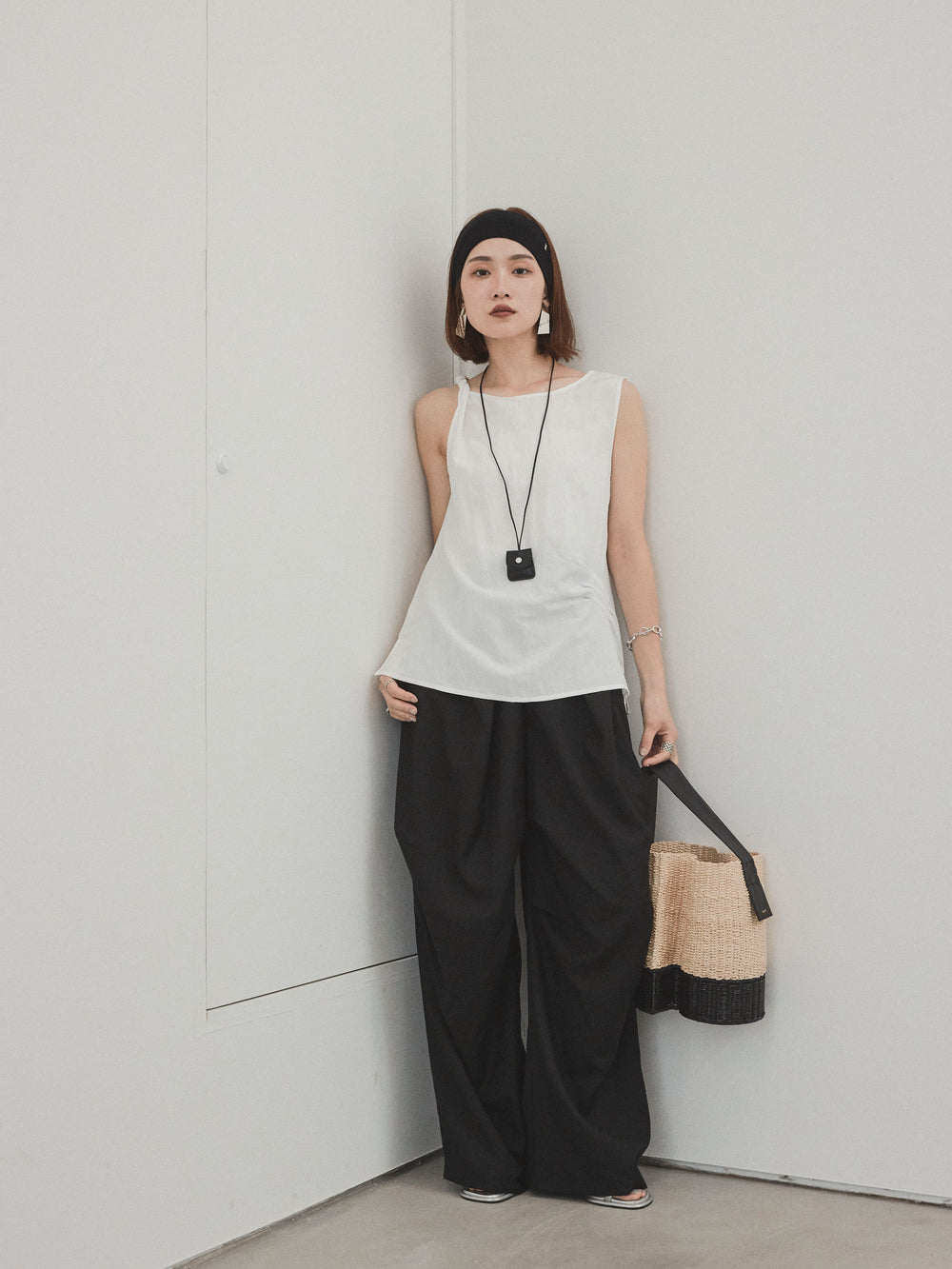 [SET]レザーネックレス付ツイストノースリブラウス+デザインループサイドタックパンツ(2set)