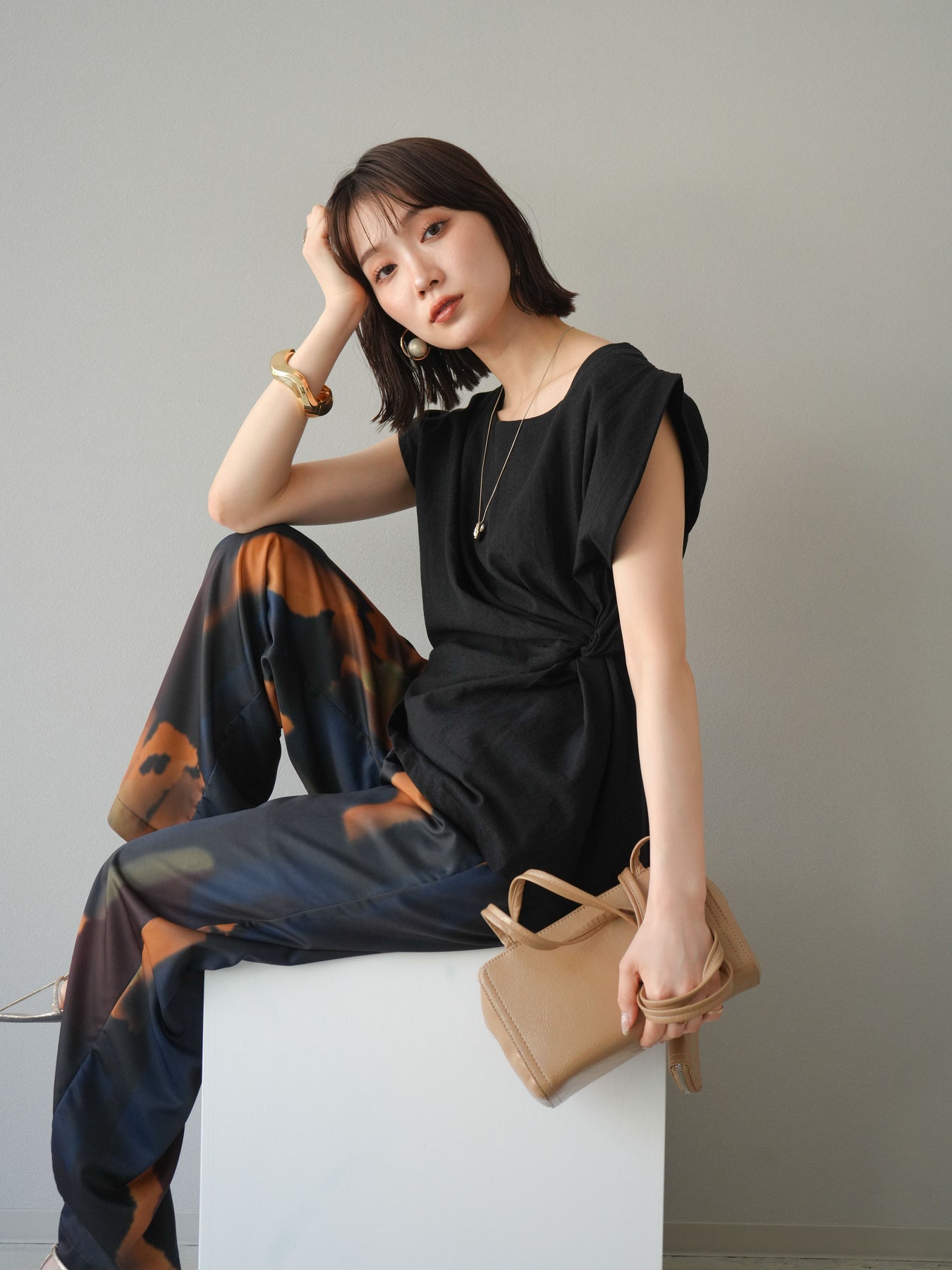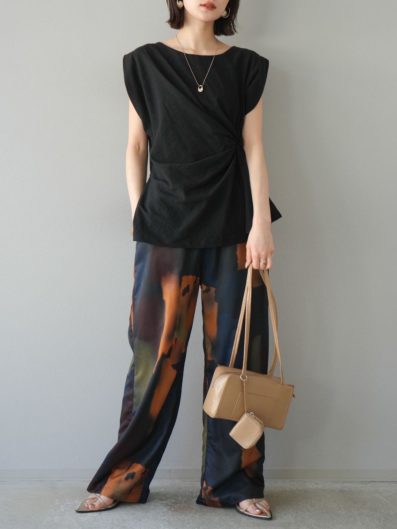 ウエスト部分のツイストデザインがアクセントになった、サイドツイストフレンチトップス。立体感のあるディテールで、シンプルながらも着映えする一枚に仕上がっています。程よく肩を覆うフレンチスリーブが、二の腕をすっきりと見せつつ、きちんと感も演出。柔らかな素材で着心地も良く、デイリーに活躍します。パンツにもスカートにも合わせやすく、タックイン・アウトどちらでもバランスよく決まる万能アイテムです。 ※ボトムス、キャミソール(インナー)以外の商品は一律でインナーは付属していません。