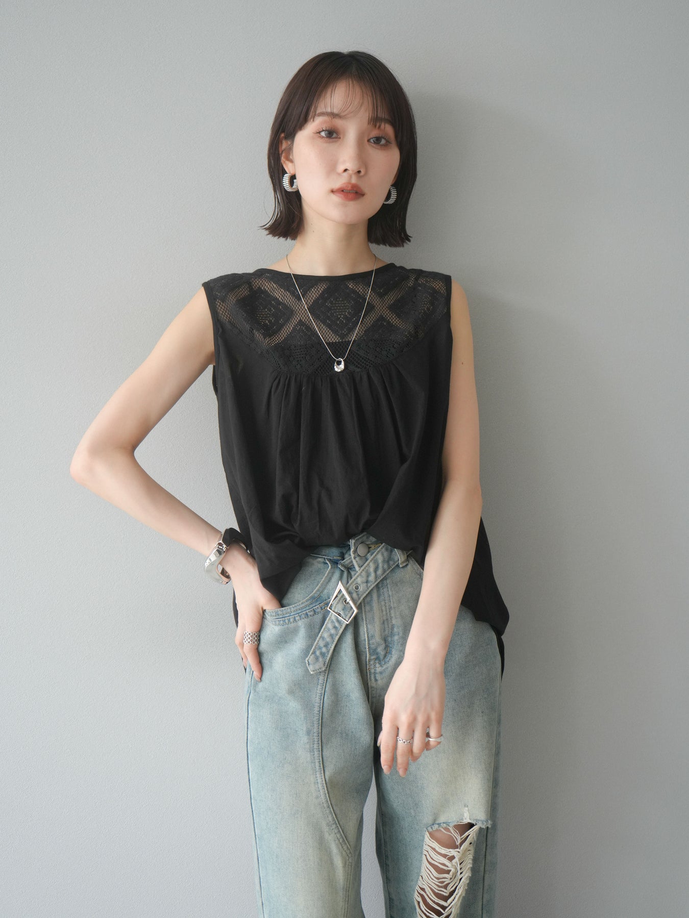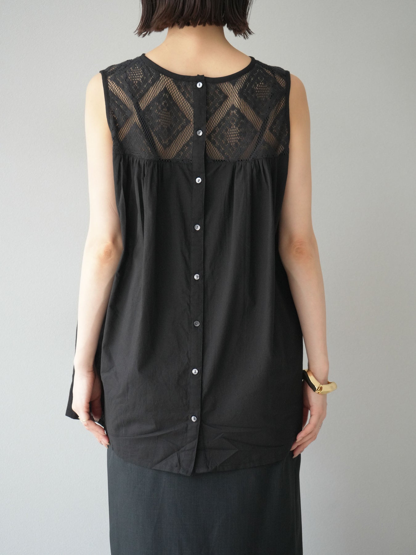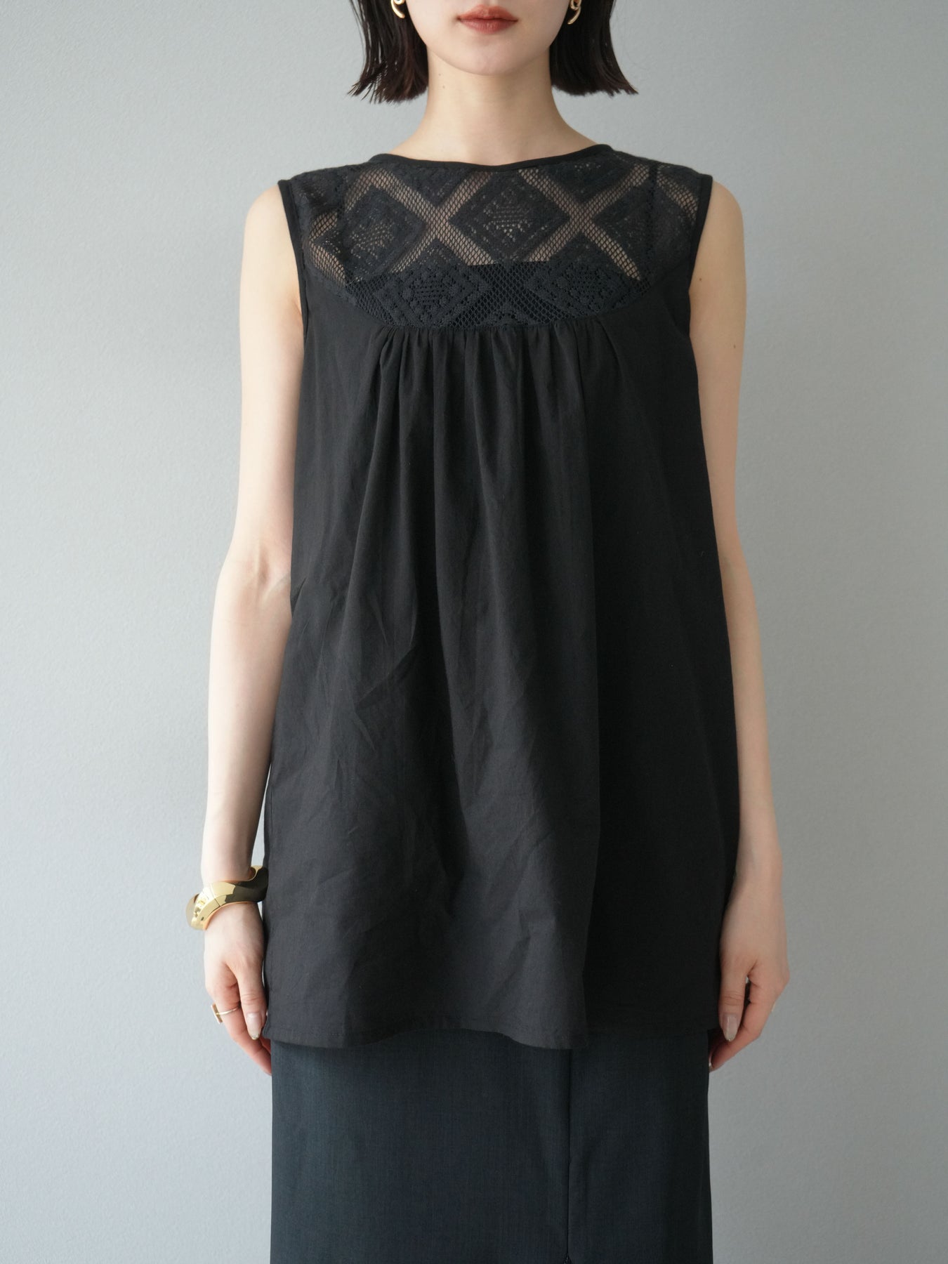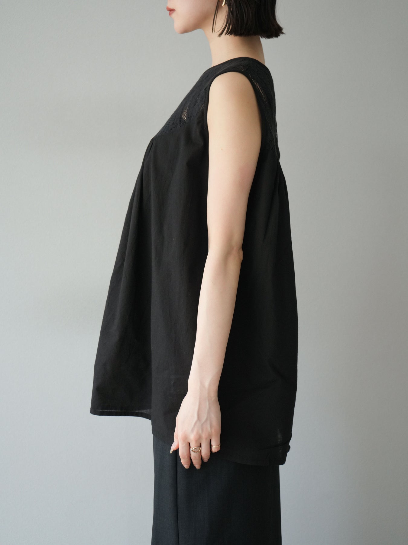 [予約]インド製コットンレース切替ノースリブラウス/ブラック